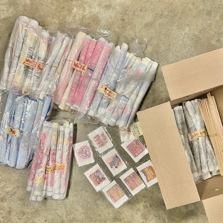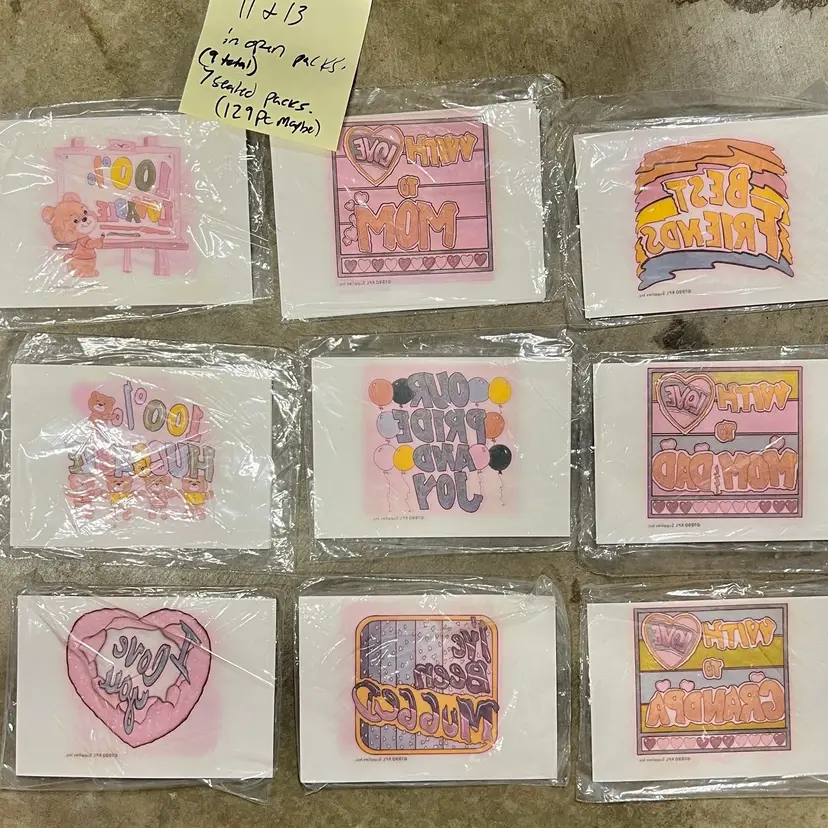 Item info: 82 total wall banners, thin fabric material, in 6 variations 100+ (Possibly 129 ish) smaller 90s transfers. 9 packs total of these, 2 are open and have 11 & 13 respectively, leading me to believe the unopened packs are of 15.. but cannot be for certain, hence the “ish” number. They’re a parchment paper like consistency. Ships from NC. Boxed, the lot weighs 11lb 4oz.