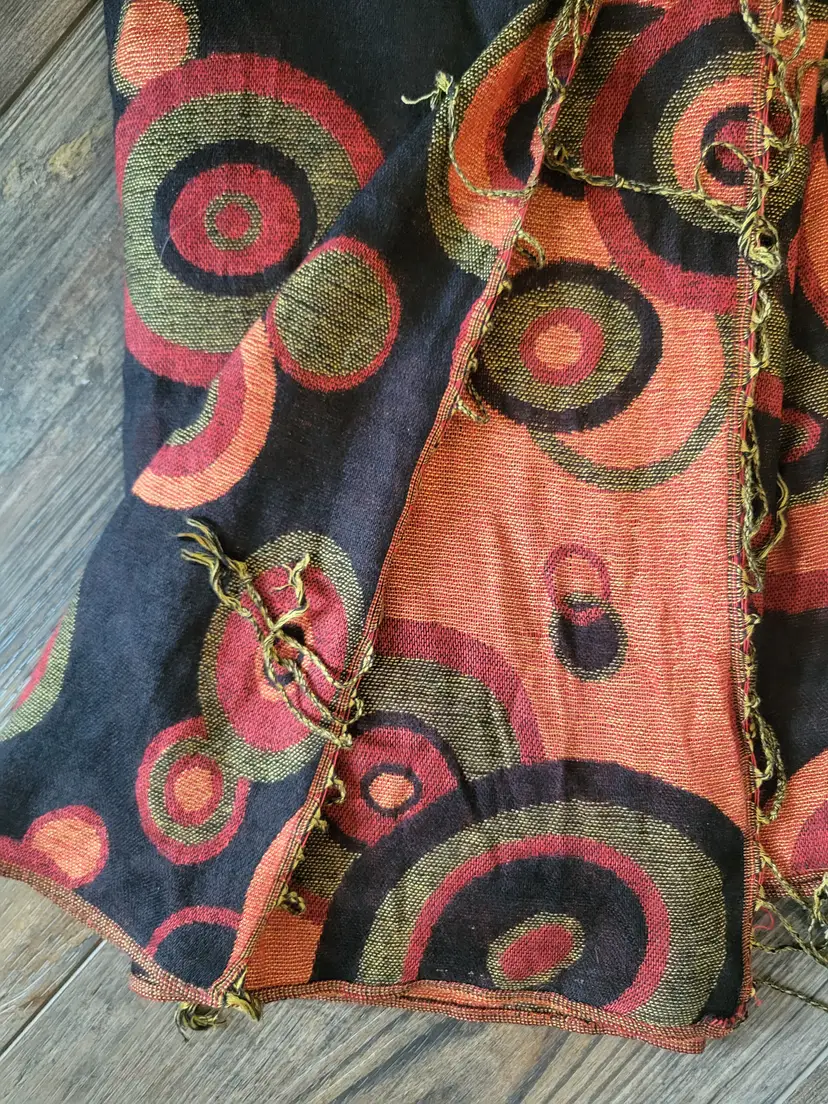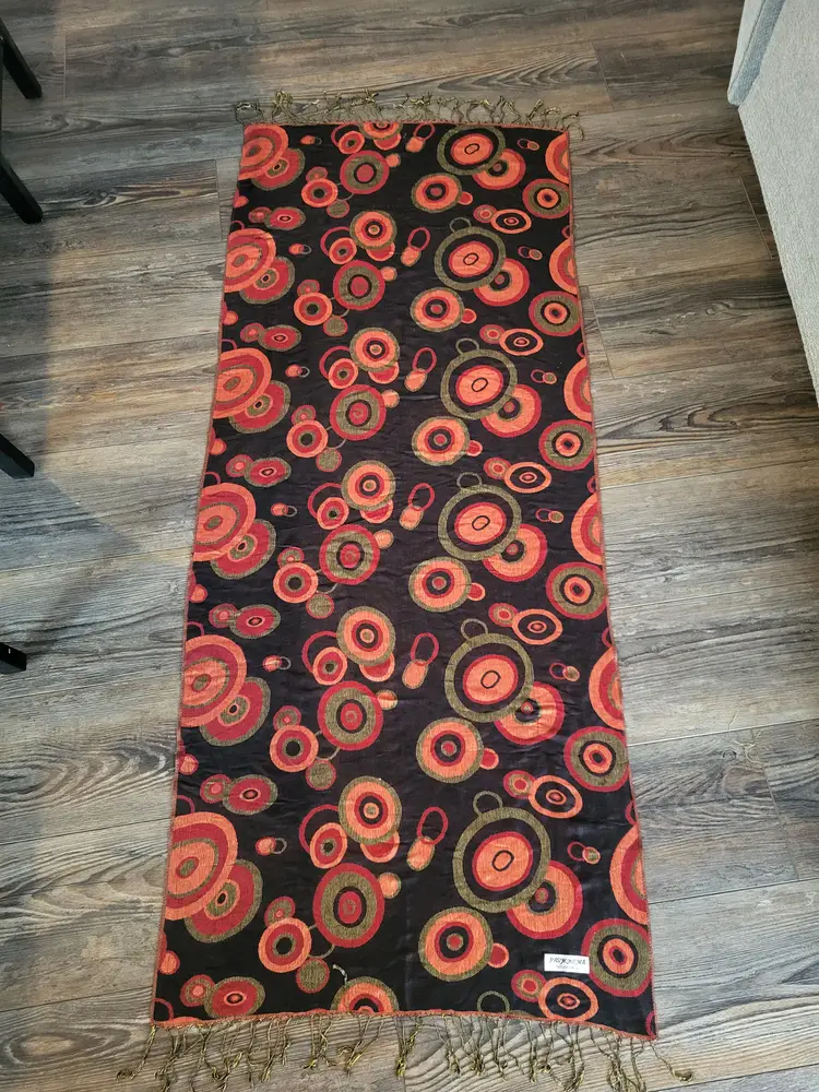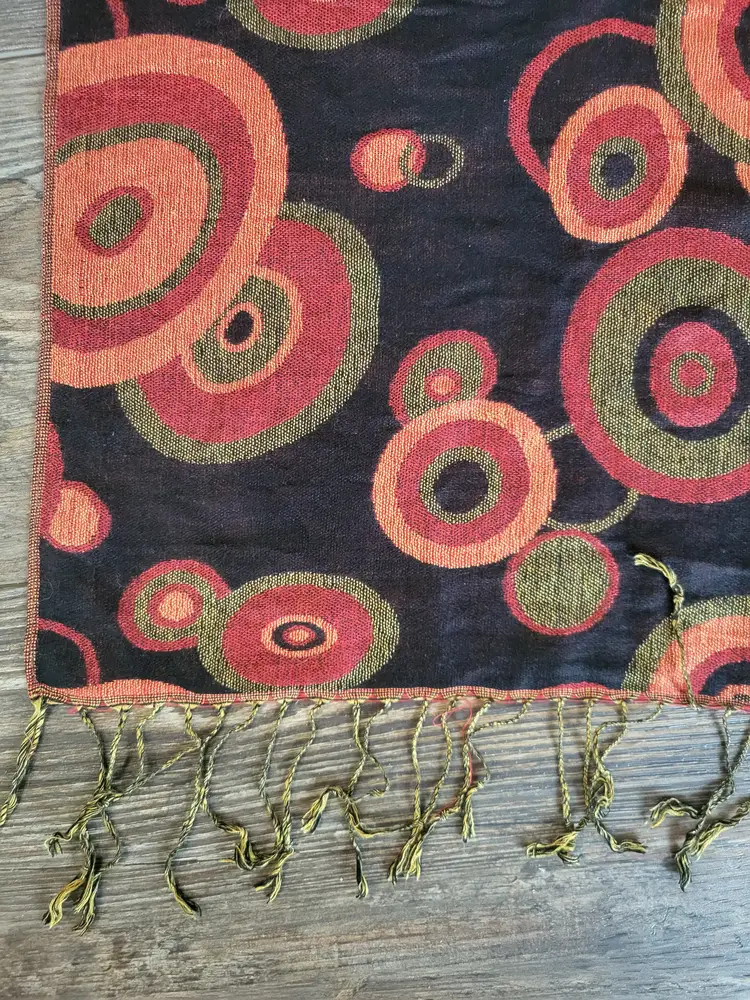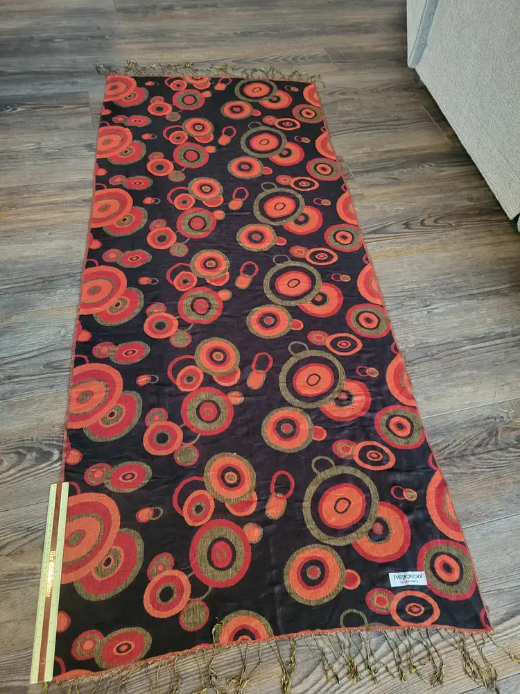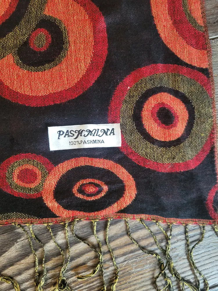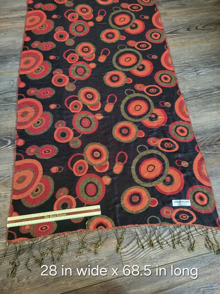 Great shape pashmina scarf, geometric circle design. Scarf has fringe at both ends. There are 2 small snags shown in pictures, not noticeable. See pictures for measurements. Shipping cost is based on your location, size and weight of box item is shipped in. If you feel shipping cost is to high let me know what your zip code is and I can see if there is a cheaper option. Shipping is done by USPS, I choose cheapest option when listing but shipping will be USPS. I do combine shipping if you buy more than one item from my store. Any questions please do not hesitate to ask.