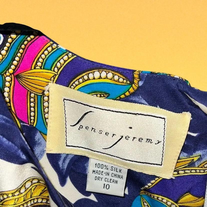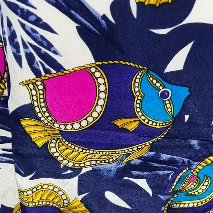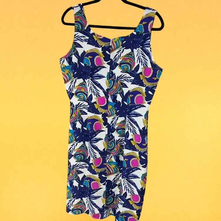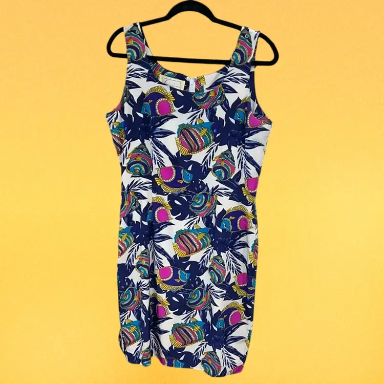 100% silk fish pattern silk sheath sleeveless dress. Lined. Invisible zipper. PTP: 20” 38”L