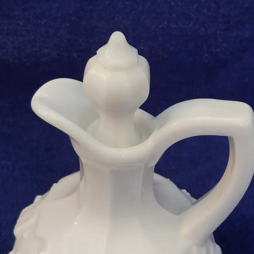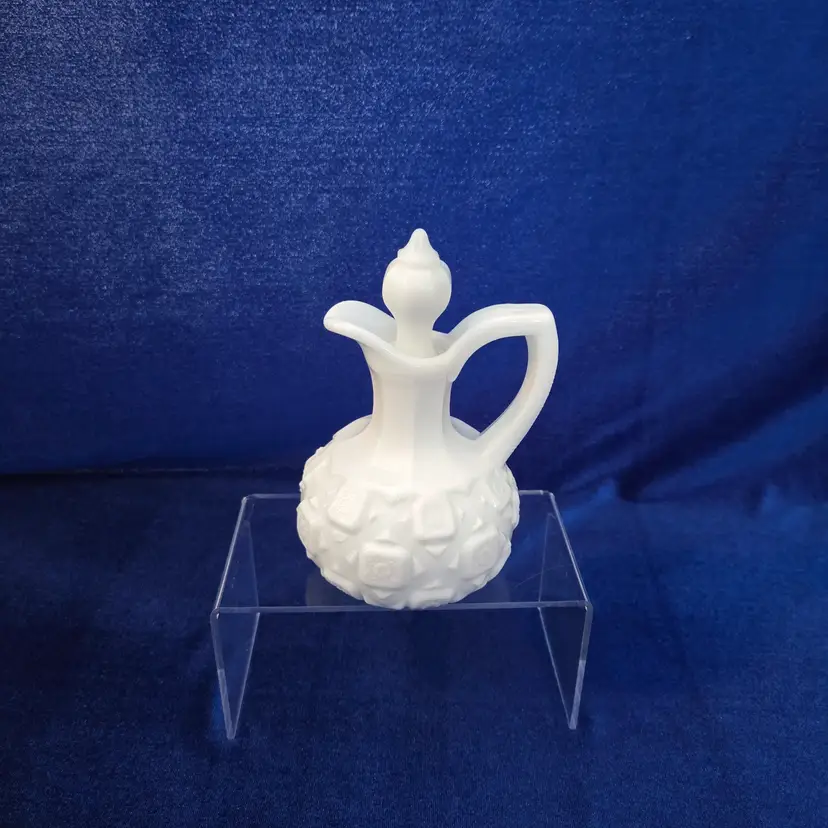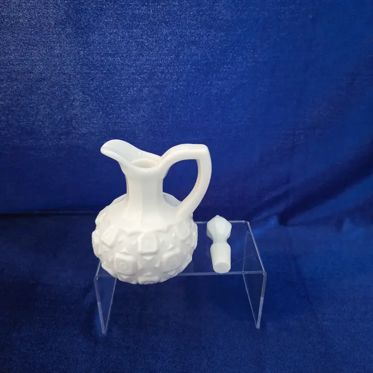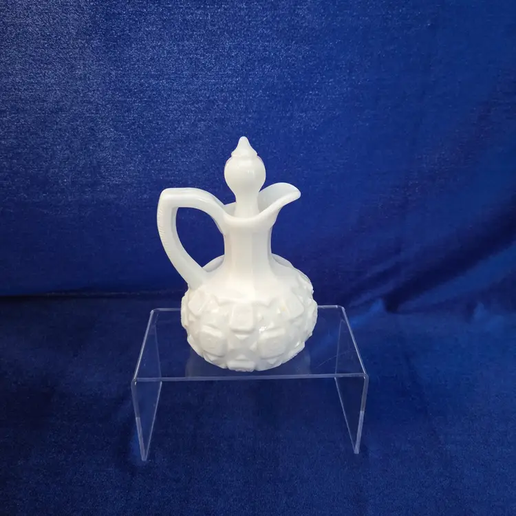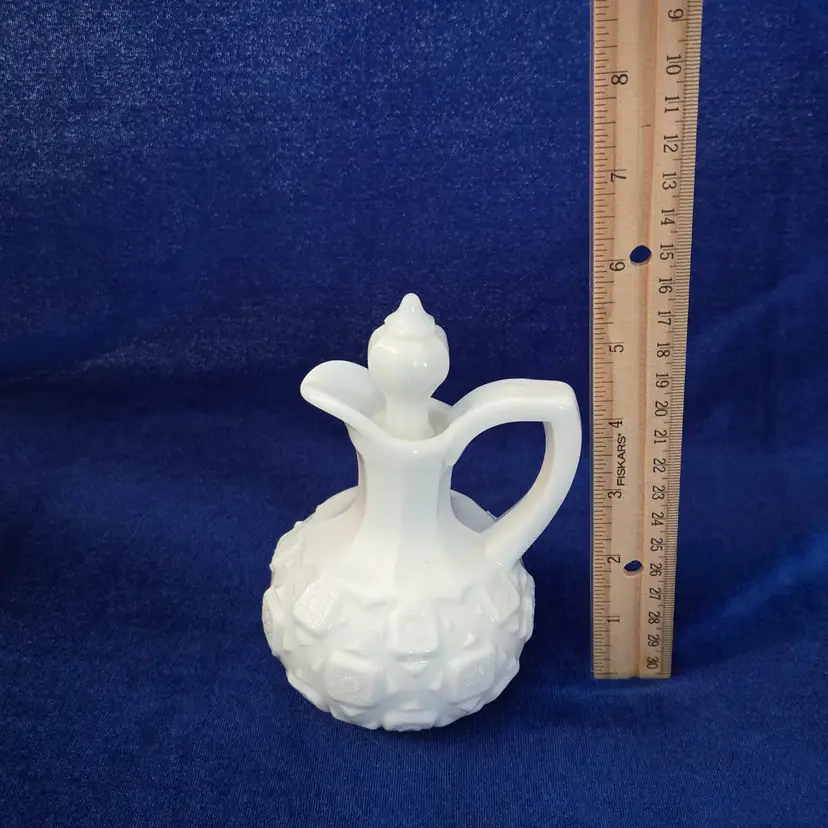 Pretty cruet. Nice pattern. Unmarked but found on WM site. Stopper has fleabites around the base; unable to see when in the cruet. Otherwise, no chips, cracks, or repairs. See pics for dimensions.
