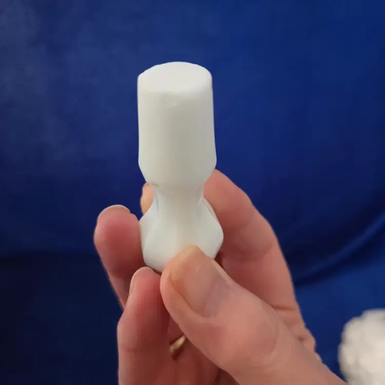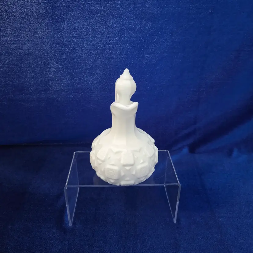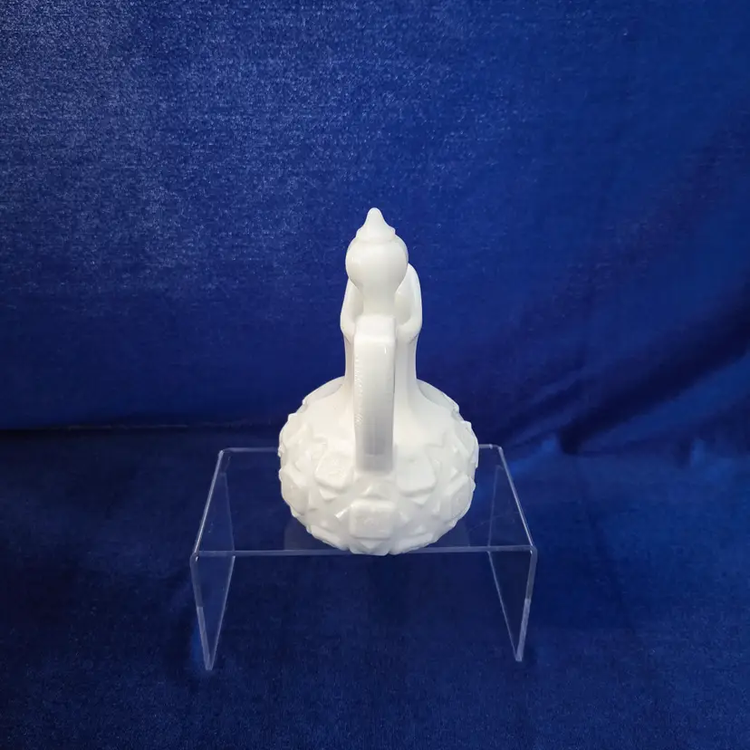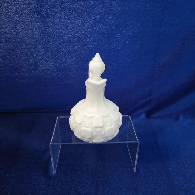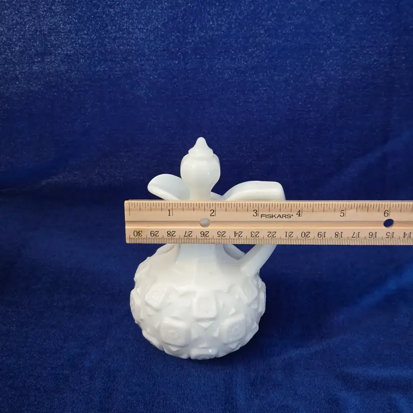 Pretty cruet. Nice pattern. Unmarked but found on WM site. Stopper has fleabites around the base; unable to see when in the cruet. Otherwise, no chips, cracks, or repairs. See pics for dimensions.
