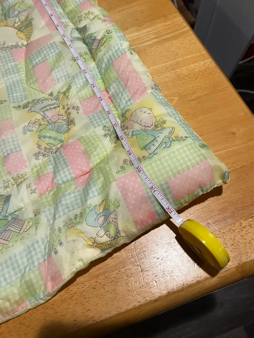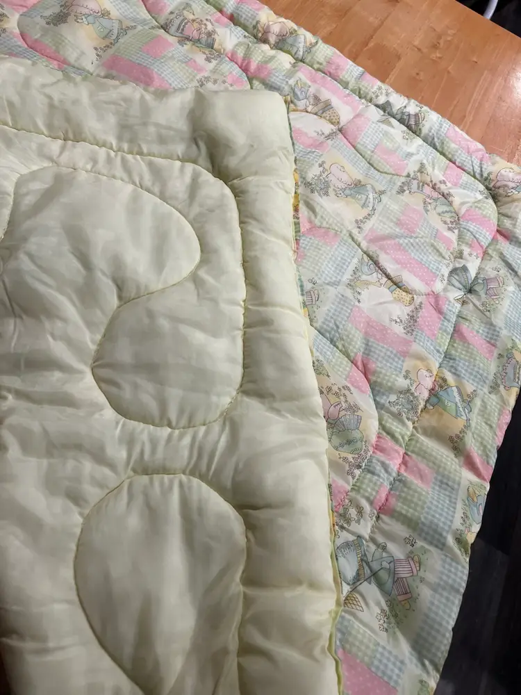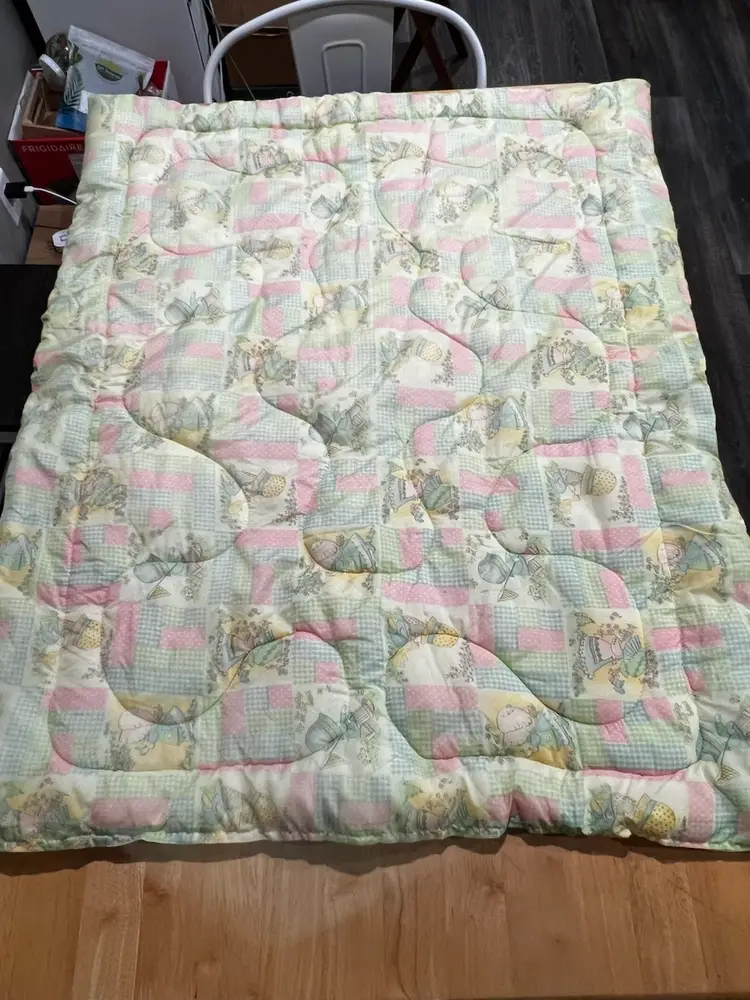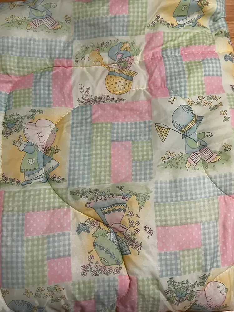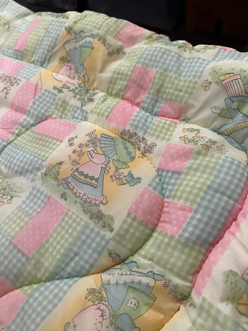 Vintage Quilted Baby Blanket 32" x 40" Yellow, Pink & Blue Holly Hobby Print, Gingham & Polka Dots In very good condition, no rips, tears or stains