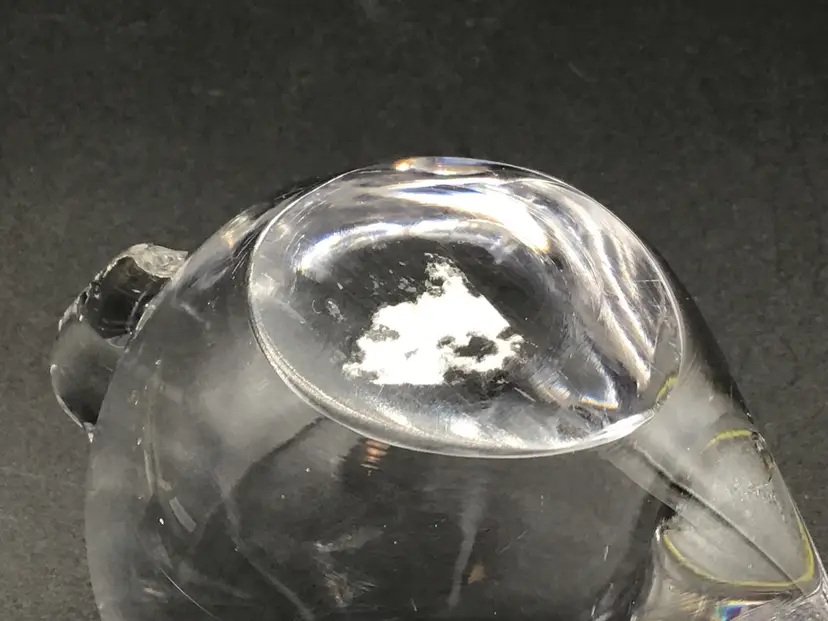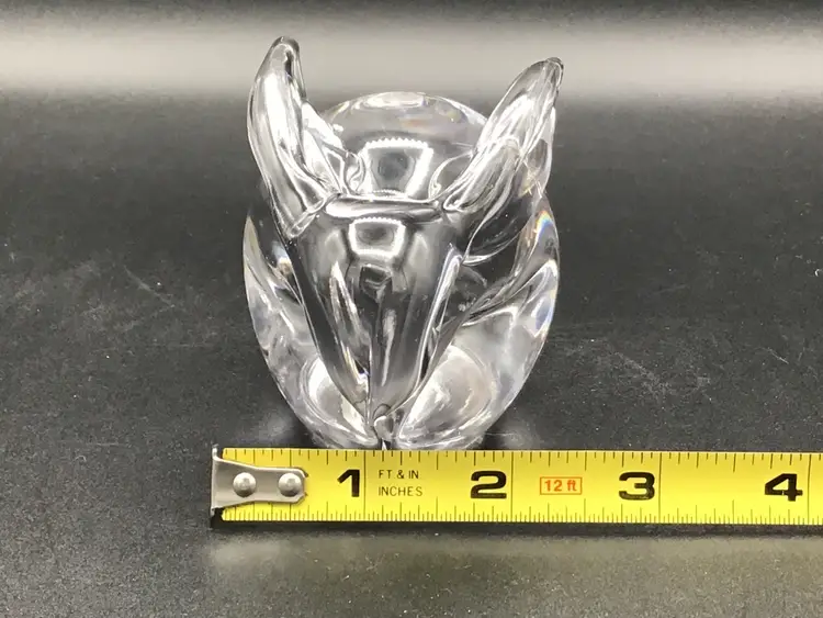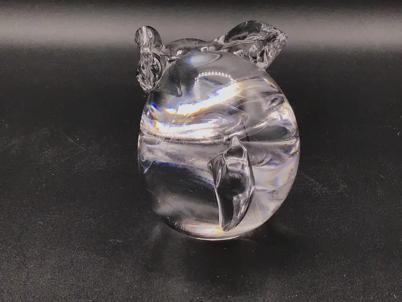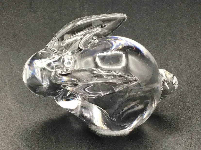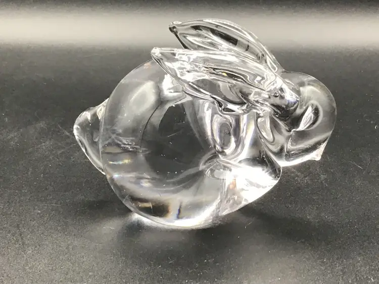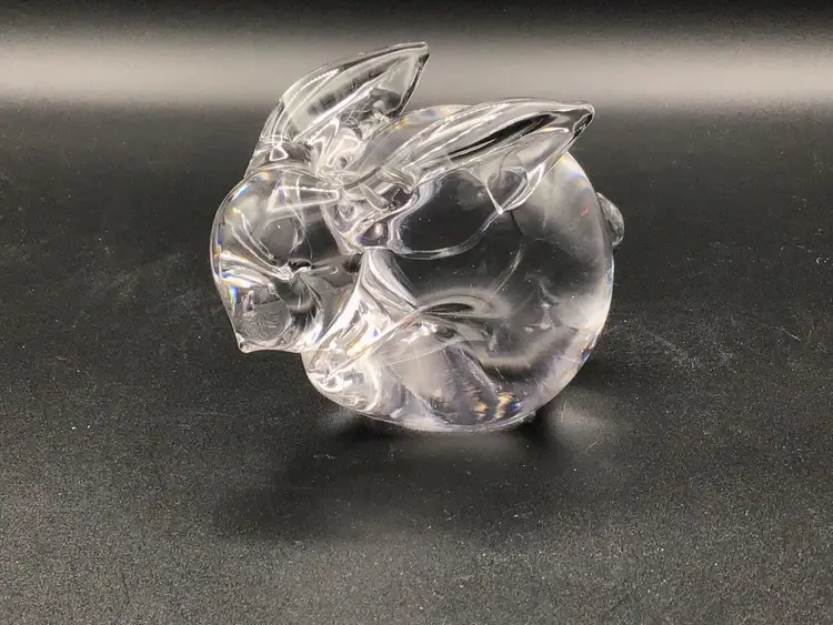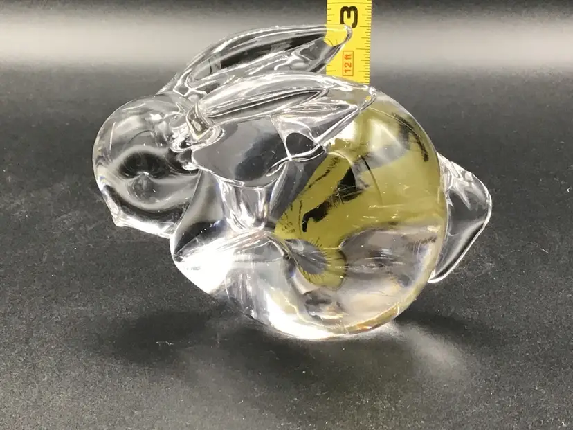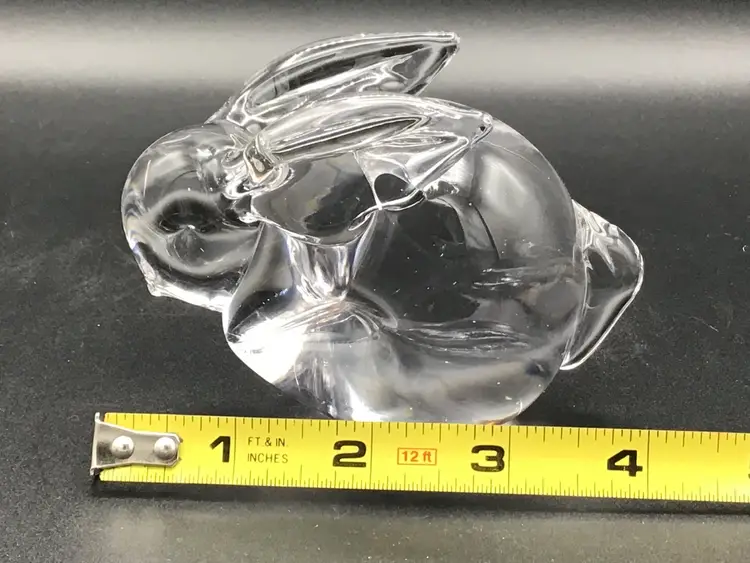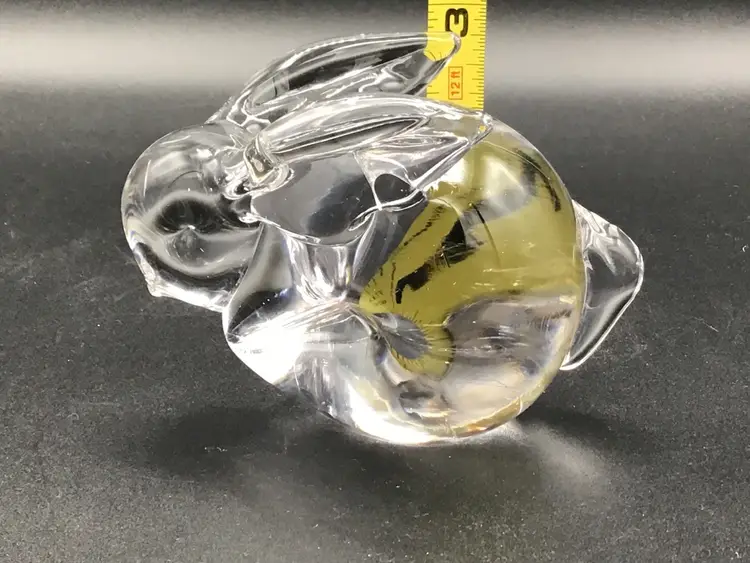 This cute little bunny paper weight is approximately 4 inches long, 2 3/4 inches tall and approximately 2 inches wide. There is the remnants of a sticker on the bottom, but no makers mark. There are no chips, cracks, or flea bites. Please see pictures for a complete description, measurements and condition.