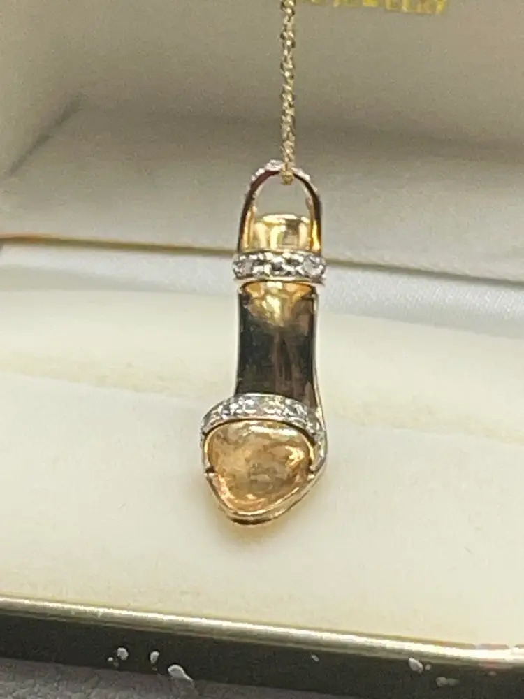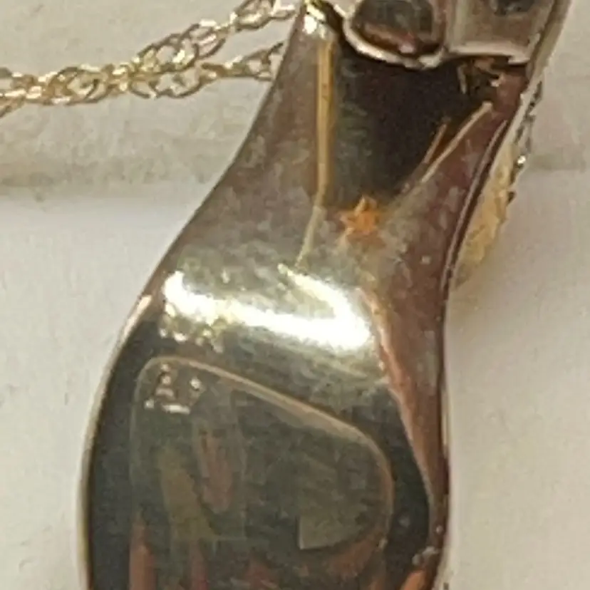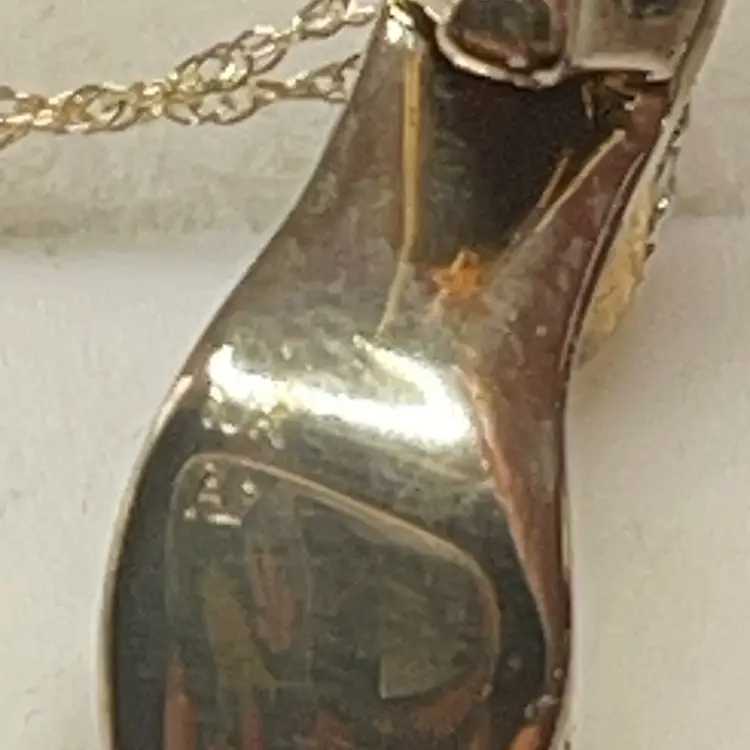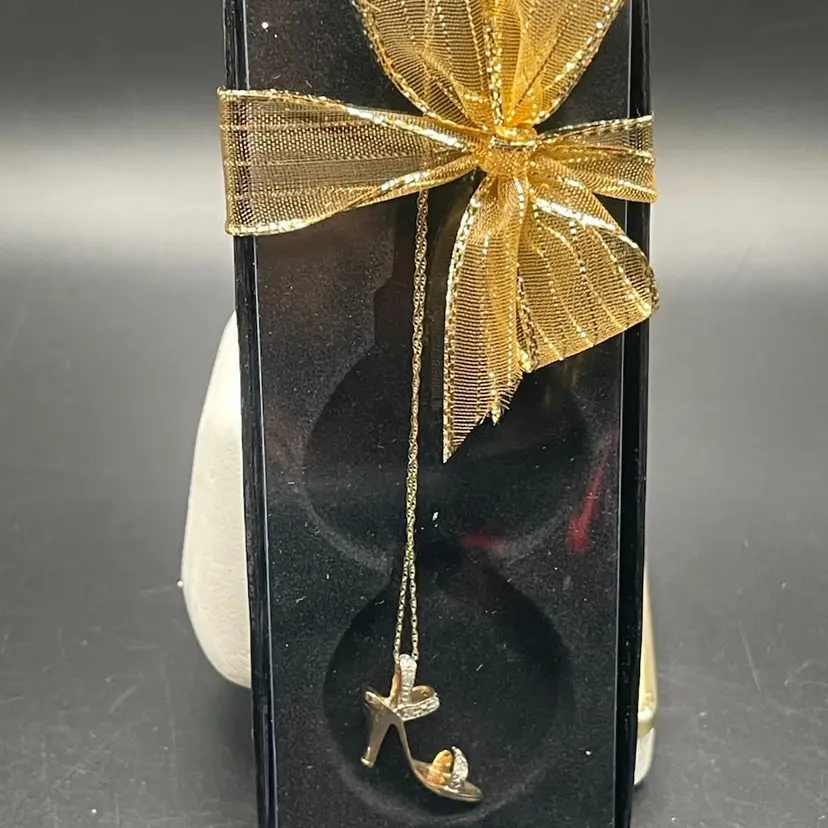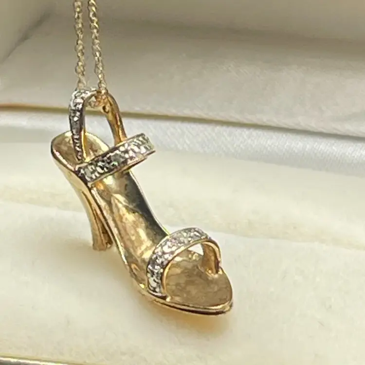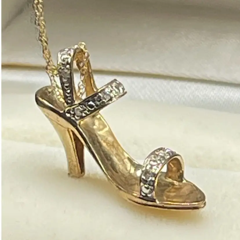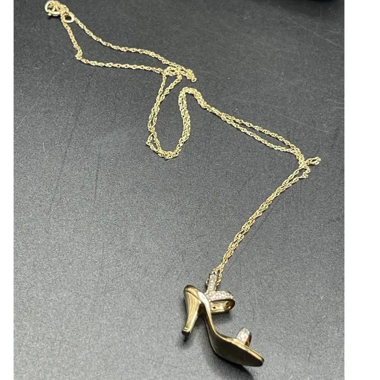 ✨ Details: • Material: Marked 10K gold (tests closer to 14K on gold tester) • Stones: Diamond accents across toe and ankle straps • Pendant Style: Dimensional stiletto/high heel shoe charm • Chain Length: 16” • Marks: Both pendant and chain marked 10K