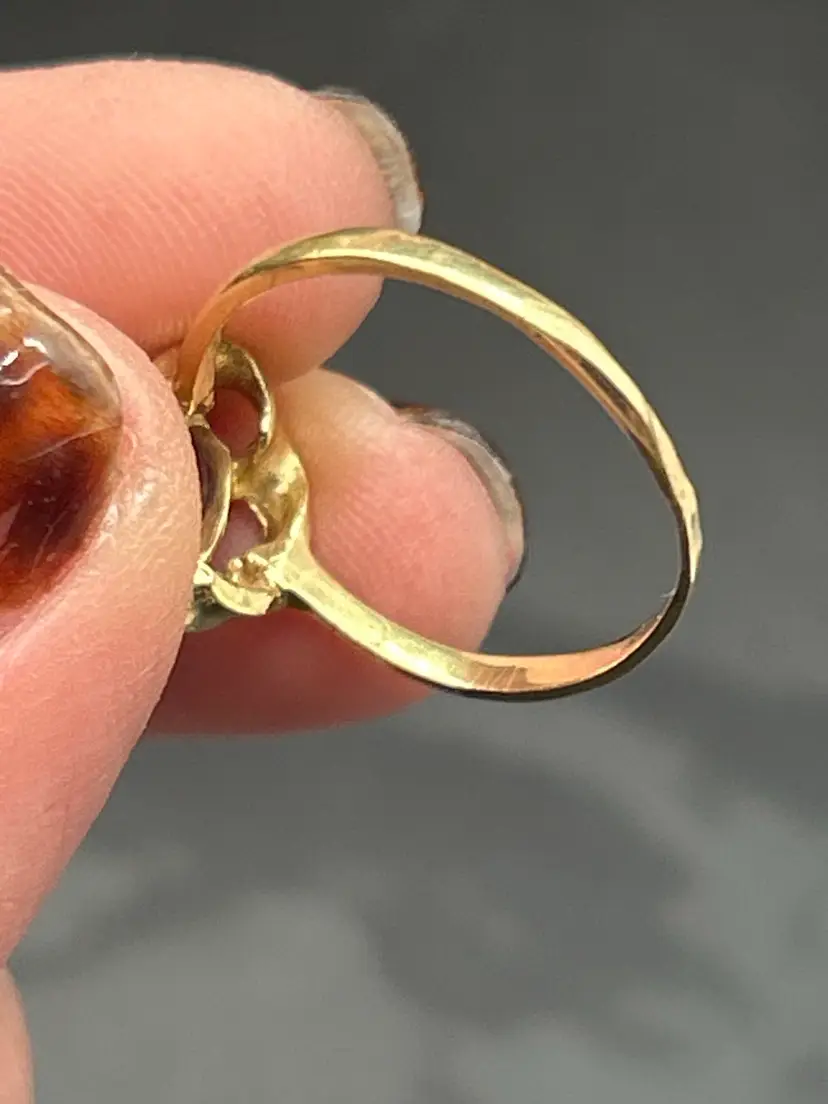 🔍 Notable Details • Metal: Solid 10K yellow gold (hallmarked) • Gemstone: Natural ruby, oval faceted • Design: Sculpted floral/swirl setting • Size: 8.5 • Condition: Very good; shows only light normal wear • Style: Feminine, classic, petite yet eye-catching