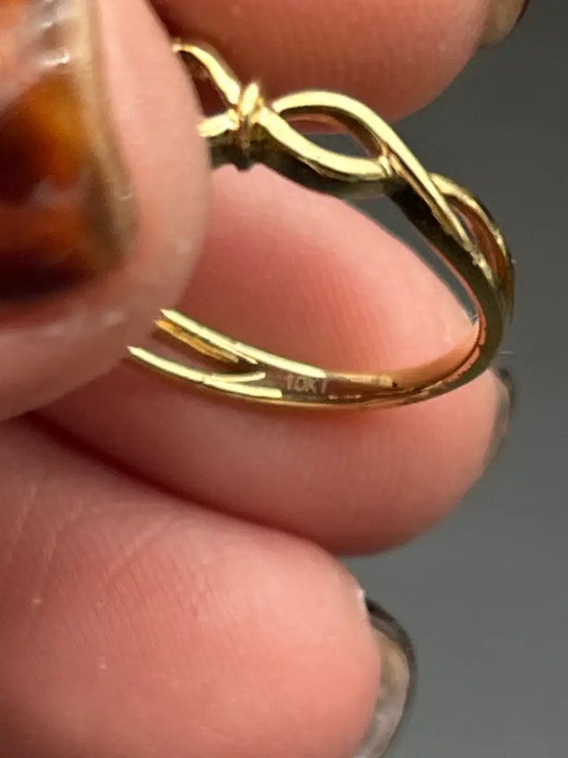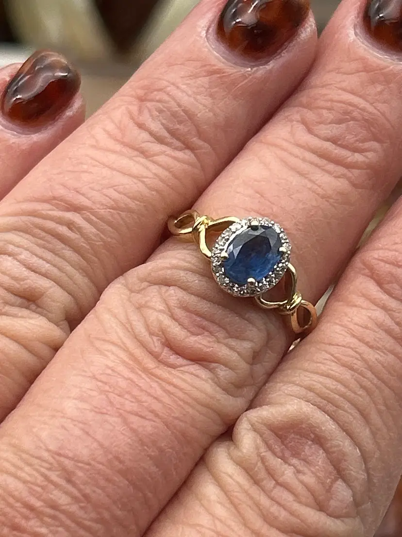 🔍 Notable Details • Metal: Solid 10K yellow gold (hallmarked) • Main Stone: Natural blue sapphire, faceted oval cut • Accents: Genuine diamond halo • Band Style: Twisted/infinity design • Ring Size: 6 ¾ • Condition: Excellent, beautifully maintained • Style: Classic, elegant, and perfect for stacking or wearing alone