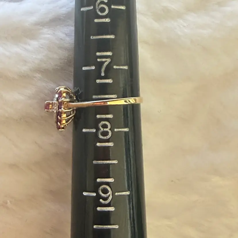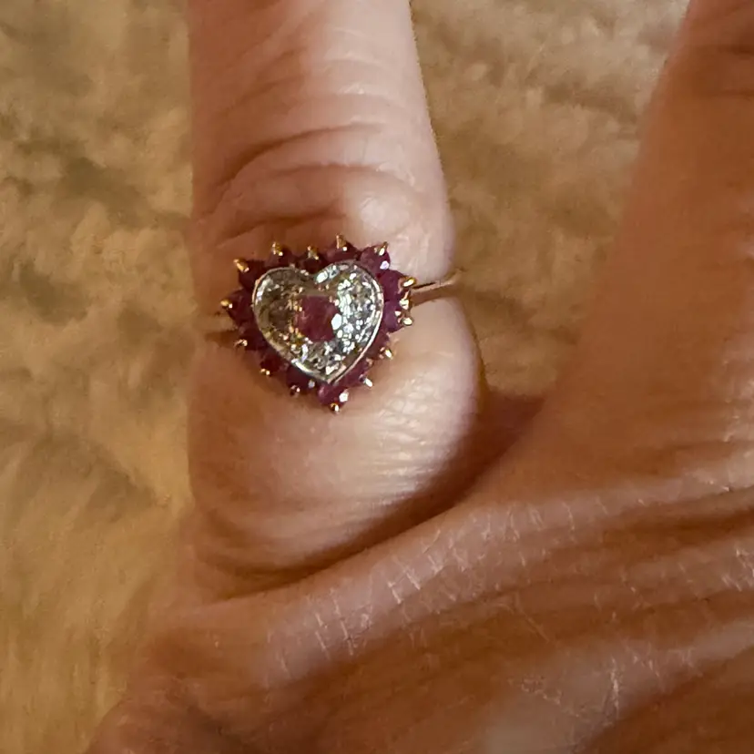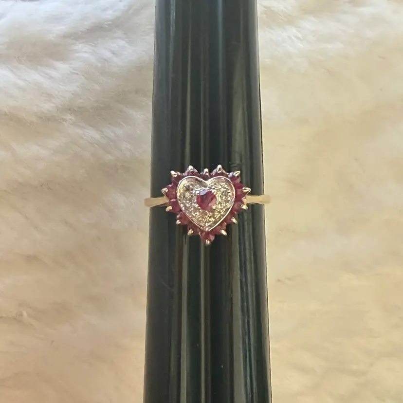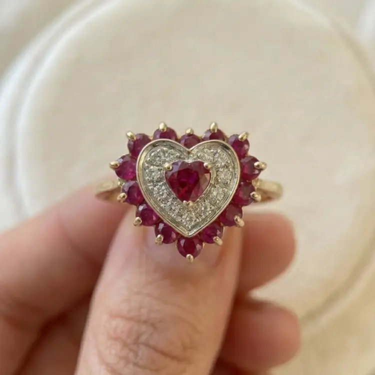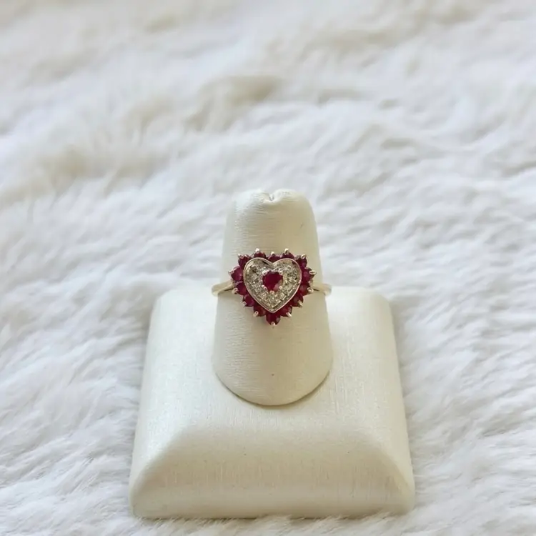 10K gold heart ring featuring a rich ruby center framed by shimmering diamond accents in a classic halo setting. Additional ruby stones surround the heart, creating depth, color, and a romantic vintage inspired look.