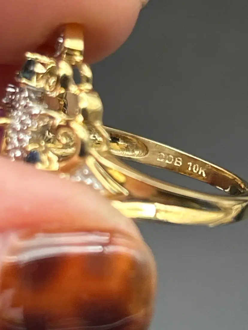 🔍 Notable Details • Metal: Solid 10K yellow gold (hallmarked DDB 10K) • Center Stone: Natural ruby, faceted oval cut • Accents: • 4 blue sapphires • Diamond halo + additional diamond accents • Design: Ornate filigree / Art Deco-inspired • Size: 7 • Condition: Excellent vintage-style condition with strong color and sparkle • Style Notes: Elegant, statement, multi-gemstone, collectible