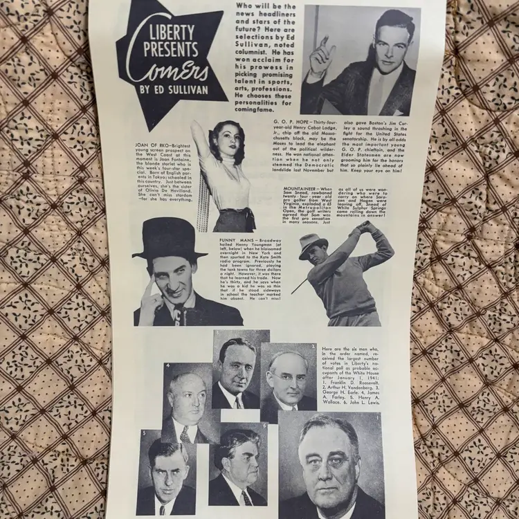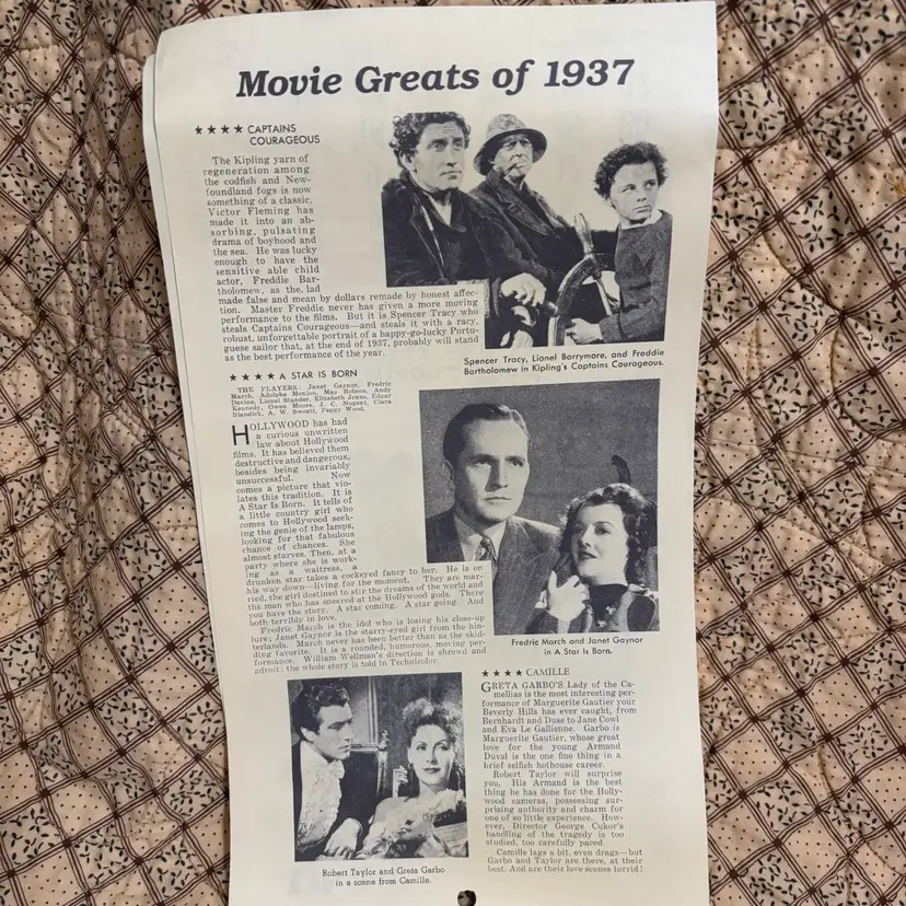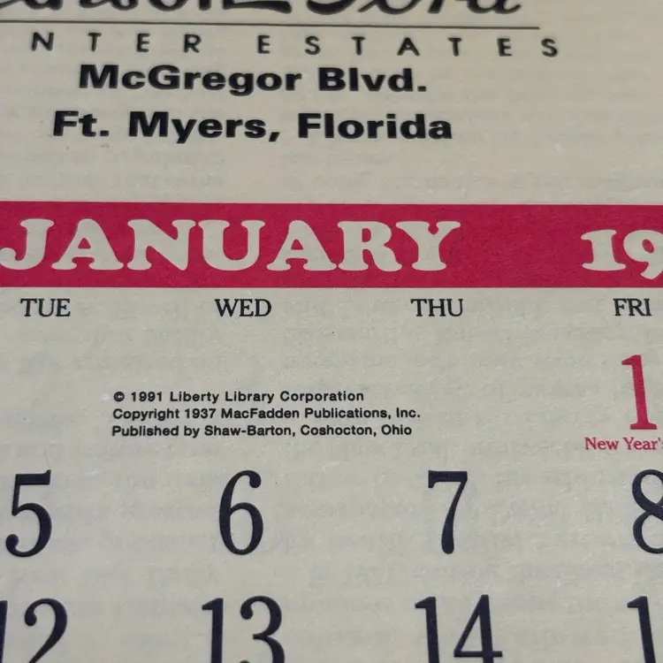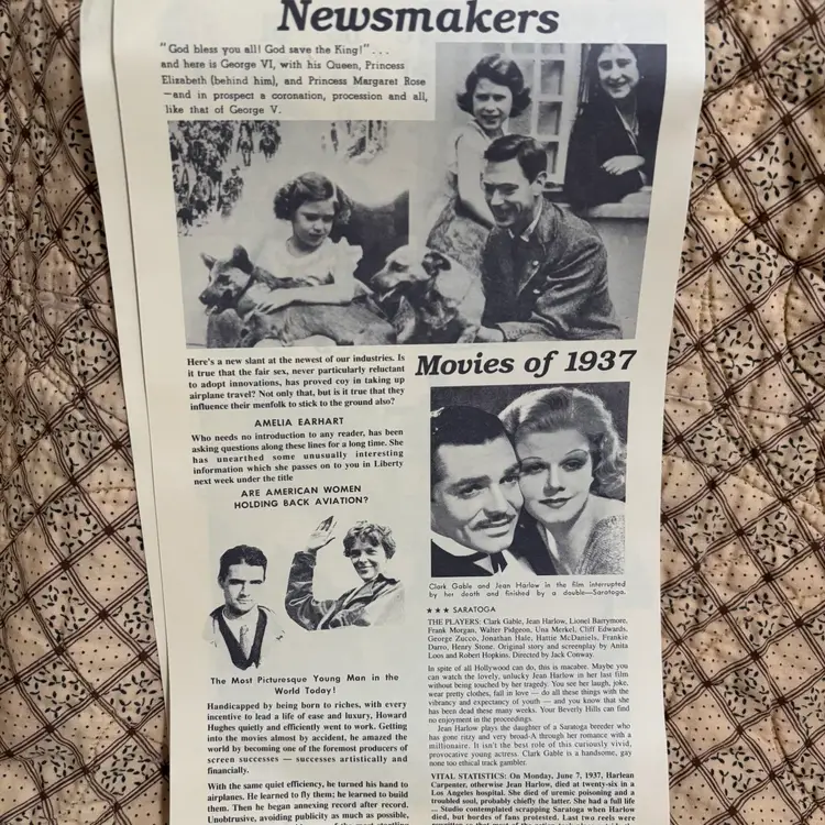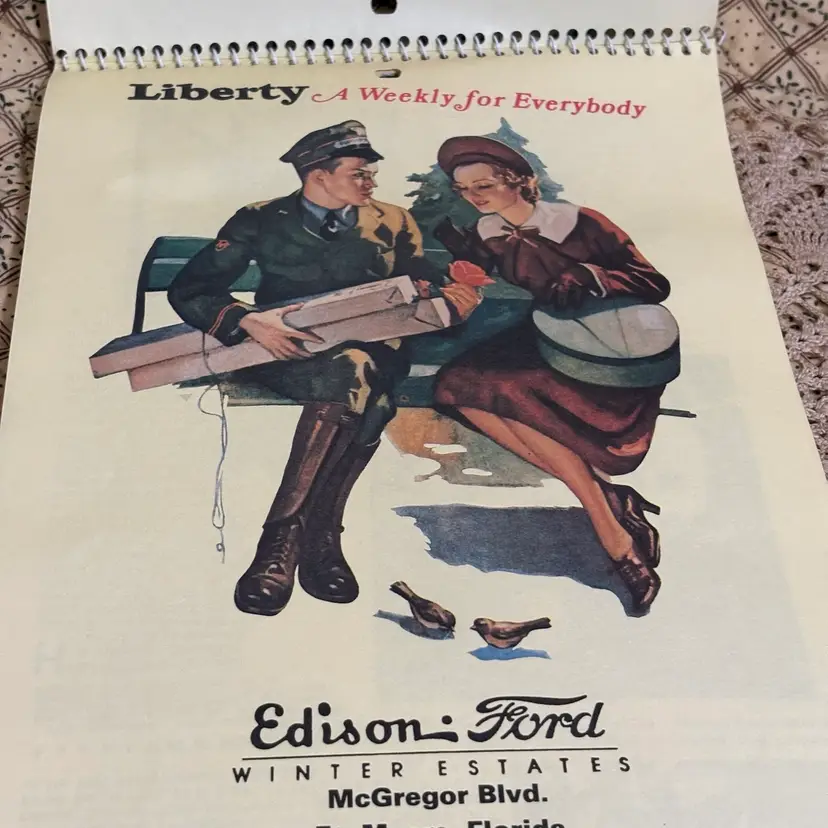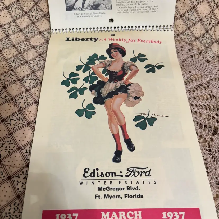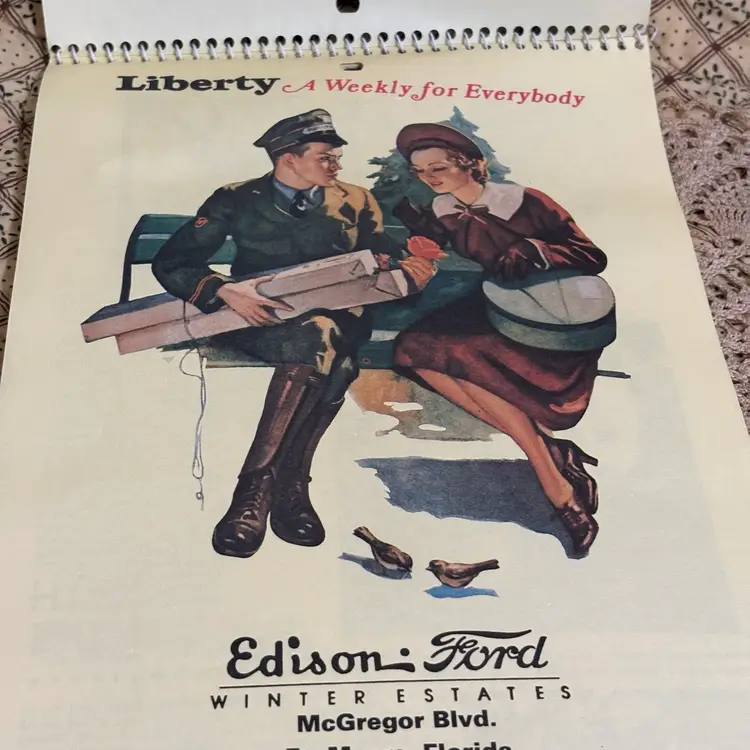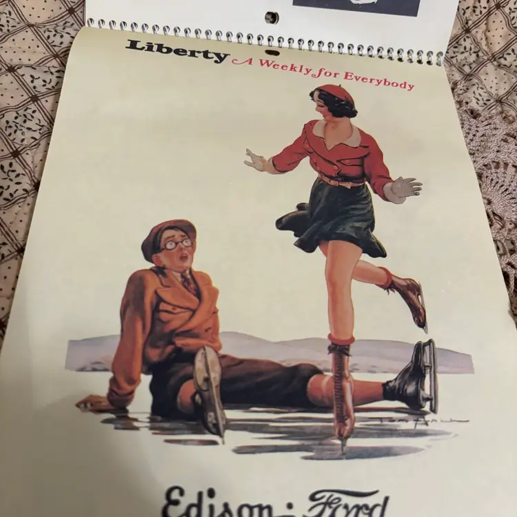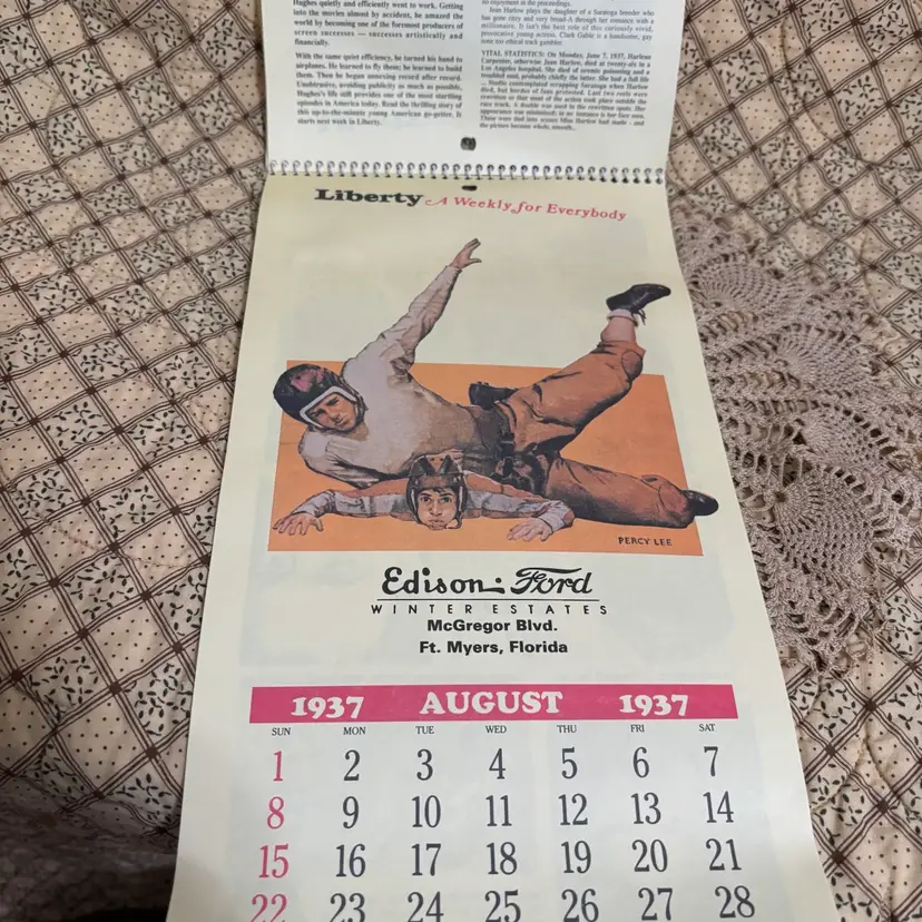 Replica of 1937 advertising calendar of Liberty Edison Ford. Wonderful graphics and interesting articles of 1937 Hollywood stars. No rips or tears or discoloration. A little curling at bottom. 13” X 7”.
