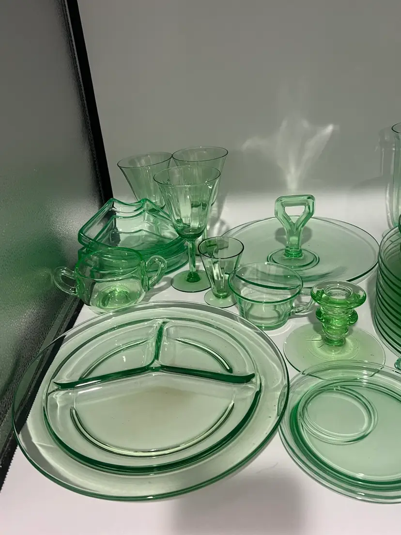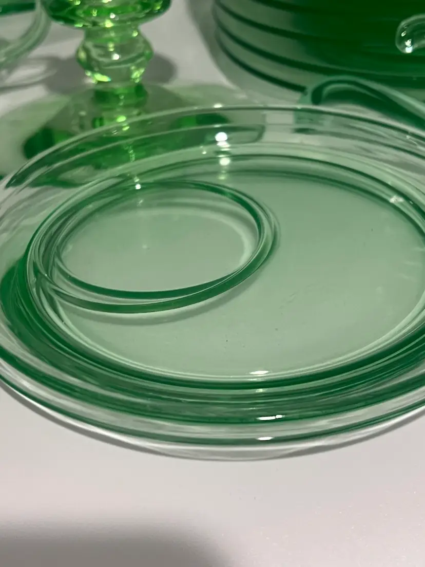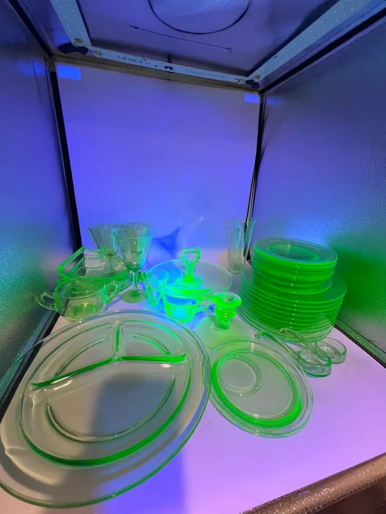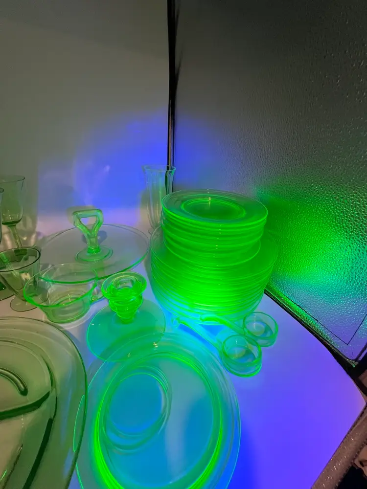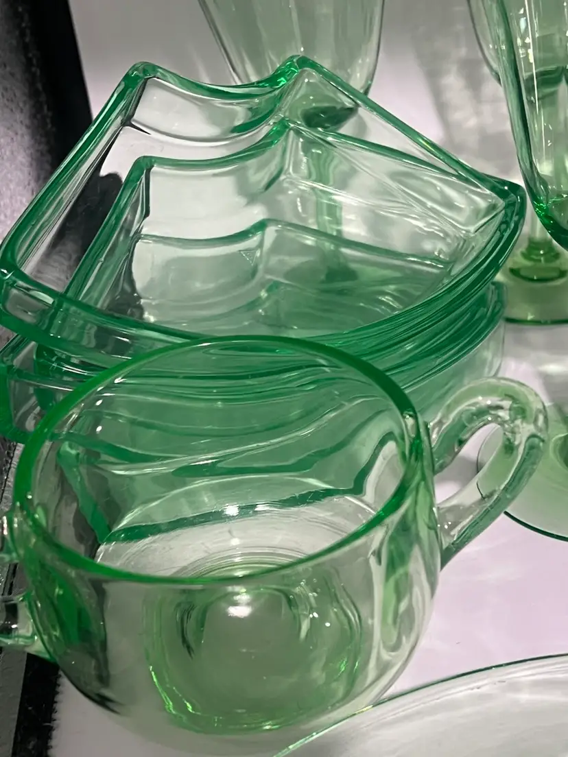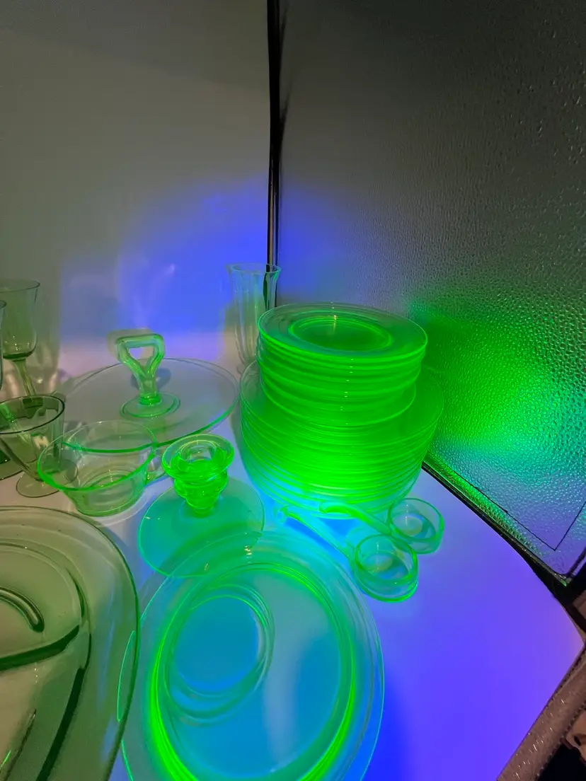 38 mixed pieces of uranium glass Starting bids, per piece, $10.00 Great condition • No flea bites Saucers have been loved but no flea bites Shipping will be adjusted