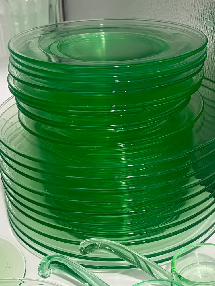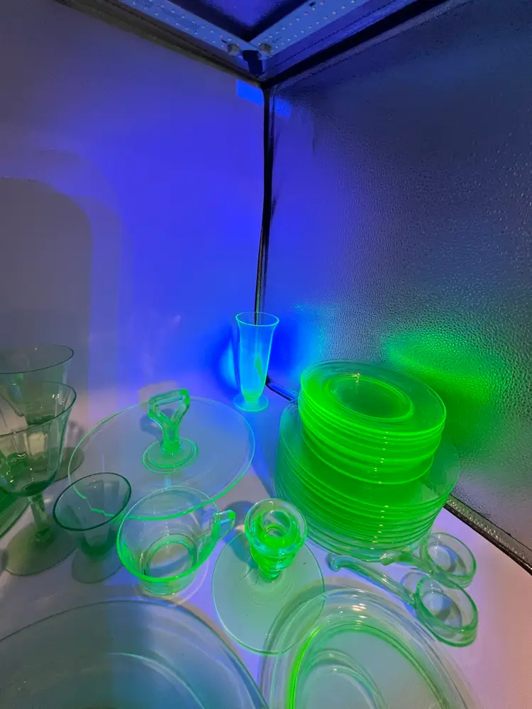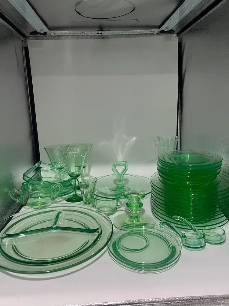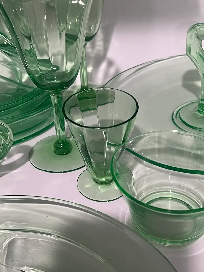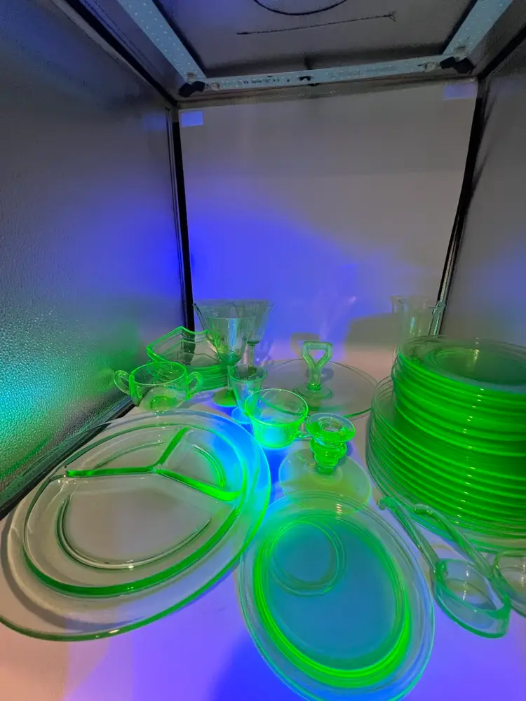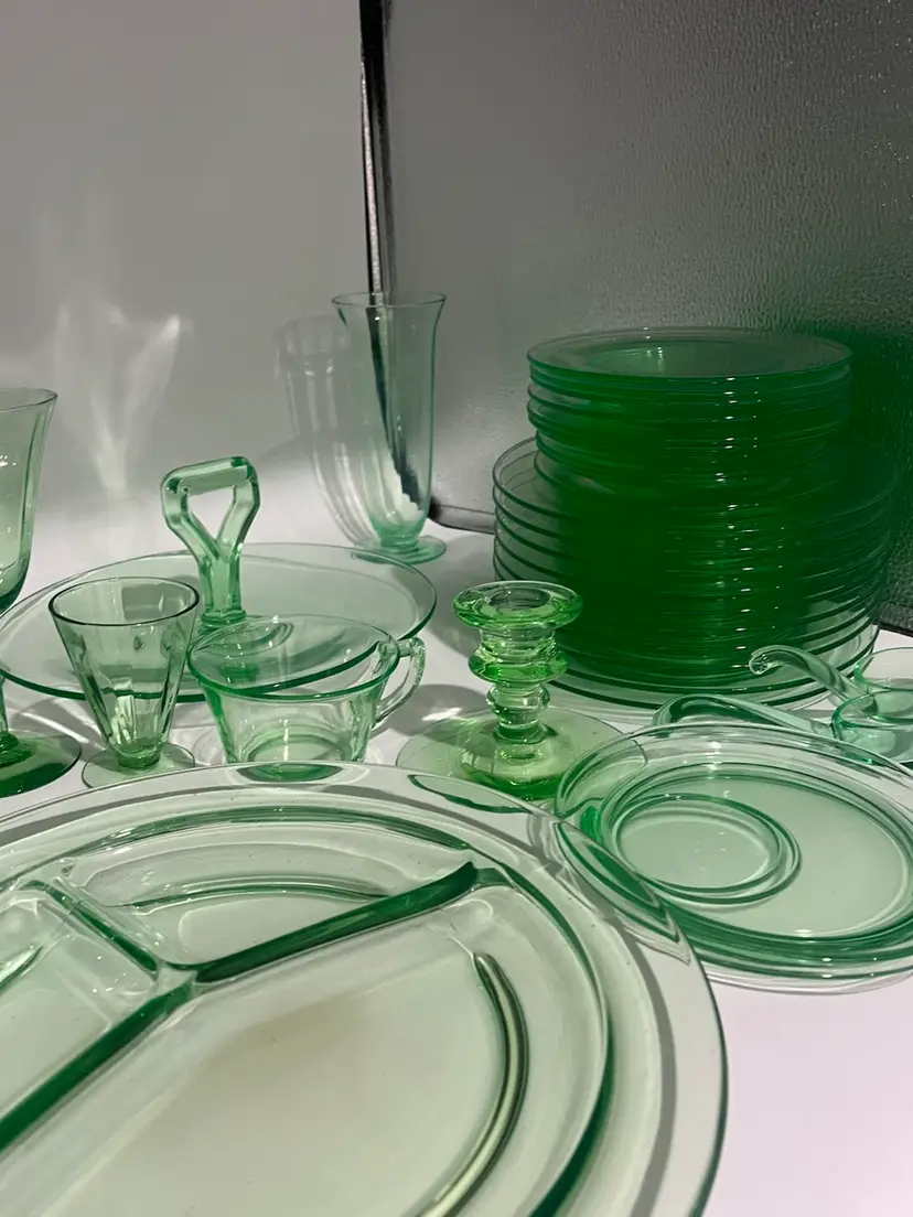38 mixed pieces of uranium glass Starting bids, per piece, $10.00 Great condition • No flea bites Saucers have been loved but no flea bites Shipping will be adjusted