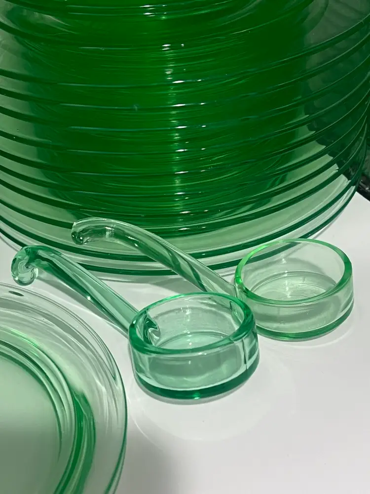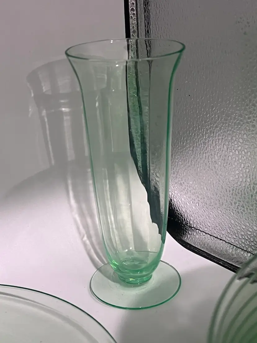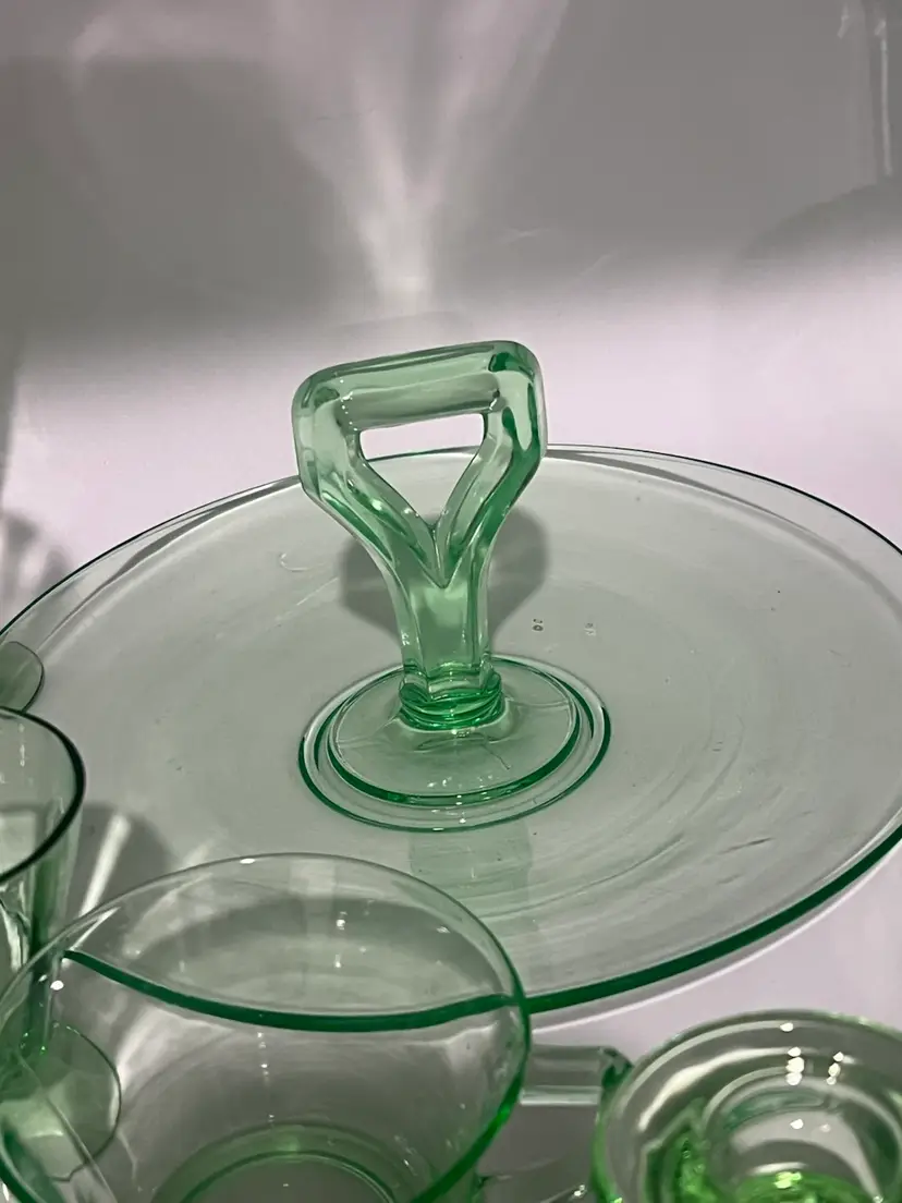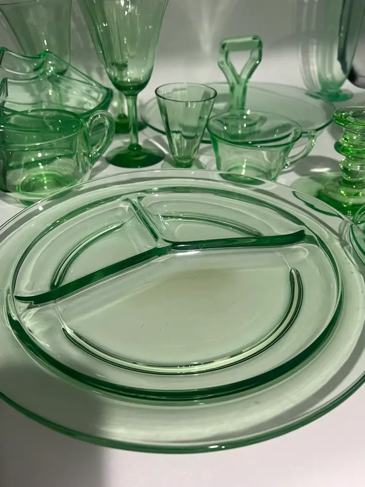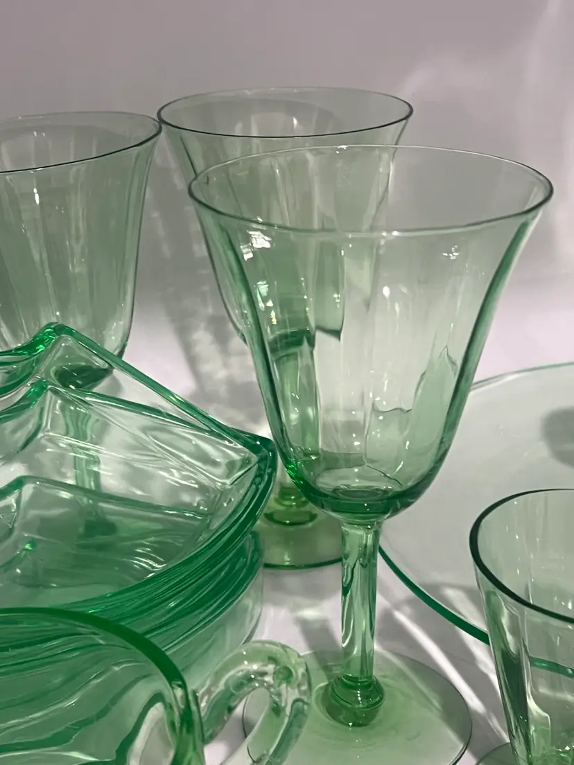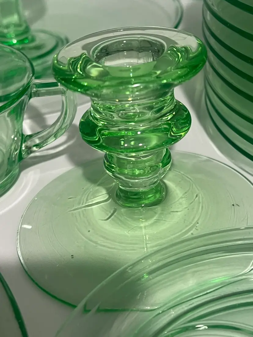 38 mixed pieces of uranium glass Starting bids, per piece, $10.00 Great condition • No flea bites Saucers have been loved but no flea bites Shipping will be adjusted
