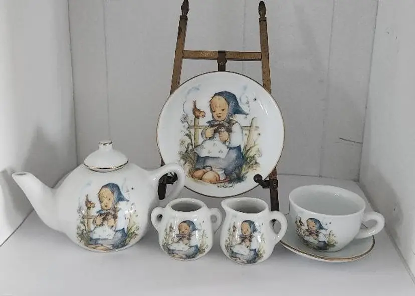 Crafted with the charm of yesteryear, the Hummel Childs Mini Tea Set is a delightful collectible that harkens back to a time of simple pleasures. This 16-piece set, featuring the endearing "He Loves Me" design, is a treasure for both serious collectors and those who appreciate the nostalgia of vintage toys. Each piece in this exquisite set is meticulously shaped and adorned with the classic Hummel figurines, capturing the essence of childhood imagination. Whether displayed on a shelf or used to stage a miniature tea party, this tea set is sure to bring a smile and a sense of wonder to any who admire its timeless allure.