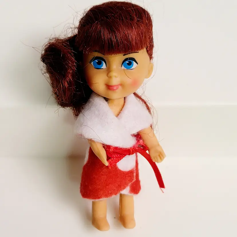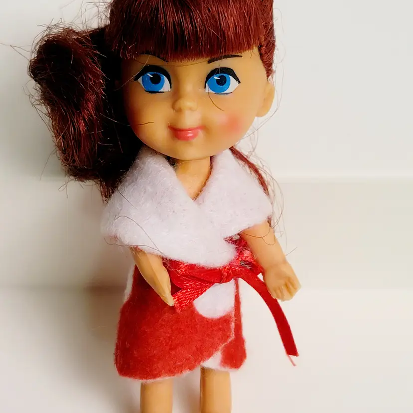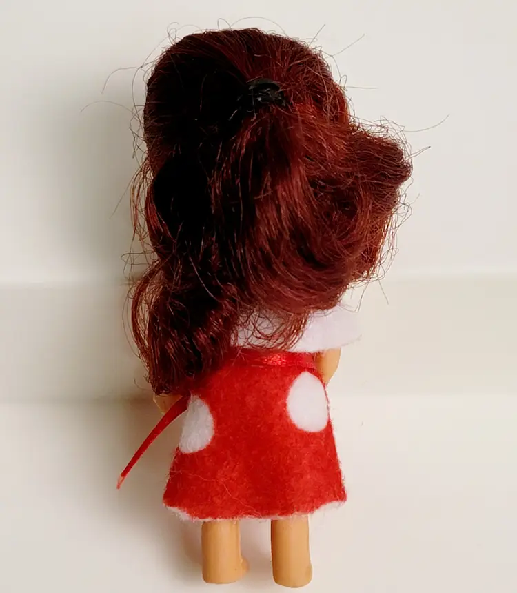 1960s Mattel Little Kiddle's doll. 2.5-3.5" tall. Vinyl/rubber with posable legs. The doll may show wear consistent with age, such as discoloration, holes in rubber feet or hands from wire. Clothing stains or fabric issues. Frizzy hair.