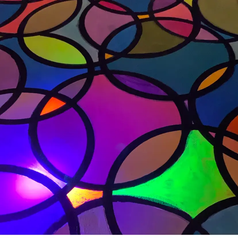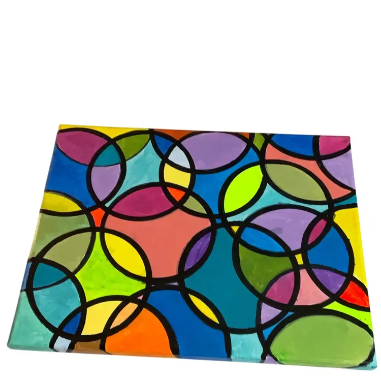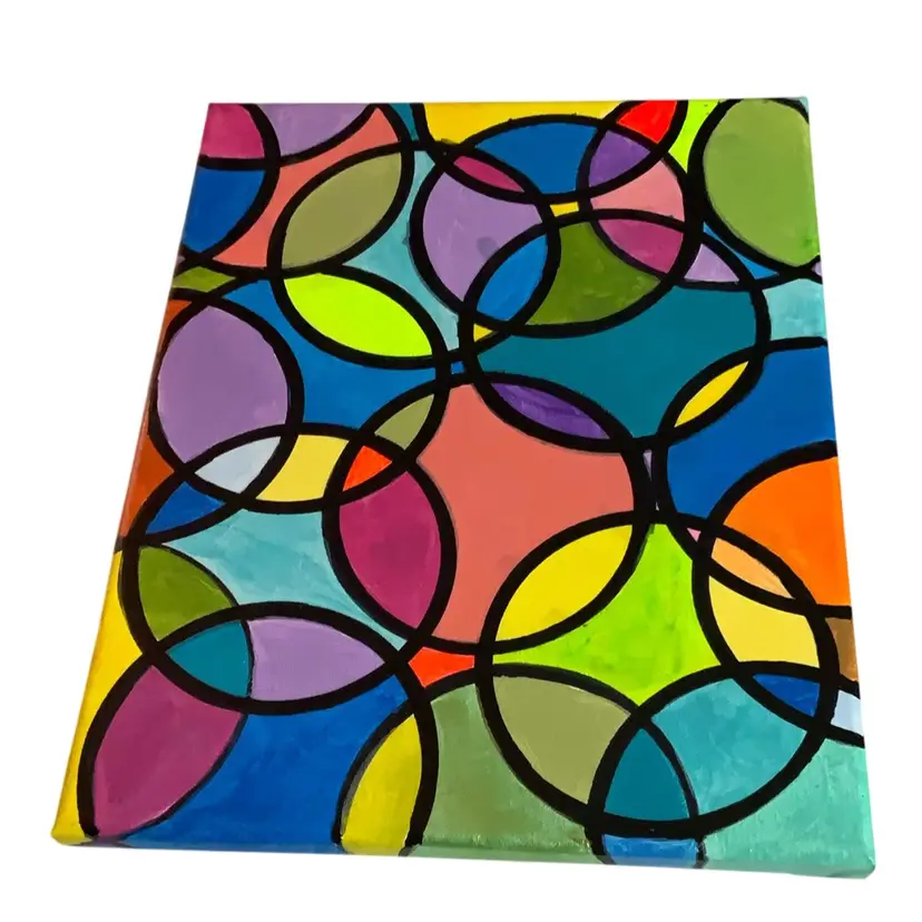 Original artwork for the Party like it’s 1999, Celebrating the 90s and 2000s. It features geometric abstract artwork. Featuring gorgeous colorful circles and semi circles separated by black lines. Looks like satin glass windows. 14” by 11”