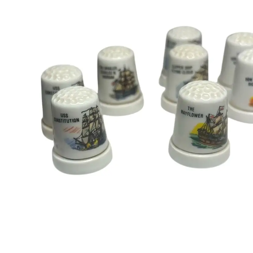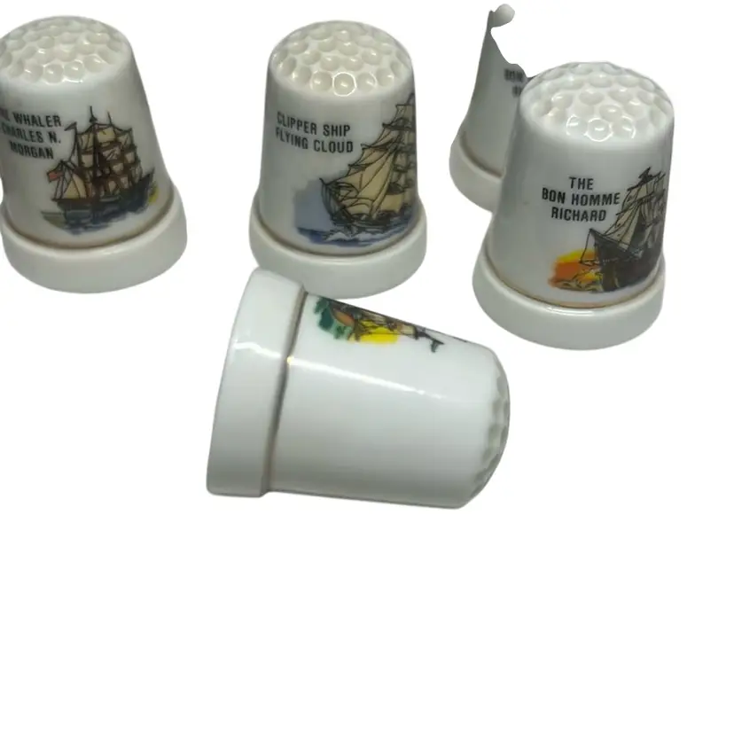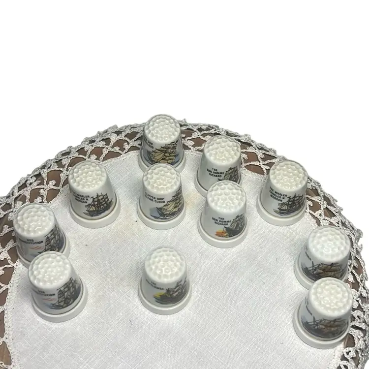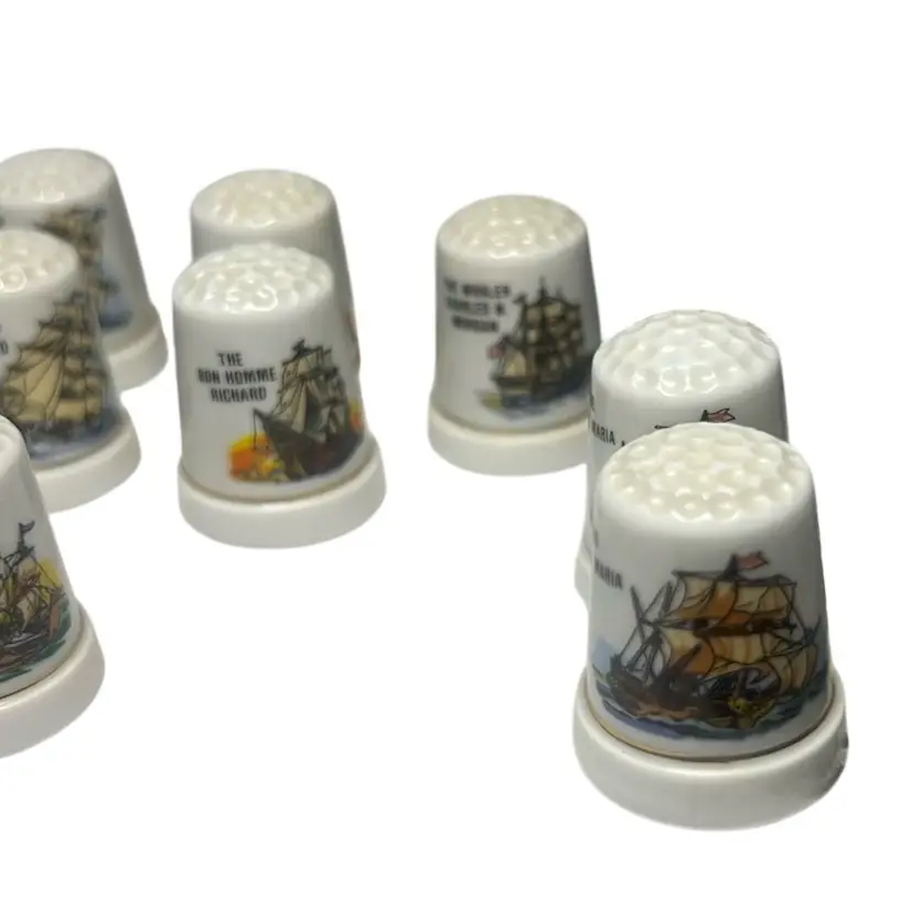 Manufactured by Birchcroft China in Stoke-on Trent England. Handmade and kiln fired featuring a 18k gold band embellishment. This is a collection of old ships. Mayflower USS Constitution x2 The Whaler Charles N Morgan x2 Clipper ship Flying Cloud x 2 The Bon Homme Richard x 2 The Santa Maria x2