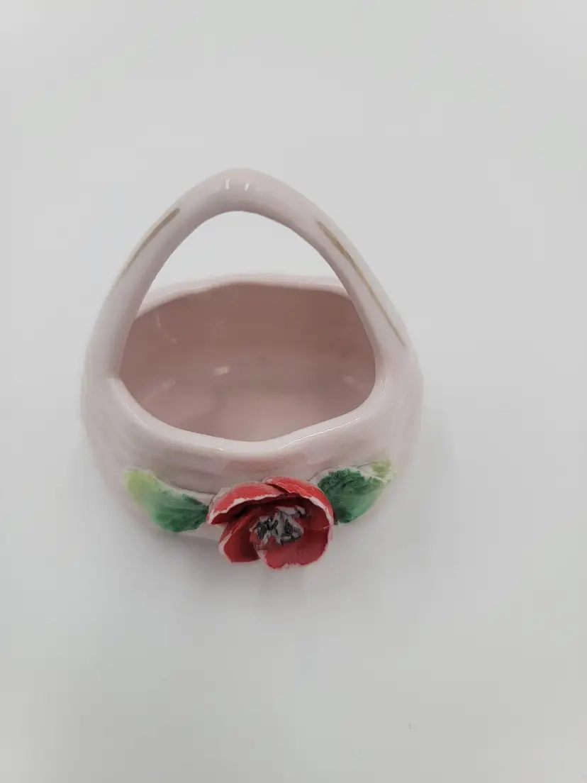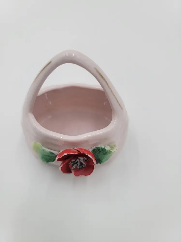 This charming vintage ceramic basket, featuring a soft pink hue with adorable red accents, is perfect for holding your trinkets or serving as a quaint candy dish. Its unique design adds a touch of nostalgia to any room. Germany maid maker mark 2 in 2in 2in as is.
