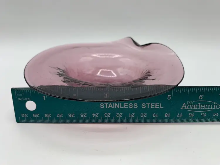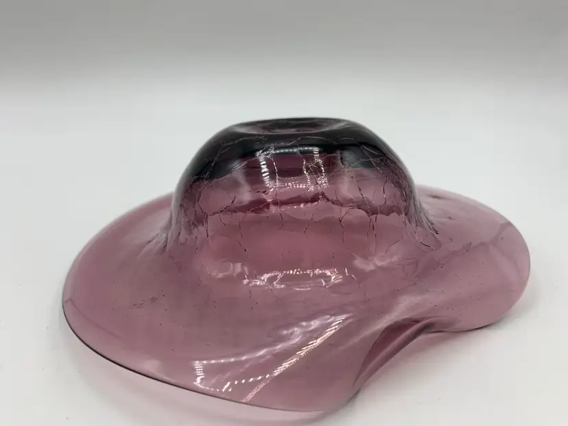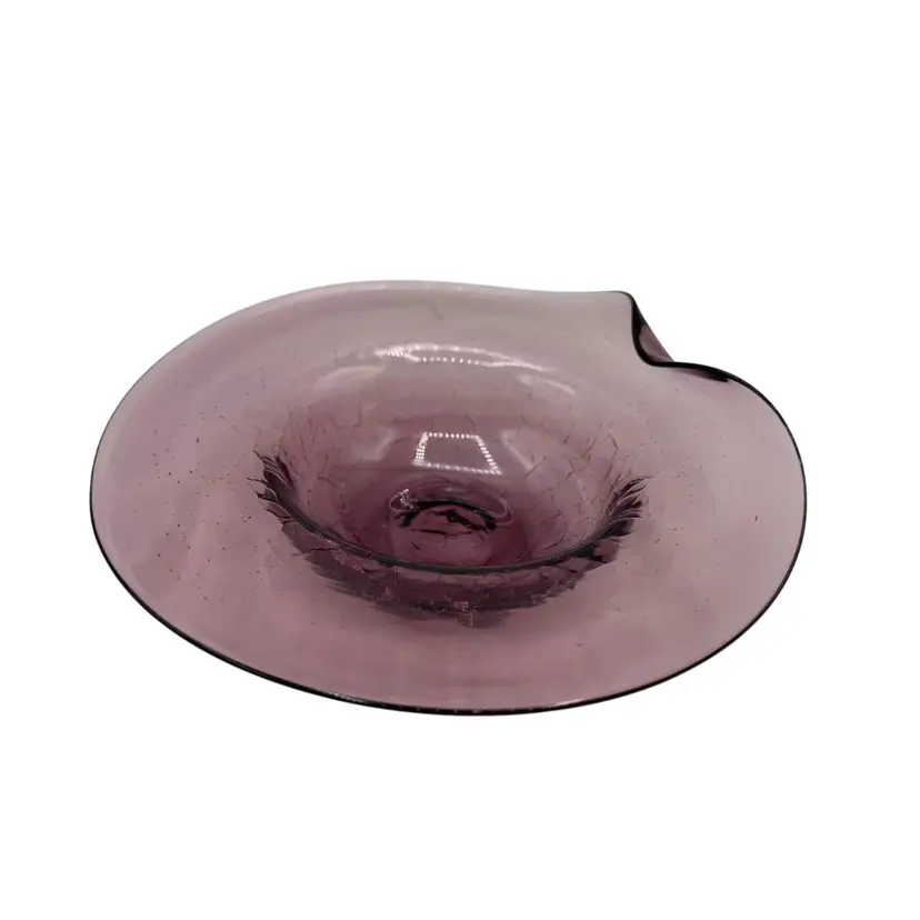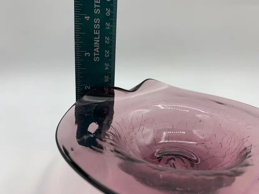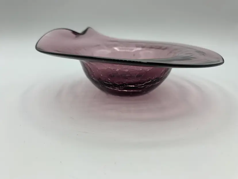 The purple color is vibrant and eye-catching, perfect for display in a glass cabinet, in a window or on a shelf. Whether used as a decorative accent, vase, or collectible glassware, it adds timeless beauty and handcrafted appeal. Estimated Mid 20th Century production, hand blown and features a crackle glass finish. It is 6" x 1.25" high. Excellent vintage condition – no chips, cracks, or repairs. This piece is unmarked, and the maker is known to be Rainbow glass artistry. A wonderful addition for lovers of vintage glass, retro decor, or handmade artisan pieces.