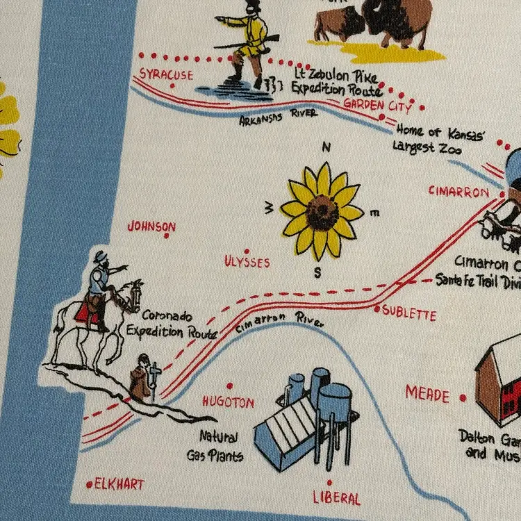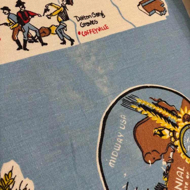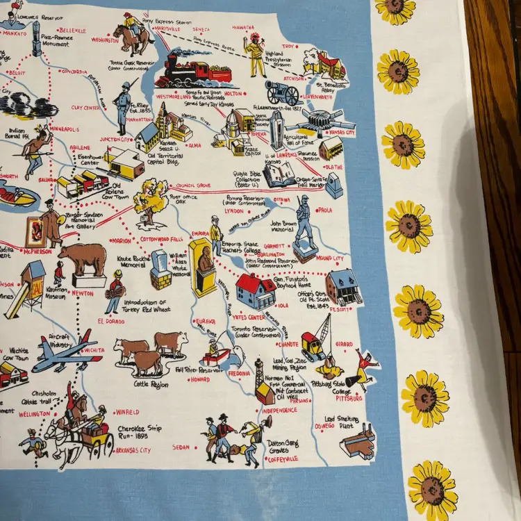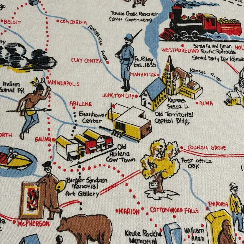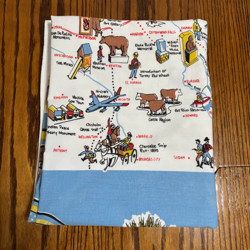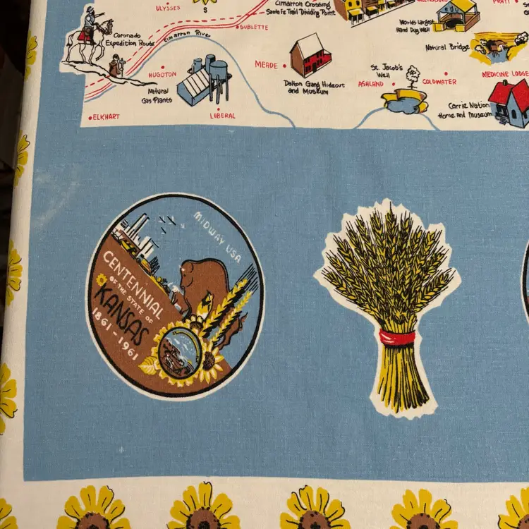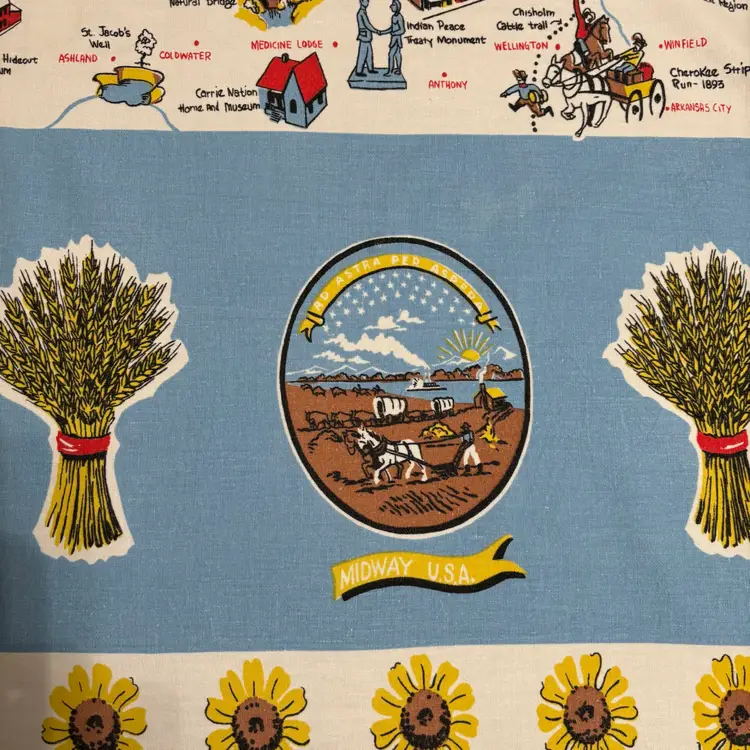 42”X 54” state of Kansas souvenir tablecloth. In pretty darn good condition. No holes rips tears, colors are absolutely vibrant. Only issue is a little fading in blue area.
