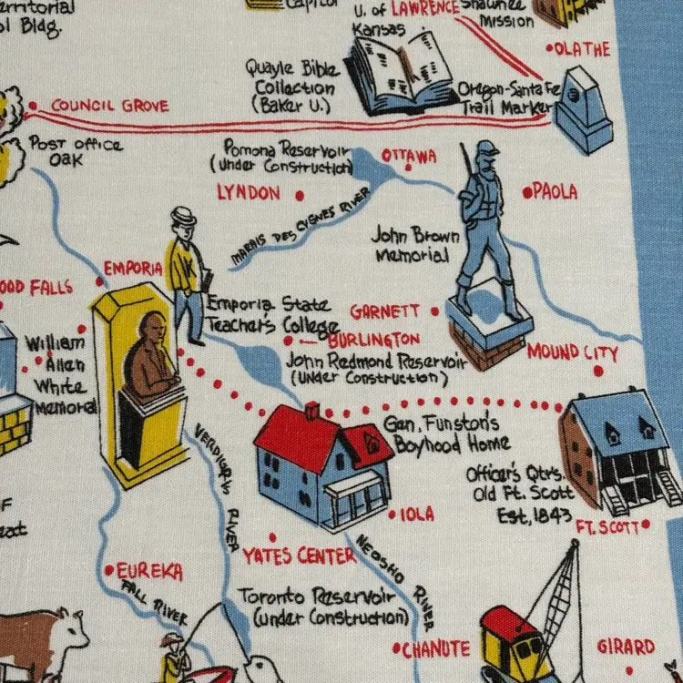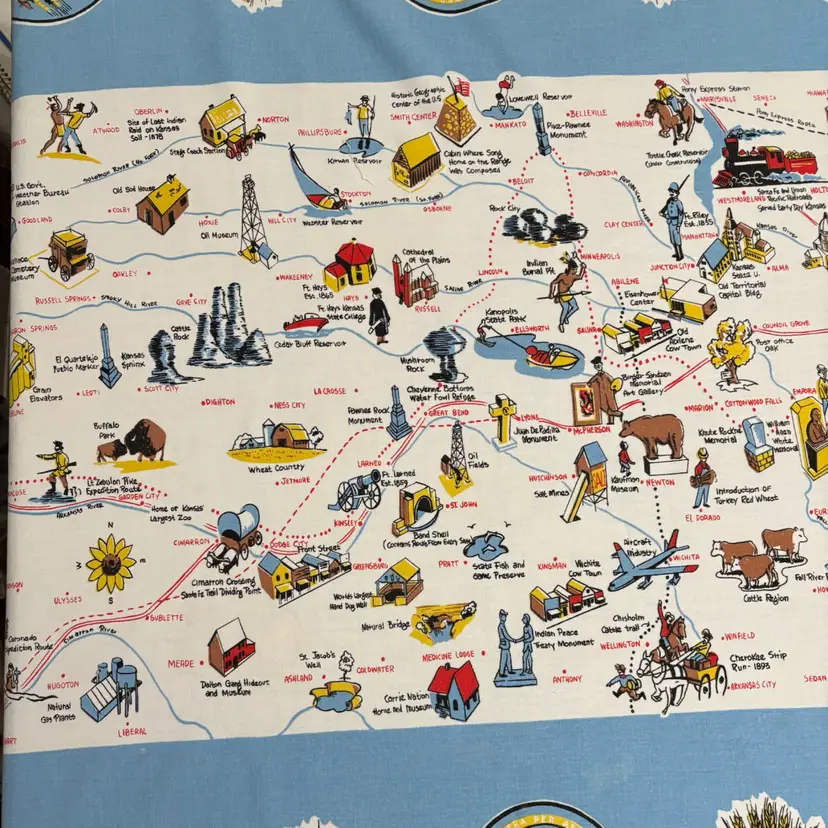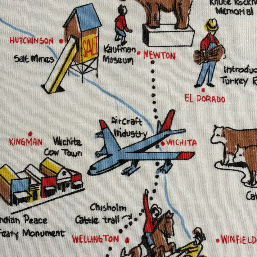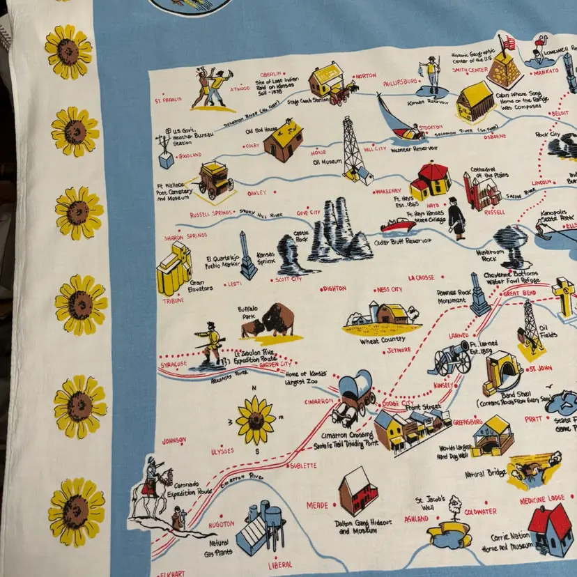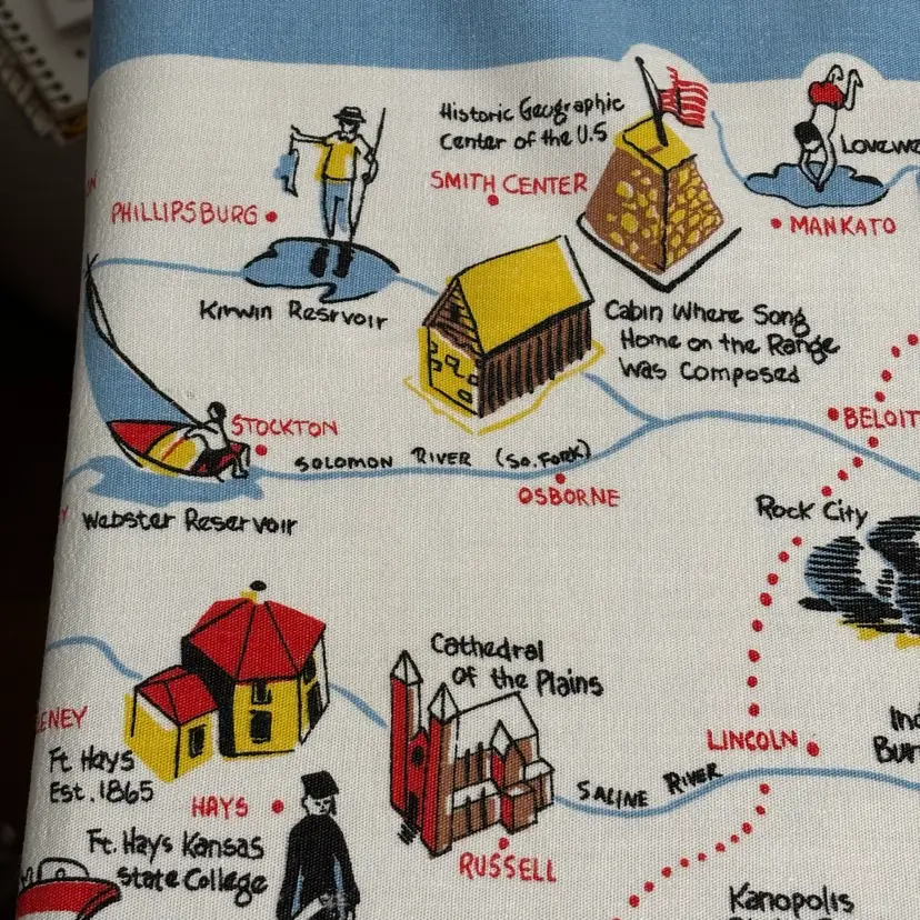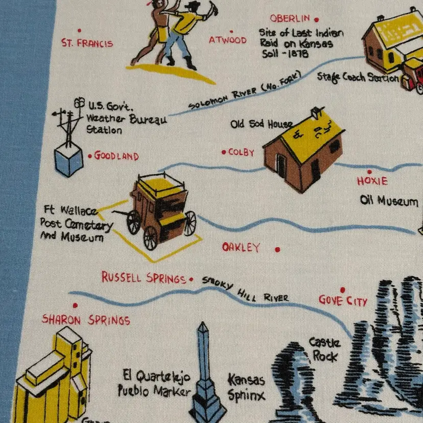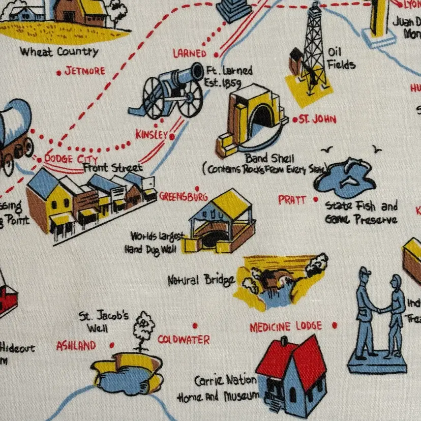 42”X 54” state of Kansas souvenir tablecloth. In pretty darn good condition. No holes rips tears, colors are absolutely vibrant. Only issue is a little fading in blue area.