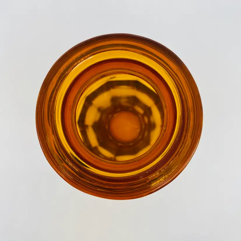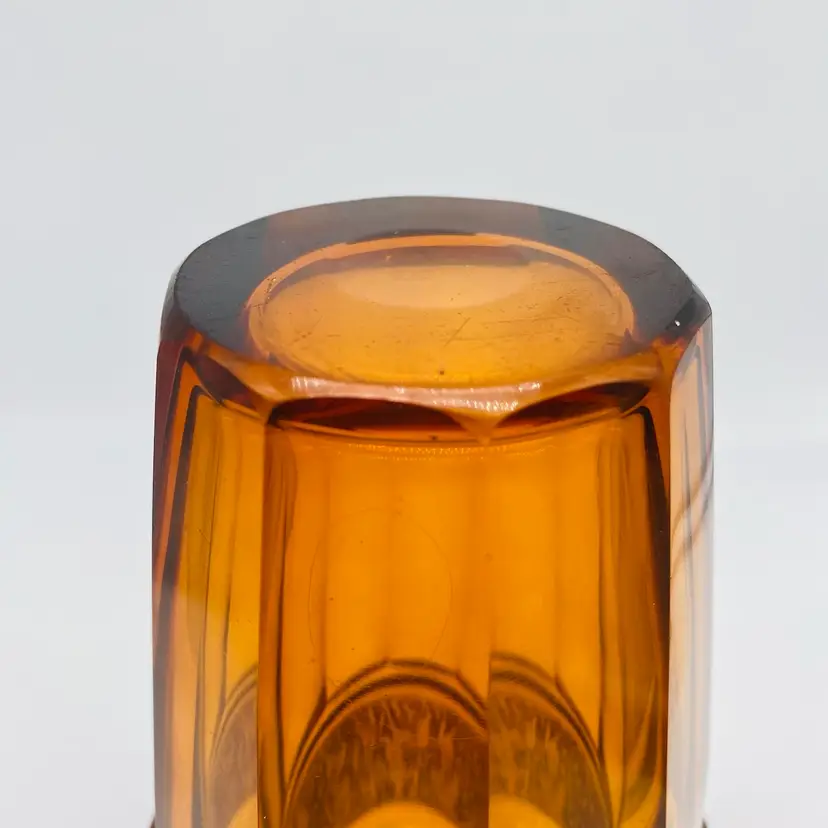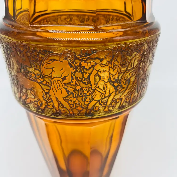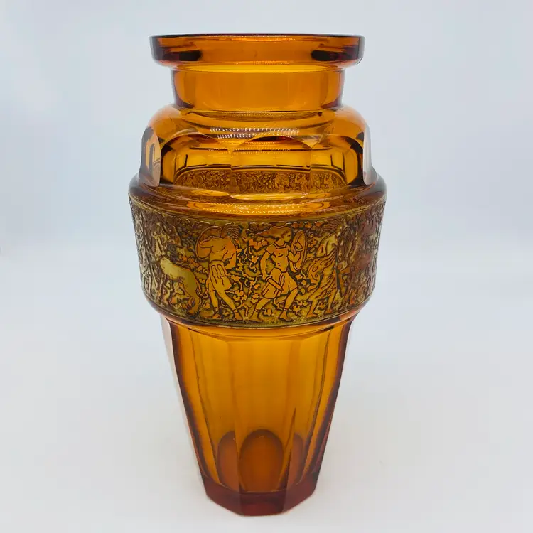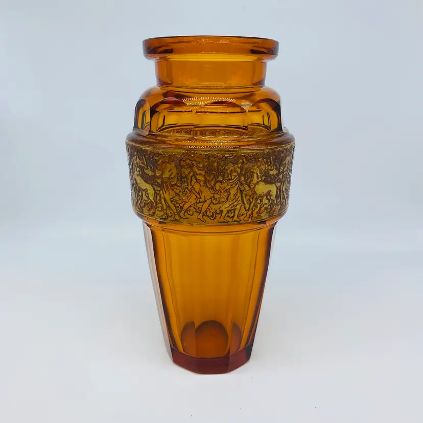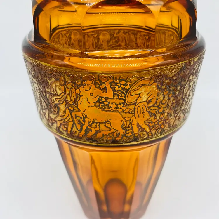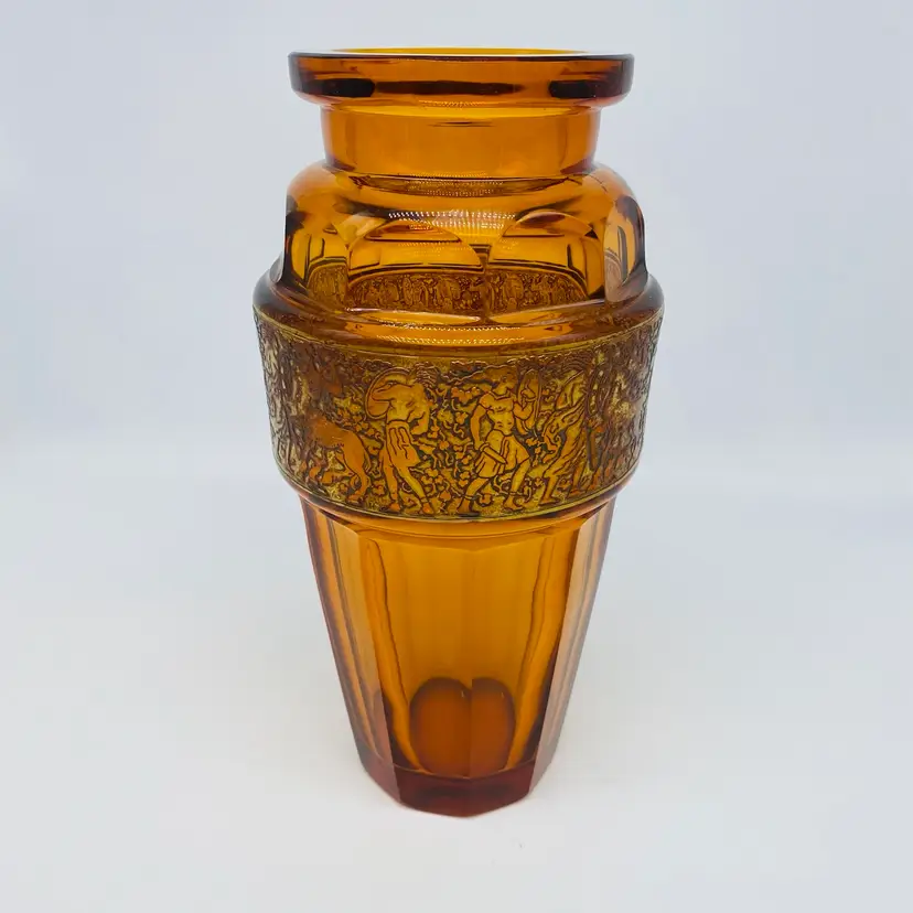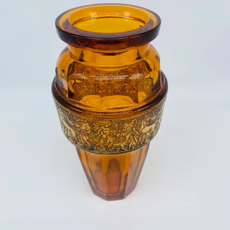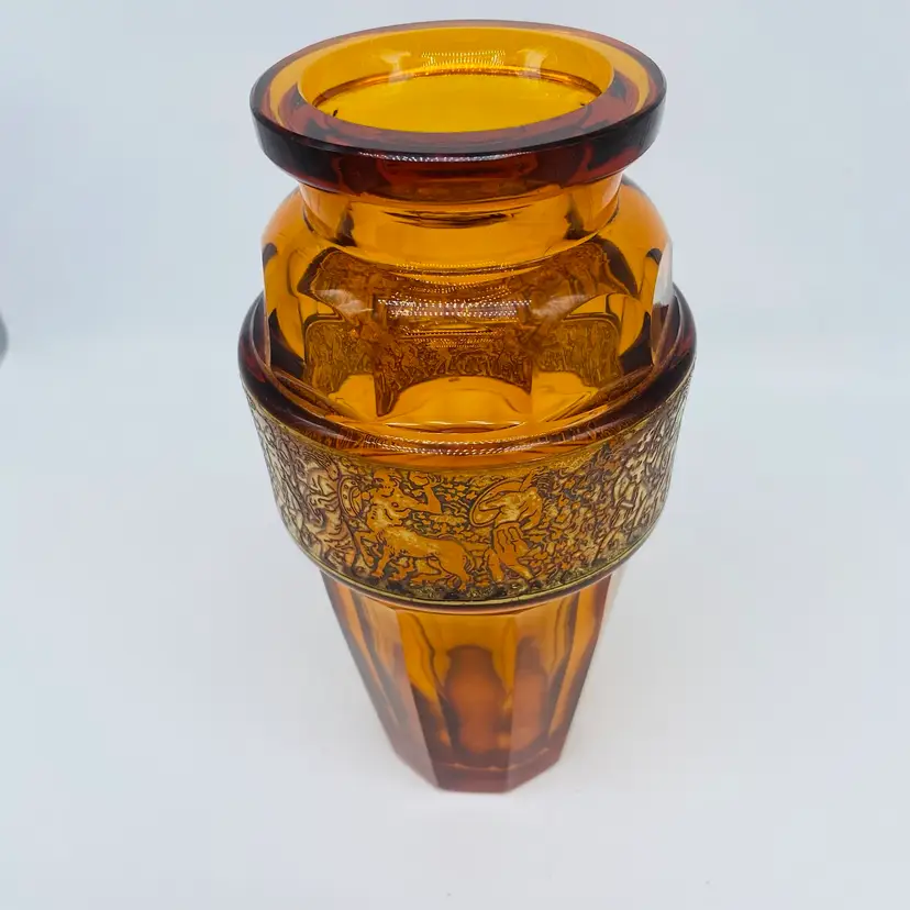 This particular vase, likely from the early to mid-20th century, showcases the Art Nouveau or Art Deco influences characteristic of Moser's output during that period. The amber glass combined with the detailed metal frieze, possibly depicting classical figures, exemplifies the era's fascination with historical motifs and opulent design. Such pieces are prized by collectors for their craftsmanship and historical significance. 8” tall no chips or cracks.