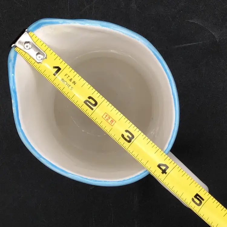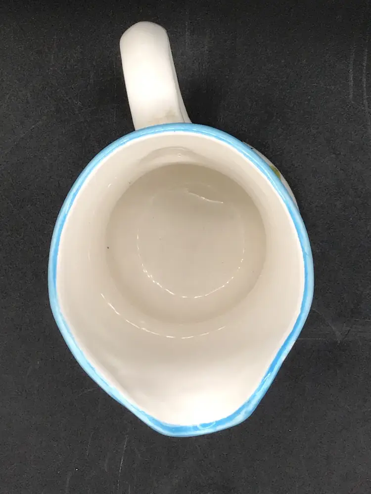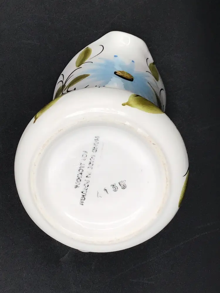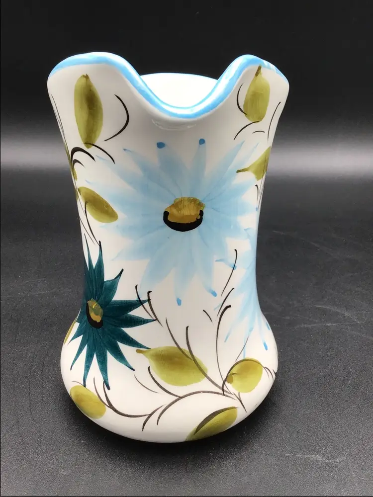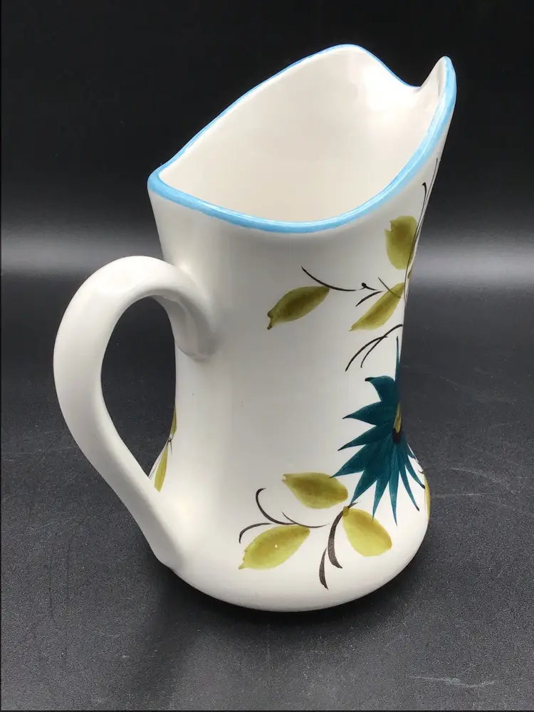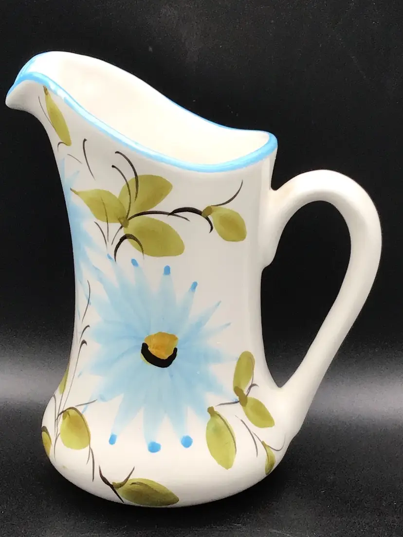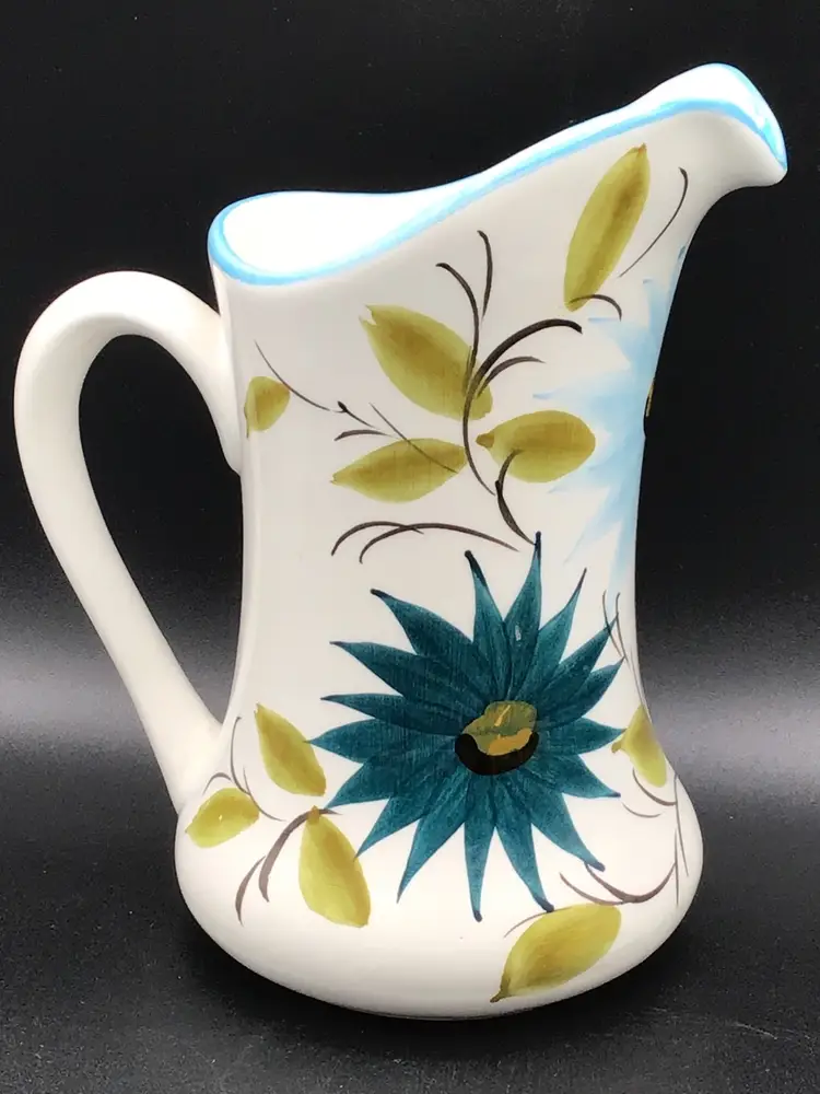 This hand-painted vintage pitcher was made in Portugal. The pitcher stands a little over 6 inches tall and is 5 inches across the widest portion including the handle. It is hand painted in colors of light and dark blue aqua with green leaves. There are no chips, cracks, or flea bites. There is some crazing on the bottom of the pitcher. Please see pictures for complete description, measurements and condition.