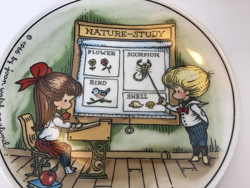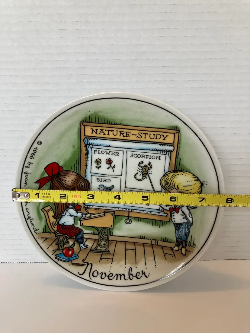 This cute little plate depicts a school room with two children studying nature This is a commemorative plate for November. It is copyrighted 1966 and measures 7 3/4 inches across. There are no chips, cracks or fleas. Please see pictures for complete description, measurements and condition.