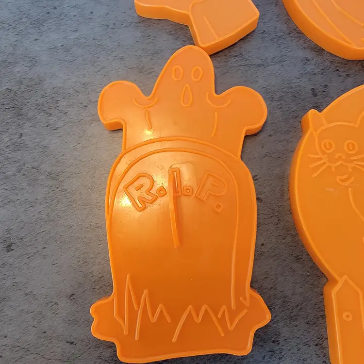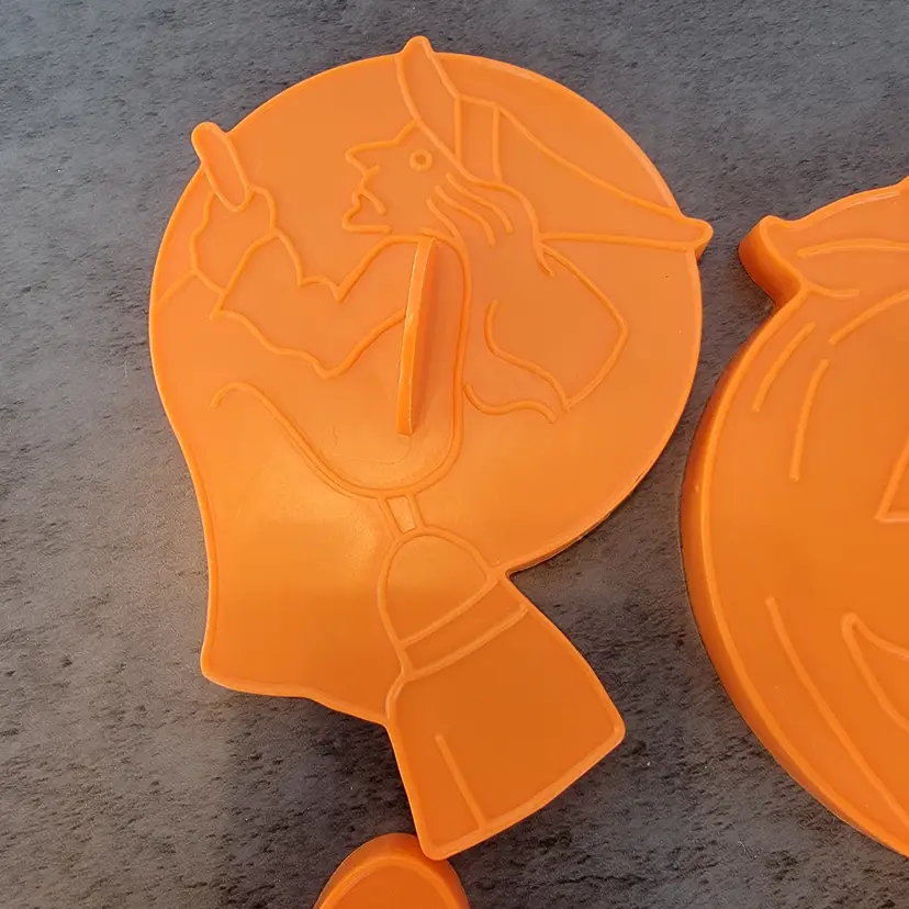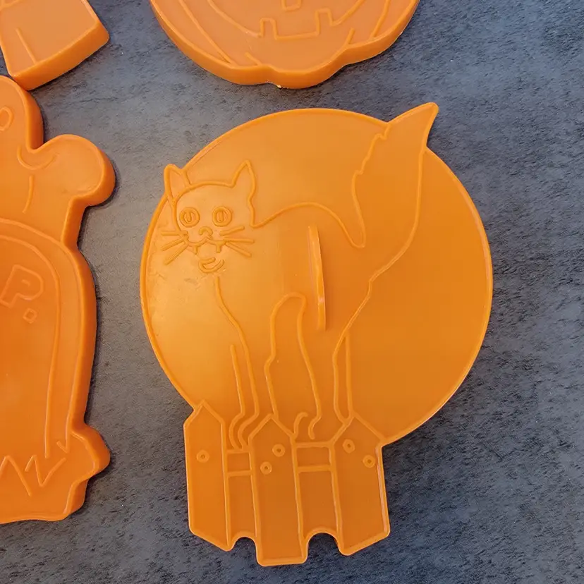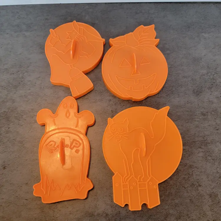 This is a set of 4 cookie cutters: Witch on a broom; jack-o-lantern; ghost & tombstone & a black cat with the moon.