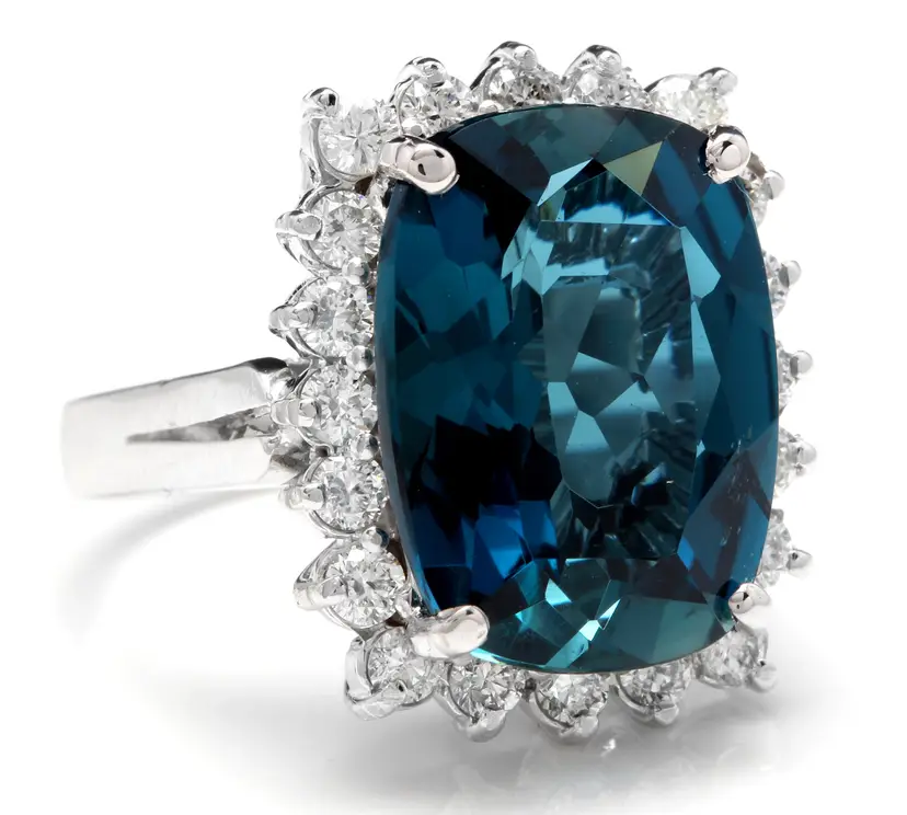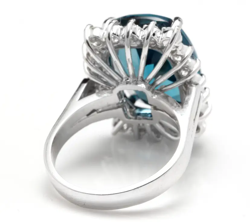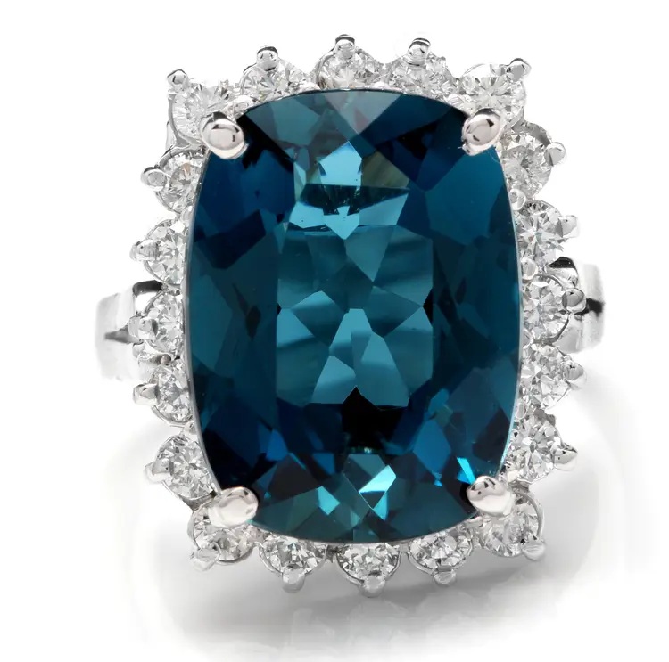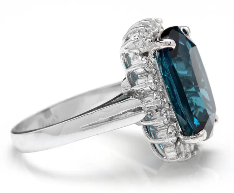 Metal: White Gold Metal Purity: 14k Sizable: Yes Main Stone: London Blue Topaz Total Carat Weight (TCW): 12.90 Main Stone Shape: Cushion Main Stone Color: Blue Ring Size: 6.25 Main Stone Creation: Treated Main Stone Treatment: Heating, Irradiation Country/Region of Manufacture: United States Brand: Unbranded Type: Ring