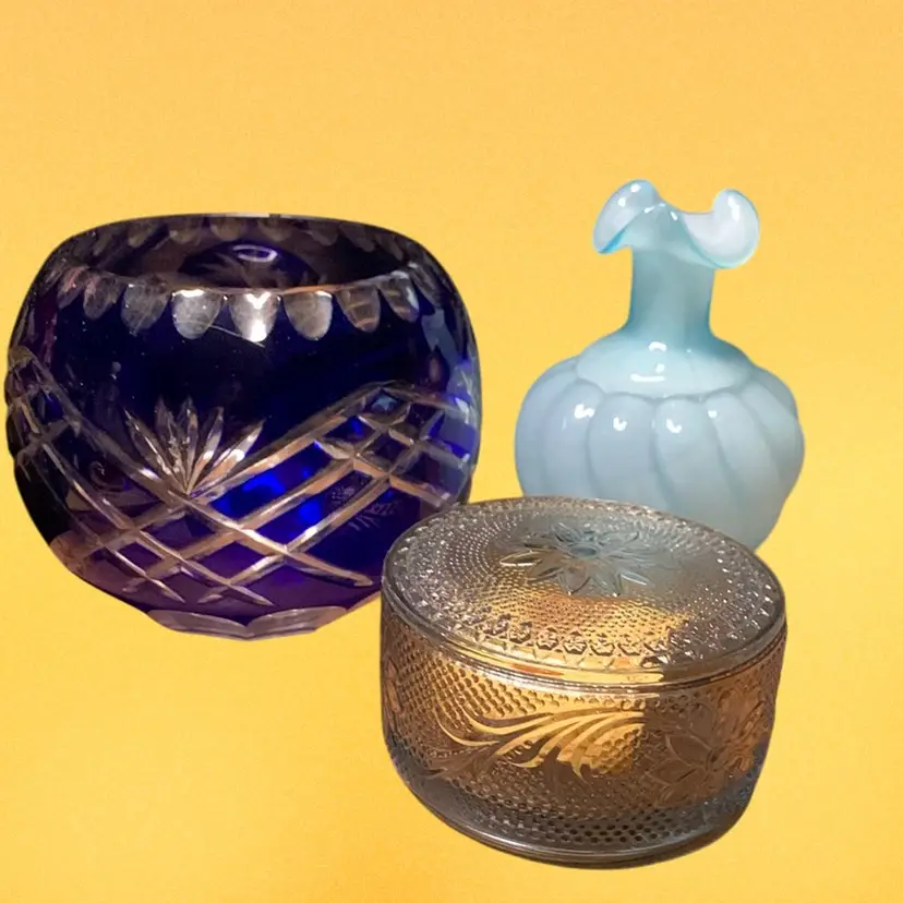 All three are an excellent condition, one Fenton vase, one Tiara trinket dish, one cut to clear bud vase