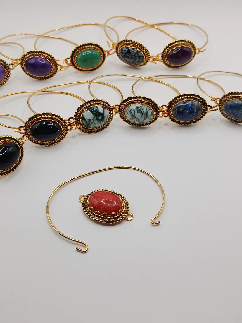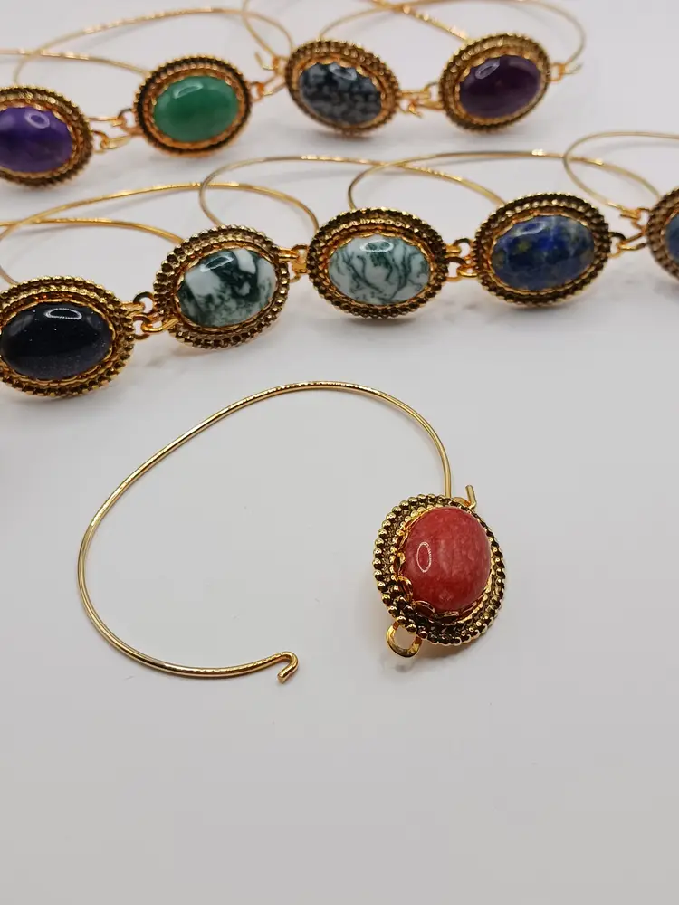 MBLot02 - Each Bracelet is the same as following description, but different gemstones so will list #'s and names of stone after this. BM475 - Blue Sandstone Gemstone that measures 1/2 x 3/4 x 1/4 inches has been mounted into a Gold-Plated Linked setting with a gold-plated wired form to make a 7-inch bracelet. BM476 - Blue Sandstone Gemstone BM477 - Green Tree Agate Gemstone BM478 - Green Tree Agate Gemstone BM479 - Lapis Lazuli Gemstone BM480 - Lapis Lazuli Gemstone BM481 - Purple Dyed Howlite Gemstone BM482 - Purple Dyed Howlite Gemstone BM483 - Jade Gemstone BM484 - Snow Flake Obsidian Gemstone BM485 - Amethyst Gemstone BM486 - Red Moonstone Gemstone