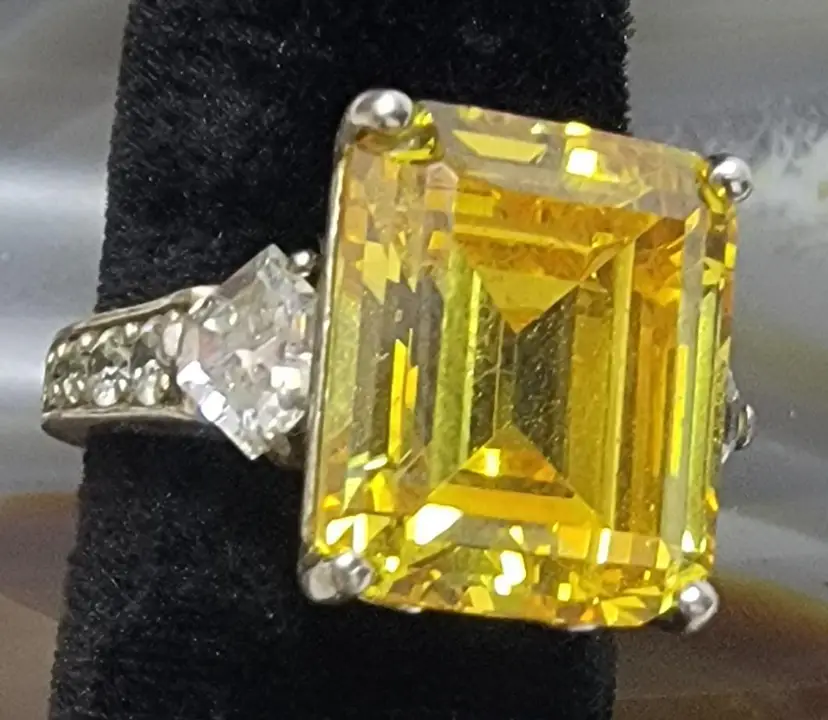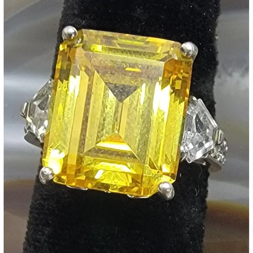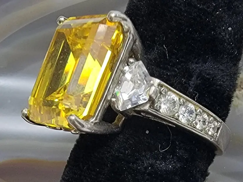 Jean Dousset Sterling & CZ Ring. Size 7 ¼ The huge yellow center stone is beautifully faceted and is ½” by ½”. Signed JD CZ 925. Excellent pre owned condition.