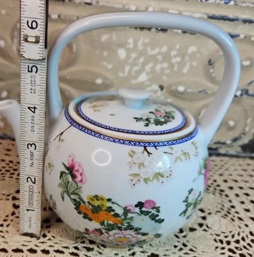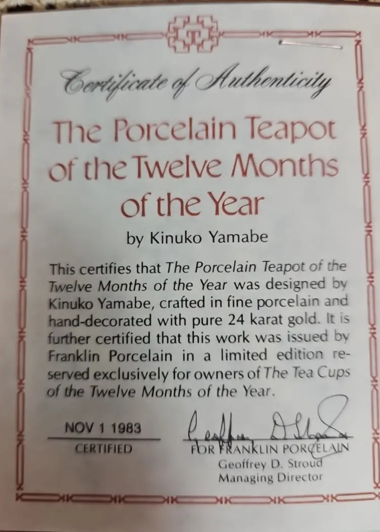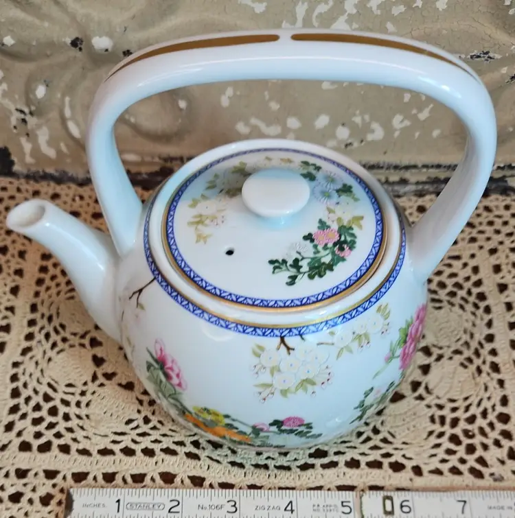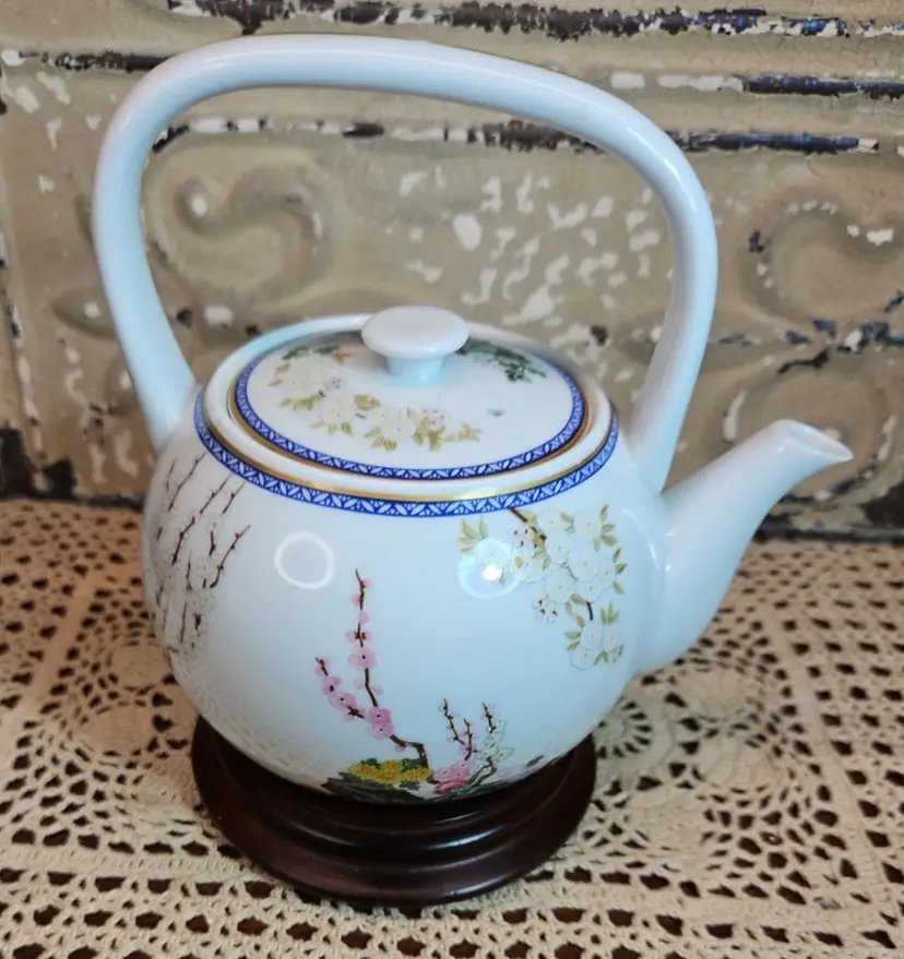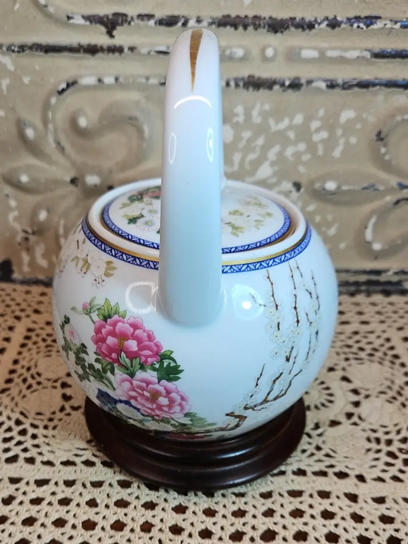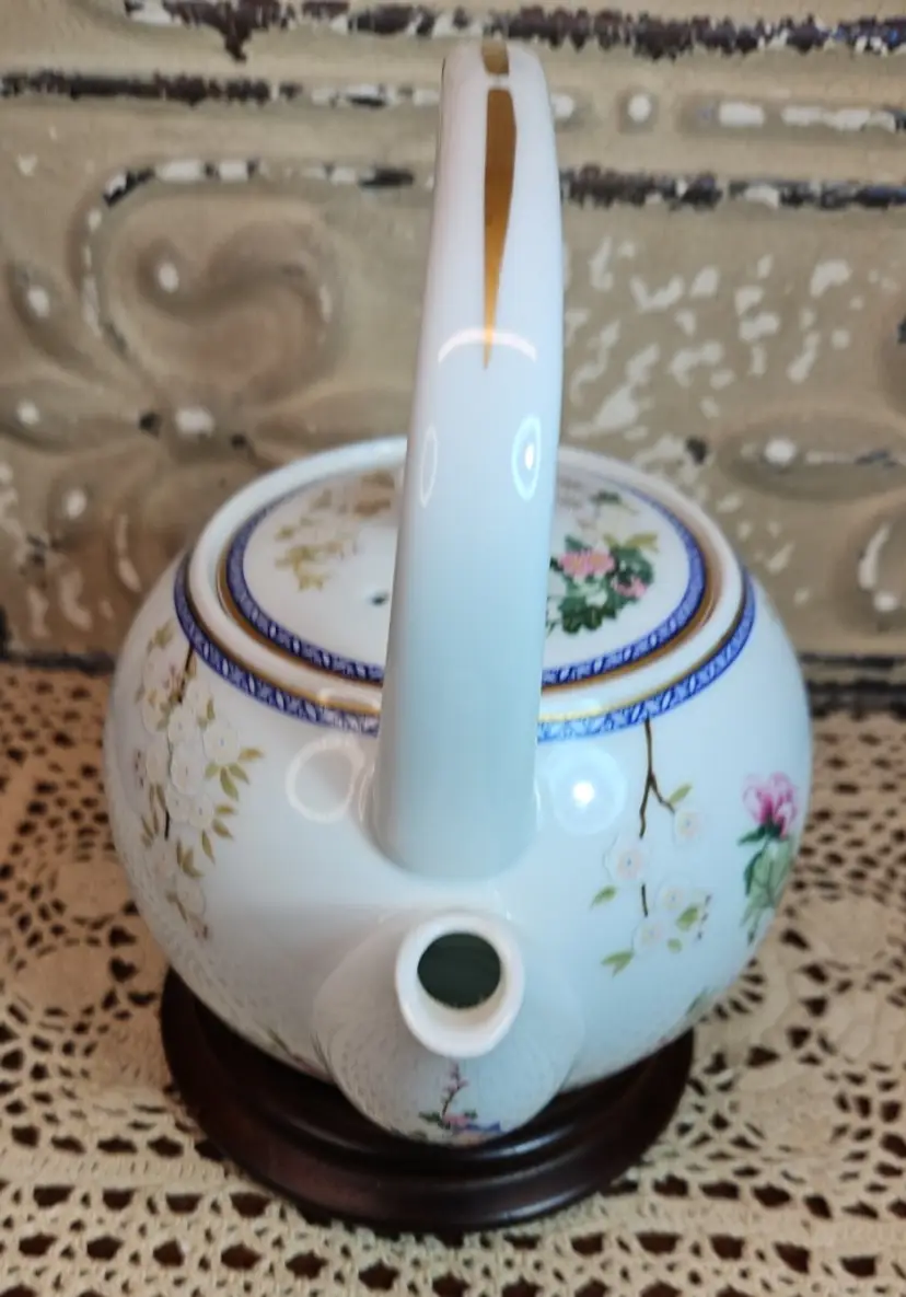 This beautiful teapot is in excellent, used condition, with no appreciable chips, scratches or cracks. Measurements are depicted in the pictures of the item or listed in the description of the item. Please review the photos, as they are part of the item description. Please note that any props used in the photos are not included in the purchase, unless otherwise indicated. Please note that this teapot will come with its wooden base and a CoA.