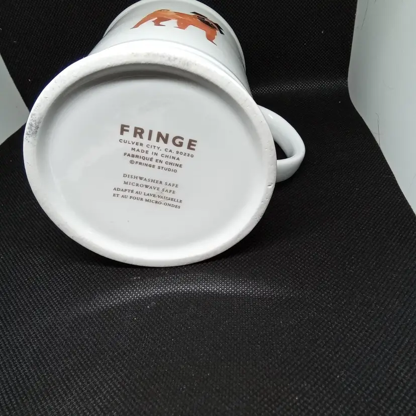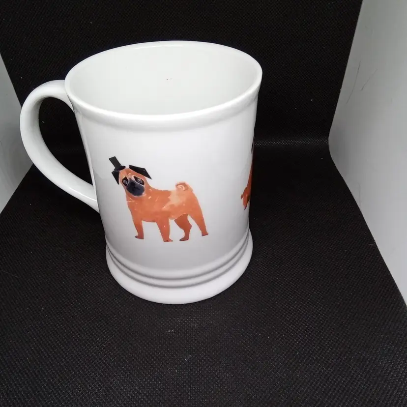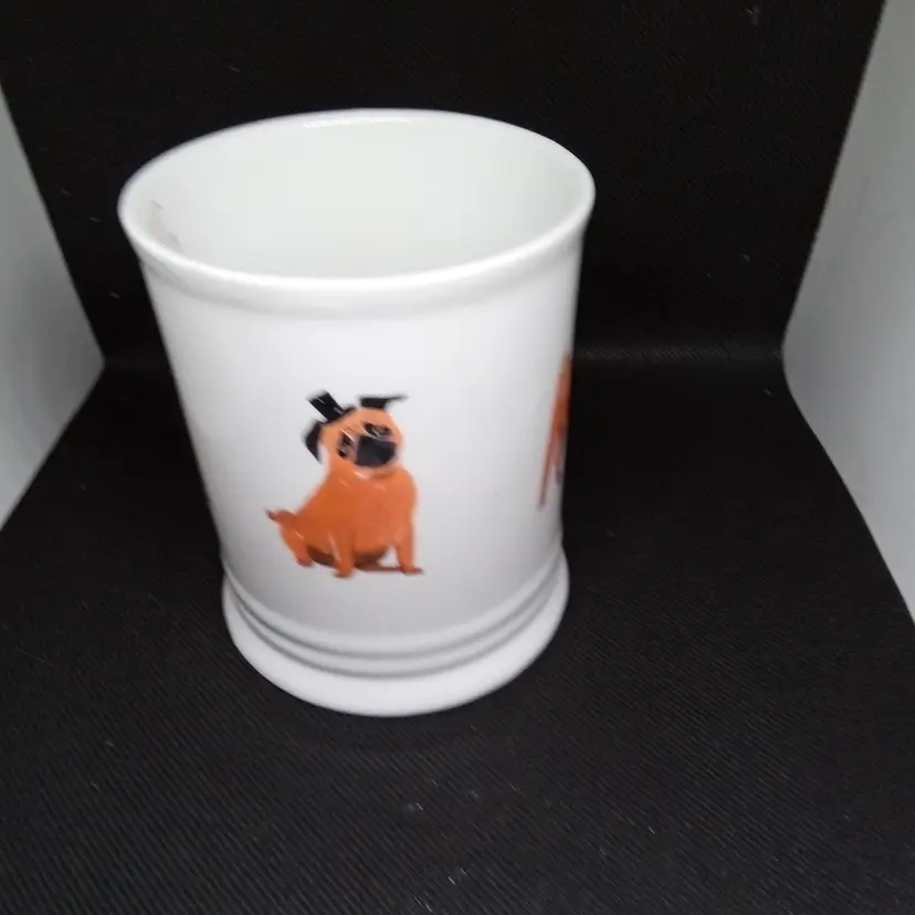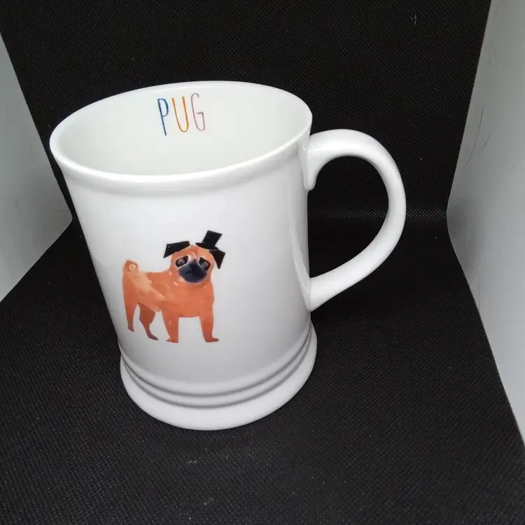Pug coffee cup measures 5 inces high. 3 1/2 in es across. Has 3 pugs on it , 1 on each side and t by e word pug when you drink...So cute. If shipping is less I will refund differnce