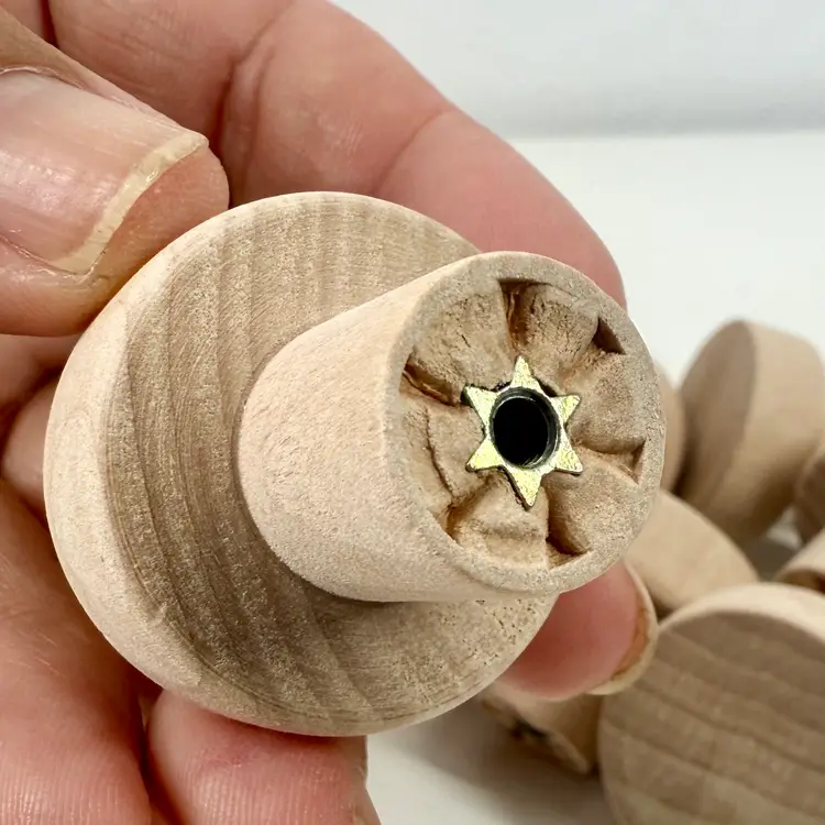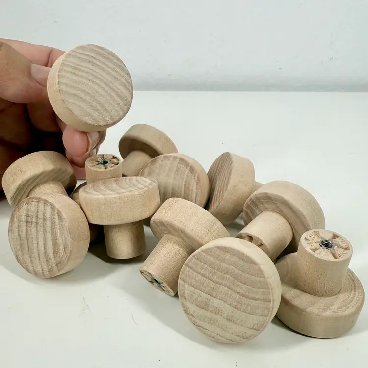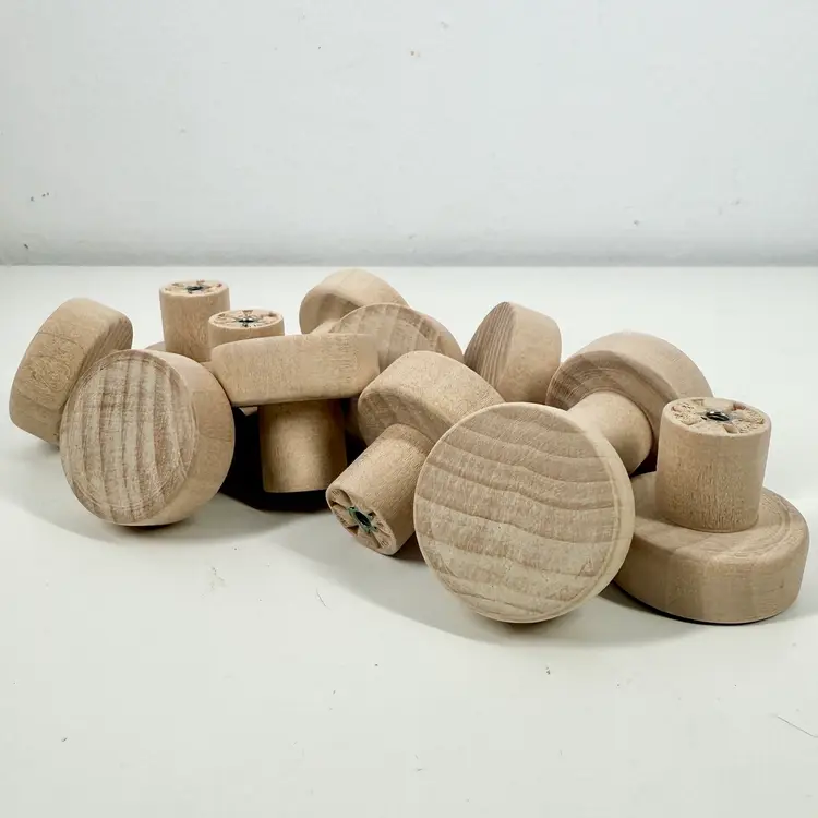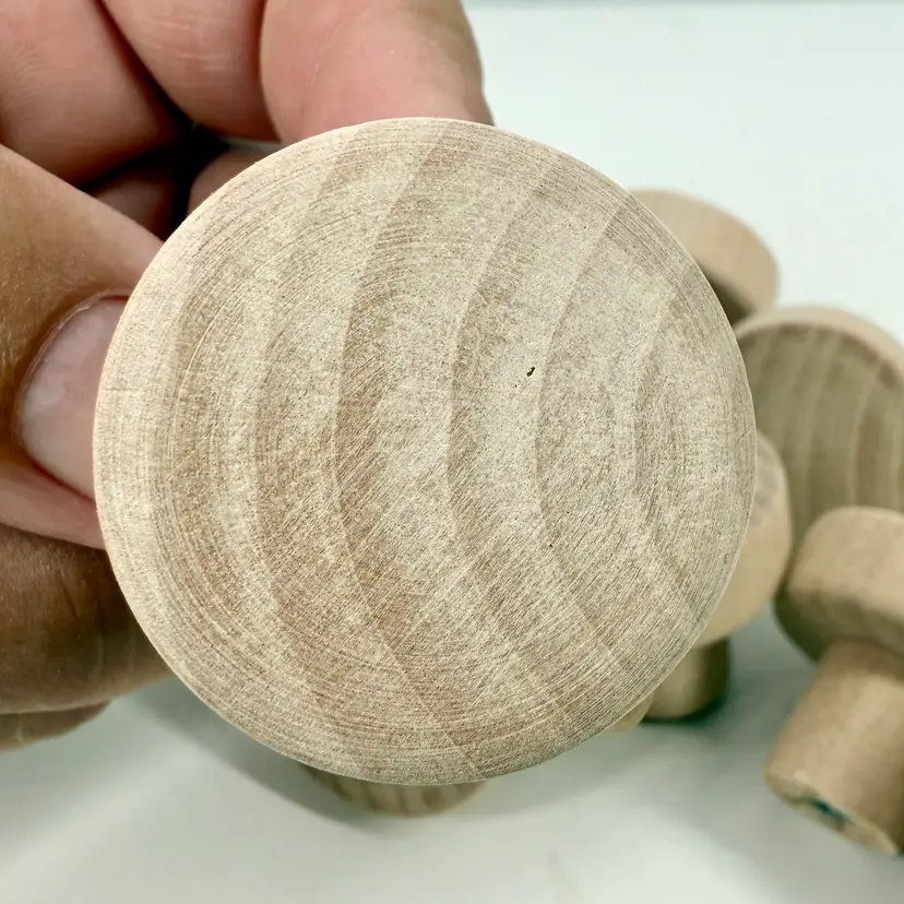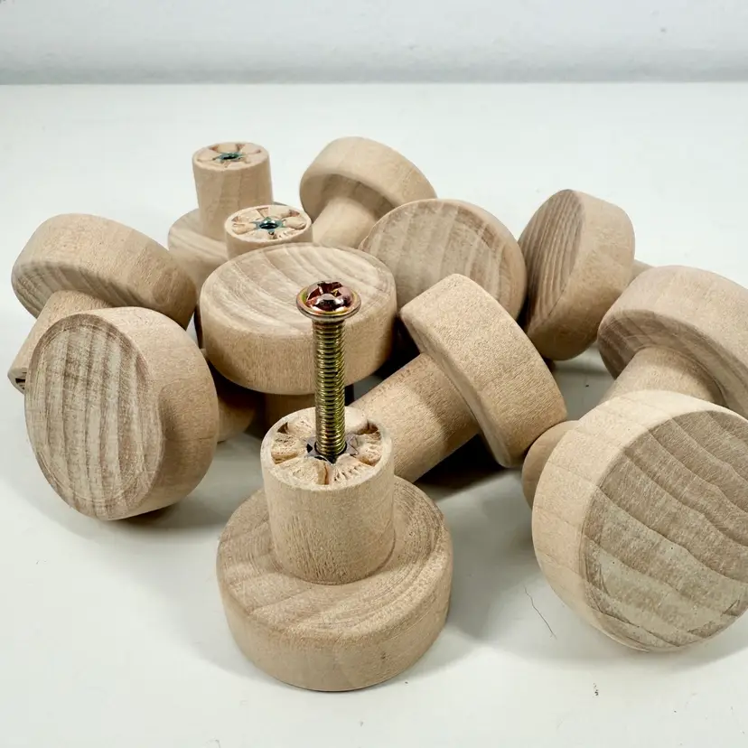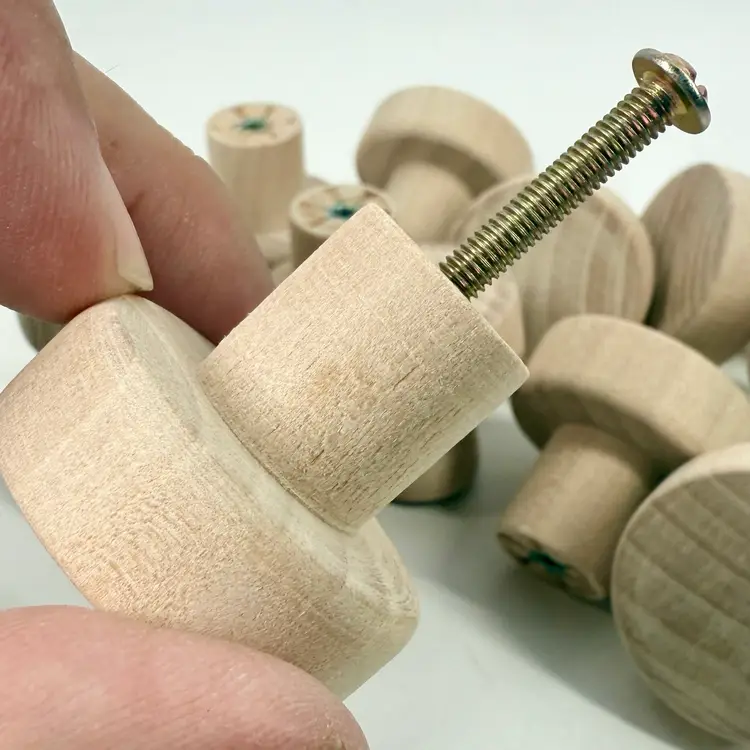 Ready to be painted or lacquered, one dozen (12) flat topped little wooden knobs/pulls come with a 1” long mounting screw and are ready to be put to use. Each knob measures 1 1/4” across by 1 1/8” in depth. All mounting screws are 1” in depth by 1/8” in thickness.