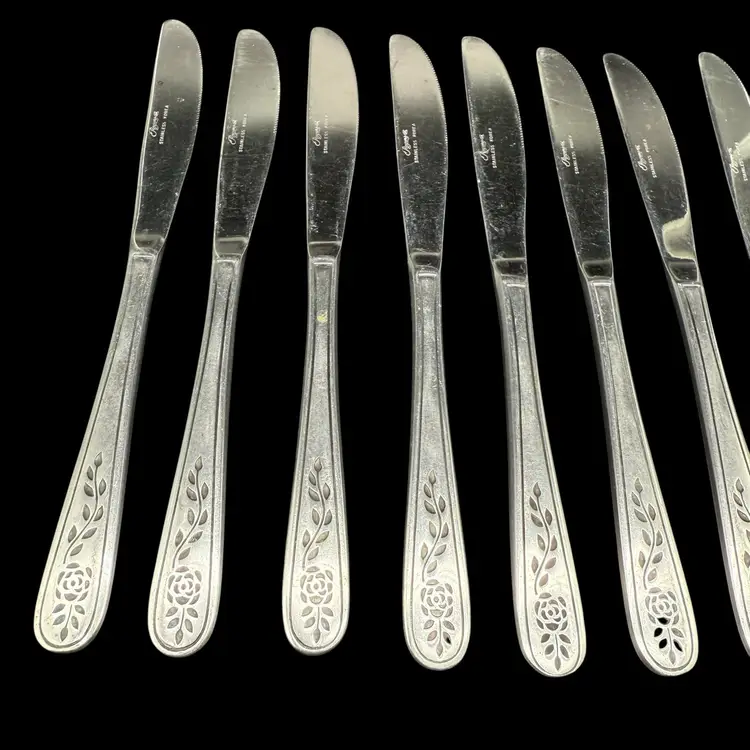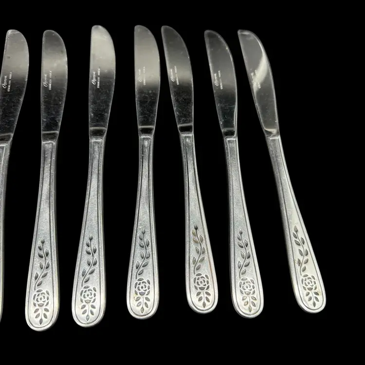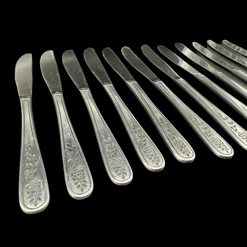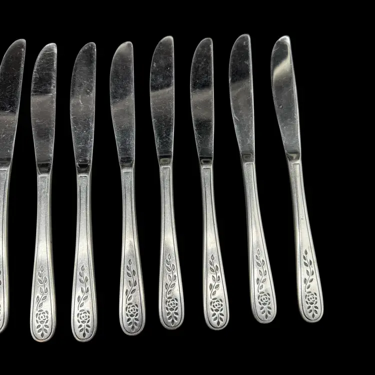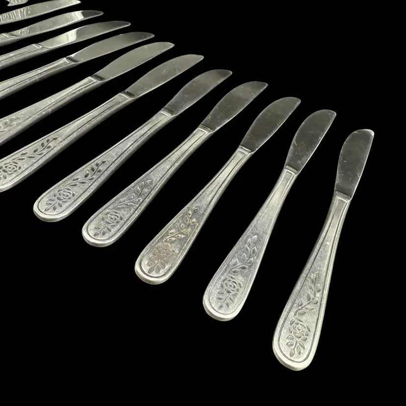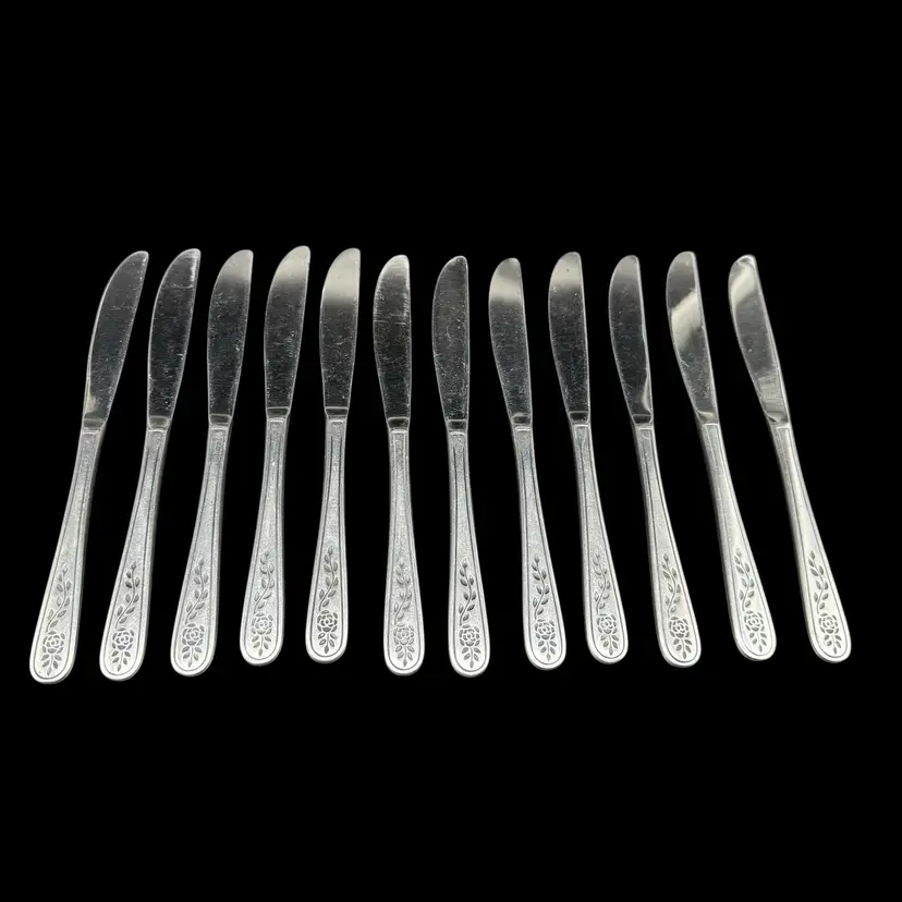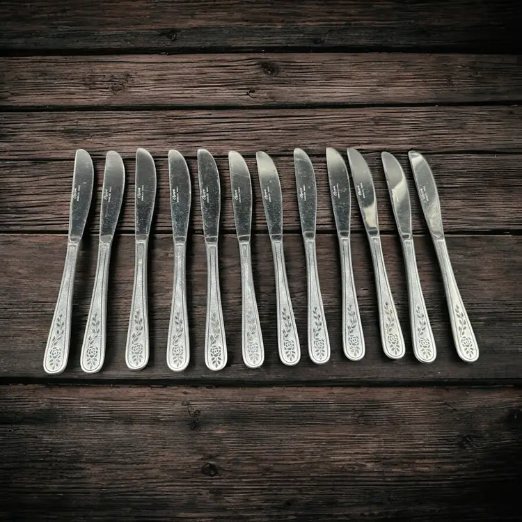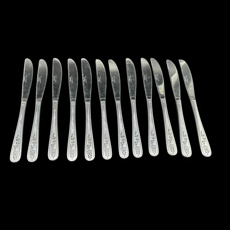 This product is a set of 12 Rogers Co Floral Mist butter table knives made of stainless steel. The knives have a satin silver finish with a flower pattern on the handle, in a Mid-Century Modern style. They are dishwasher safe and measure 8.5 inches in length. These knives are perfect for any occasion. Made in Korea, Republic of, they add a touch of elegance to any dining table.