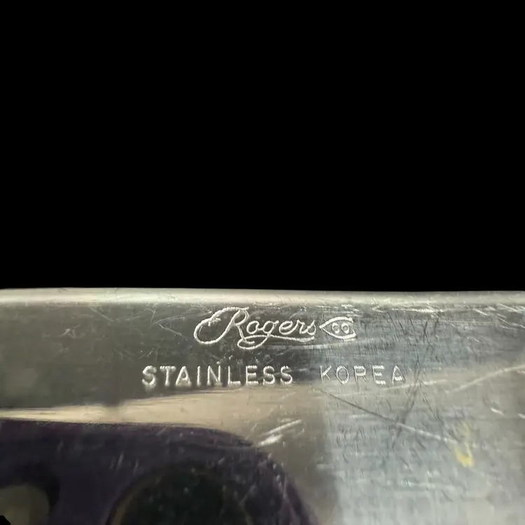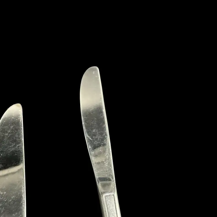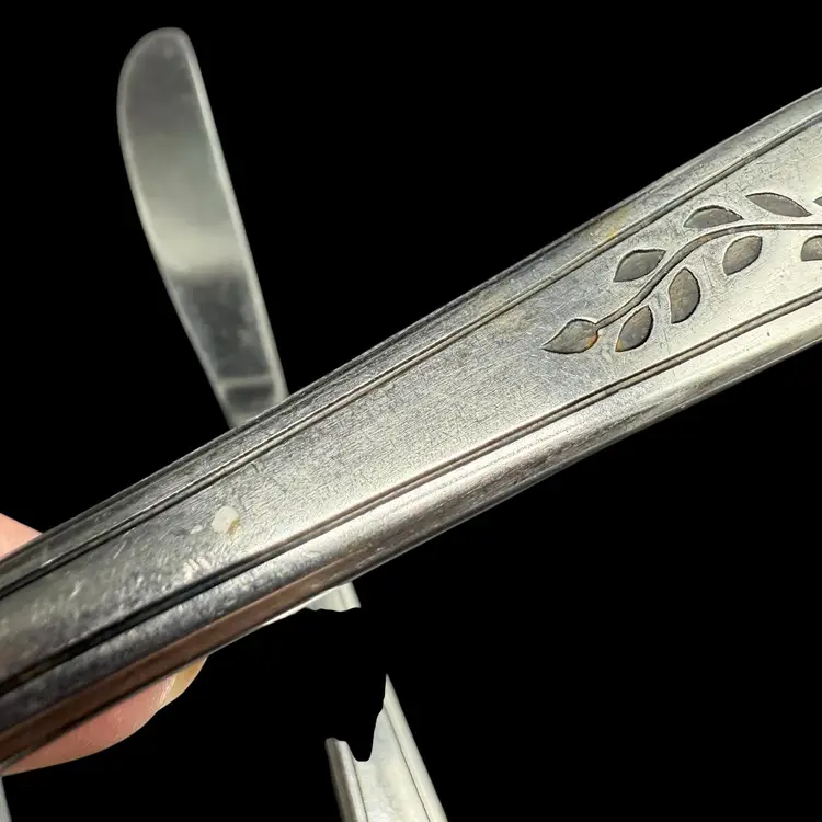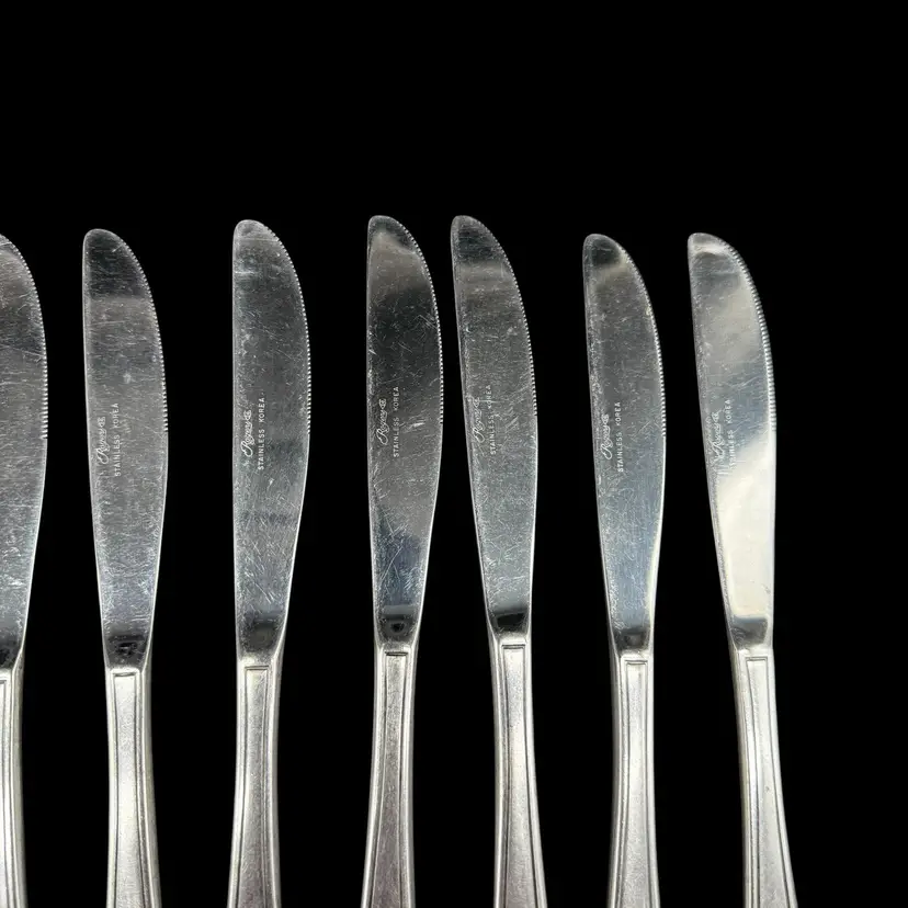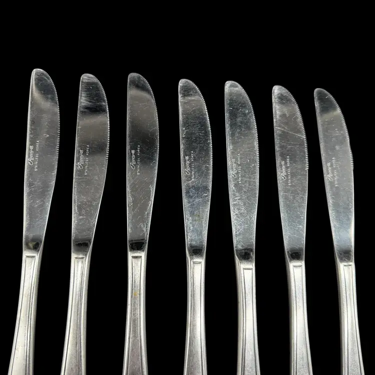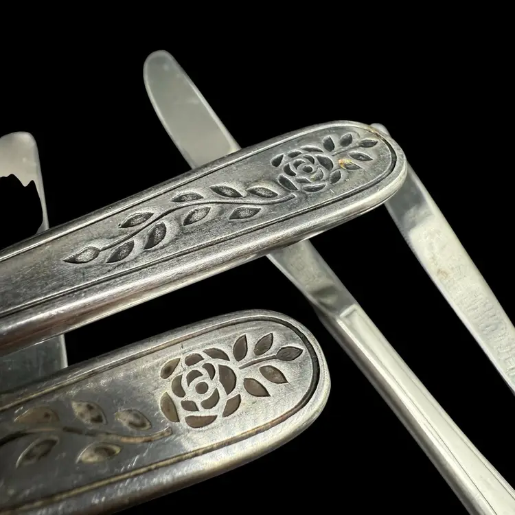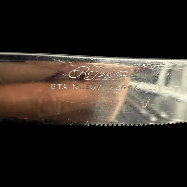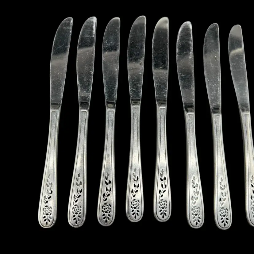 This product is a set of 12 Rogers Co Floral Mist butter table knives made of stainless steel. The knives have a satin silver finish with a flower pattern on the handle, in a Mid-Century Modern style. They are dishwasher safe and measure 8.5 inches in length. These knives are perfect for any occasion. Made in Korea, Republic of, they add a touch of elegance to any dining table.