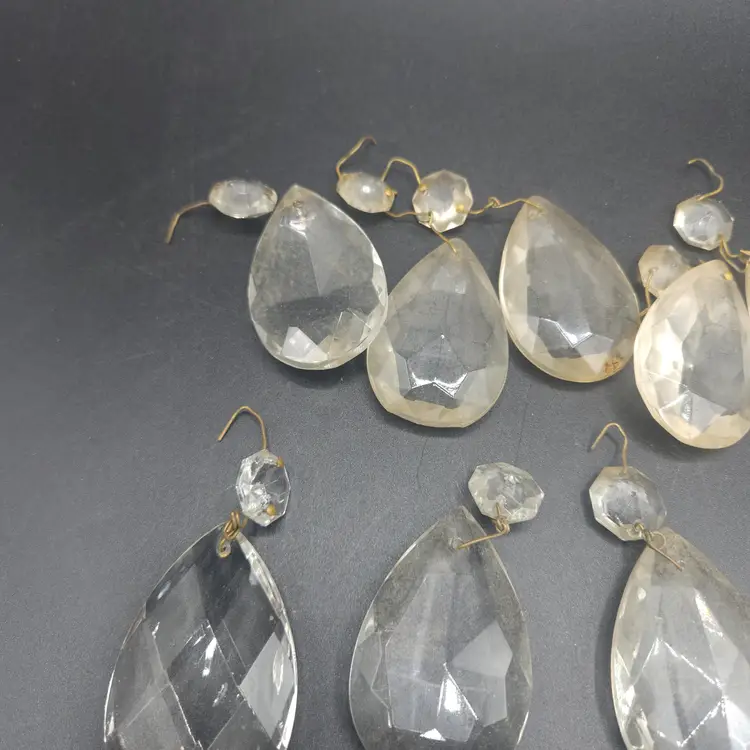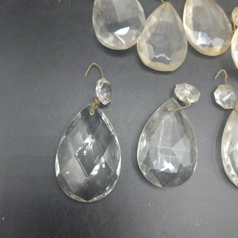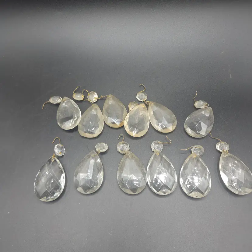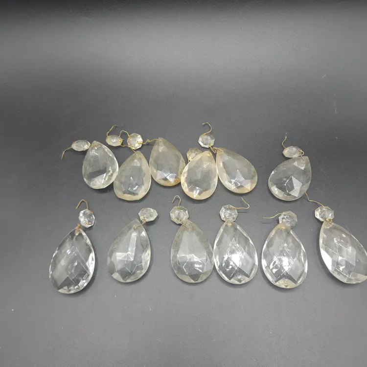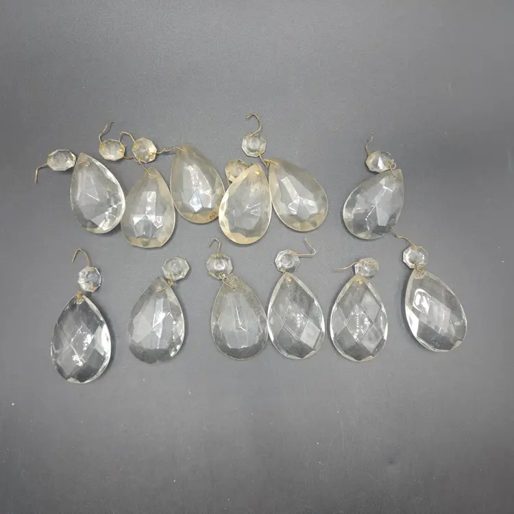12 Vintage 2" Full-Cut Almond Teardrop Crystal Chandelier Prisms Two-Piece. Good condition, no cracks or chips. They are 2 piece and all have the wires for hanging. 2.5" long with both pieces.