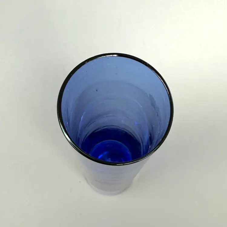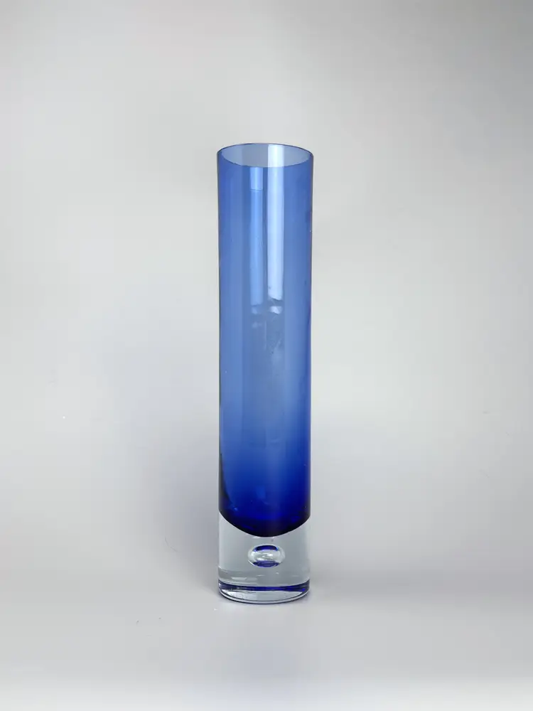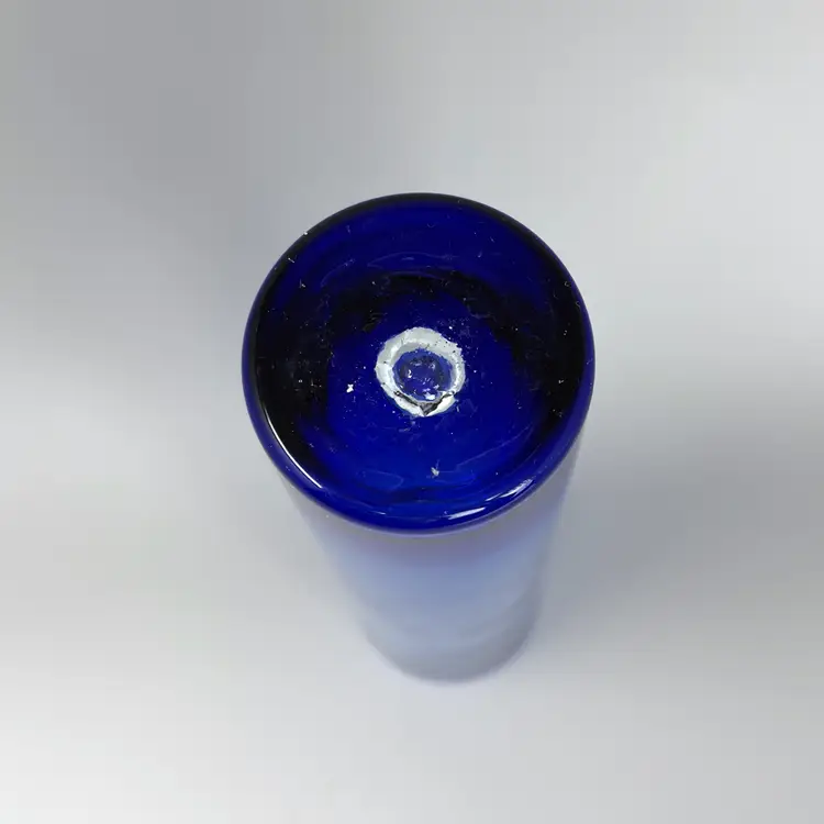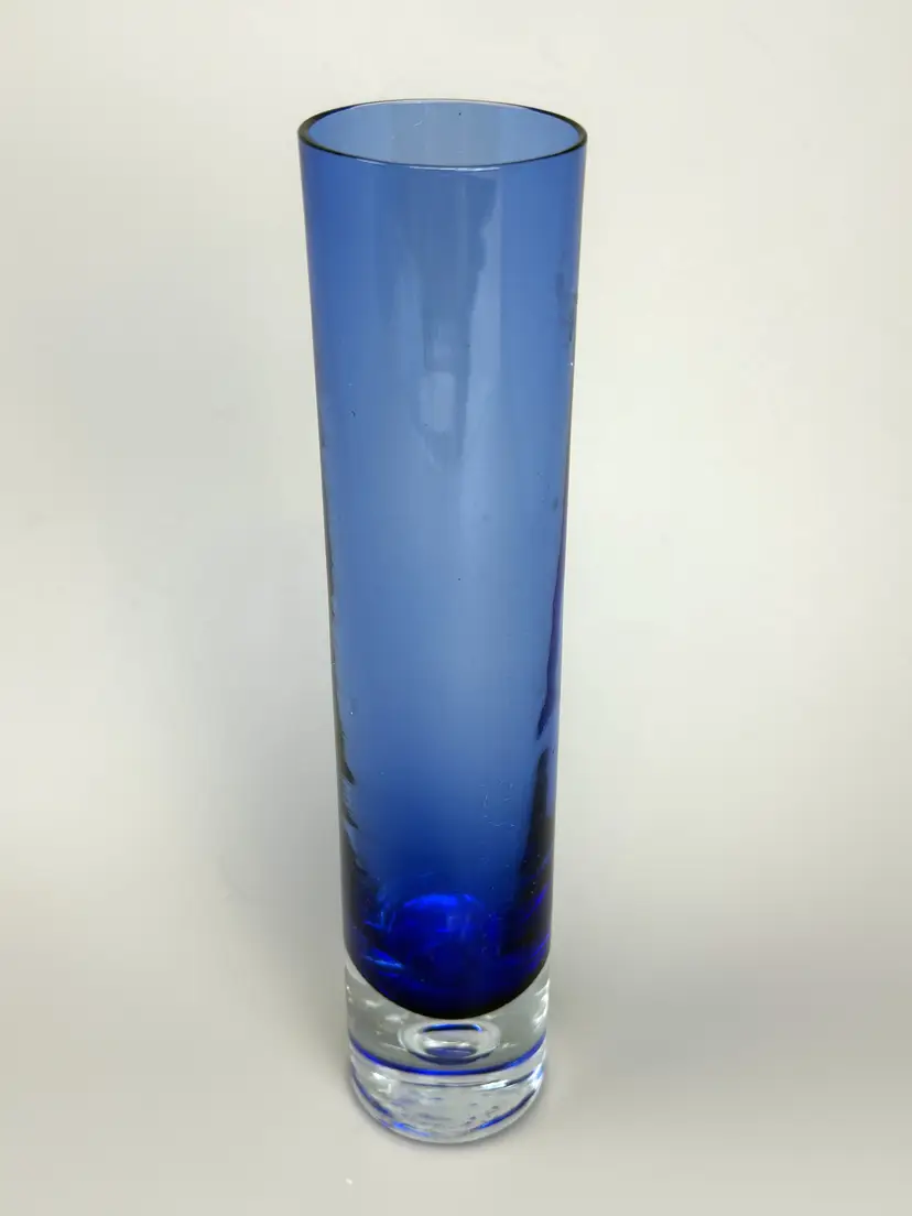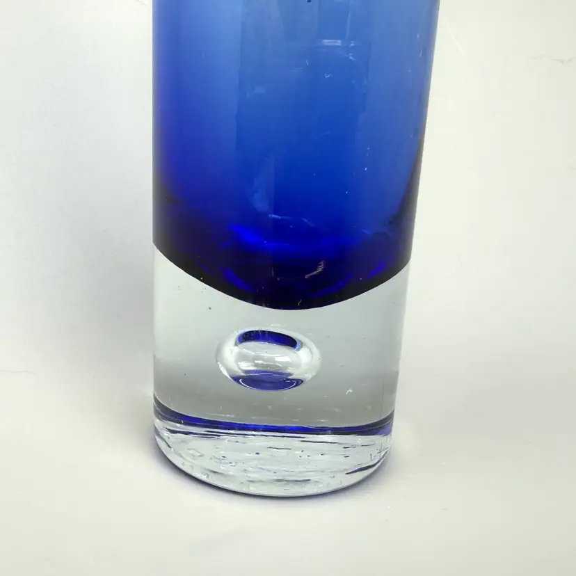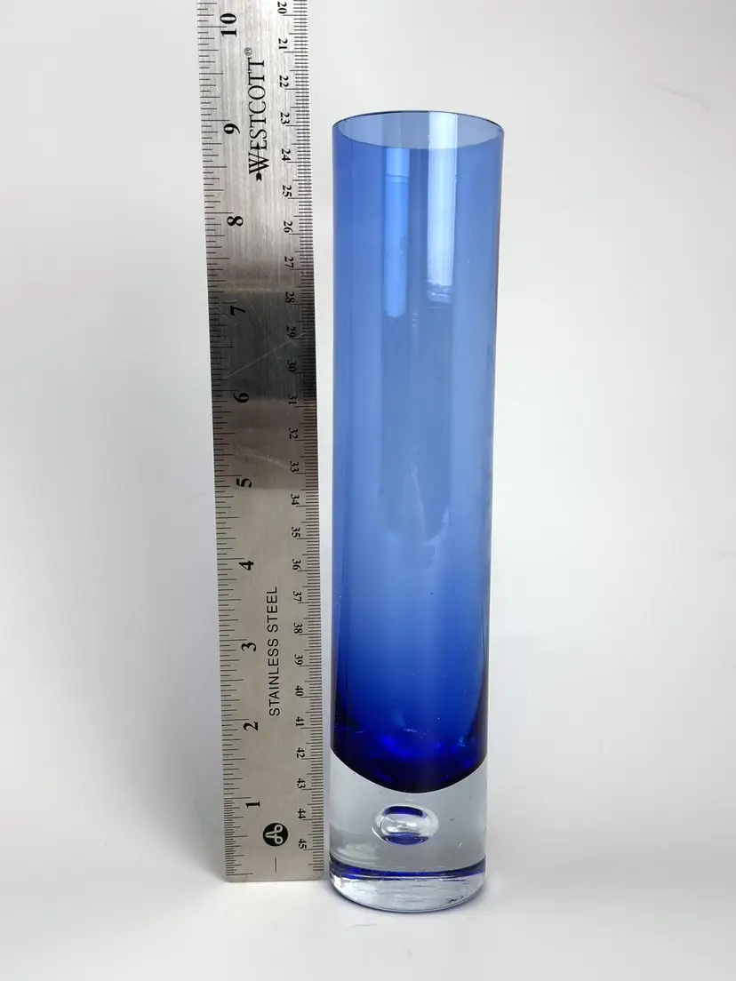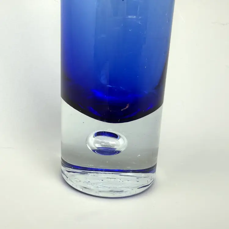 DETAILS: • Manufacturer: Unknown artisan (hand-blown) • Design / Pattern: Cylindrical bud vase with clear glass weighted base and controlled bubble inclusion • Markings: None visible • Country of Origin / Where manufactured: Likely USA or Europe (common styles seen in both regions mid-late 20th century) • Date/Era: Circa 1960s–1980s • Design Style: Mid-Century Modern / Scandinavian-inspired art glass • Materials: Hand-blown glass • Color(s): Cobalt blue with clear base • Dimensions: Height 9", Diameter 2", Weight 7 oz • Condition: Excellent, no chips, cracks, or scratches