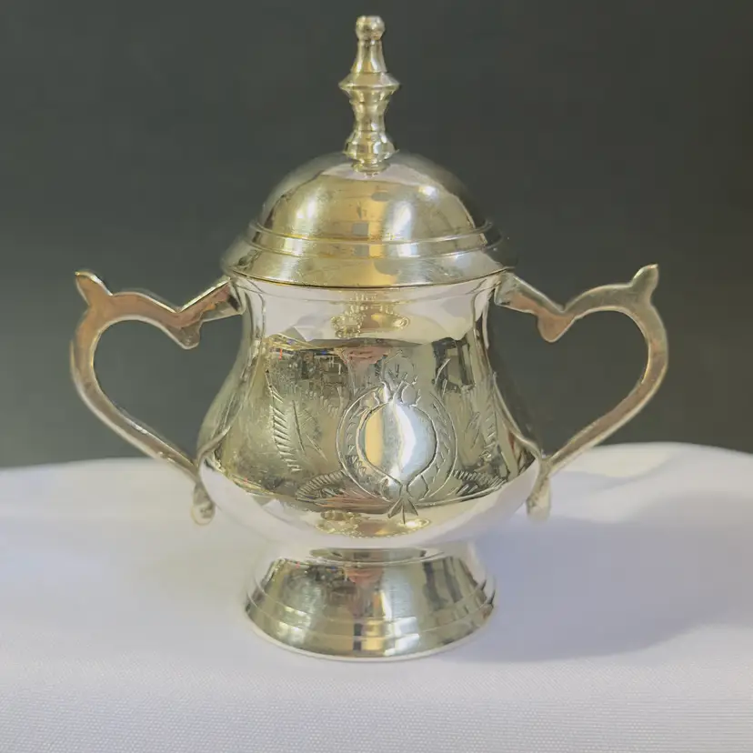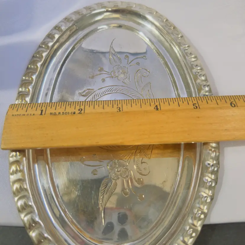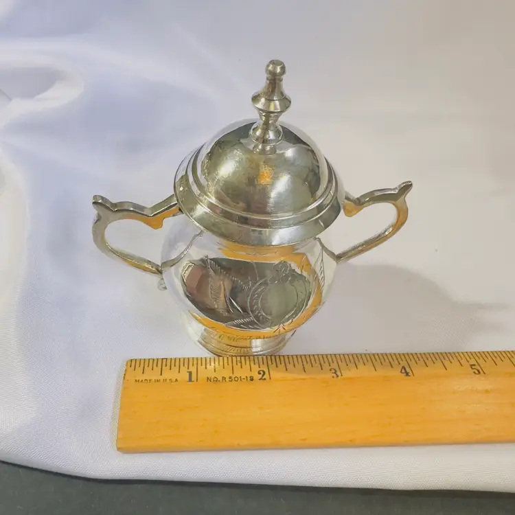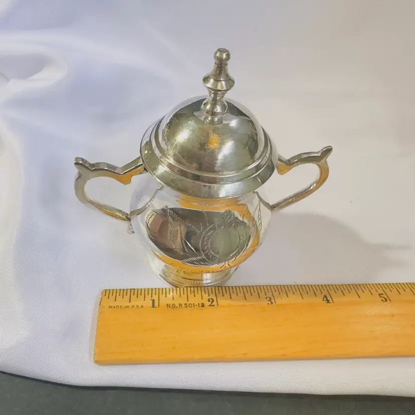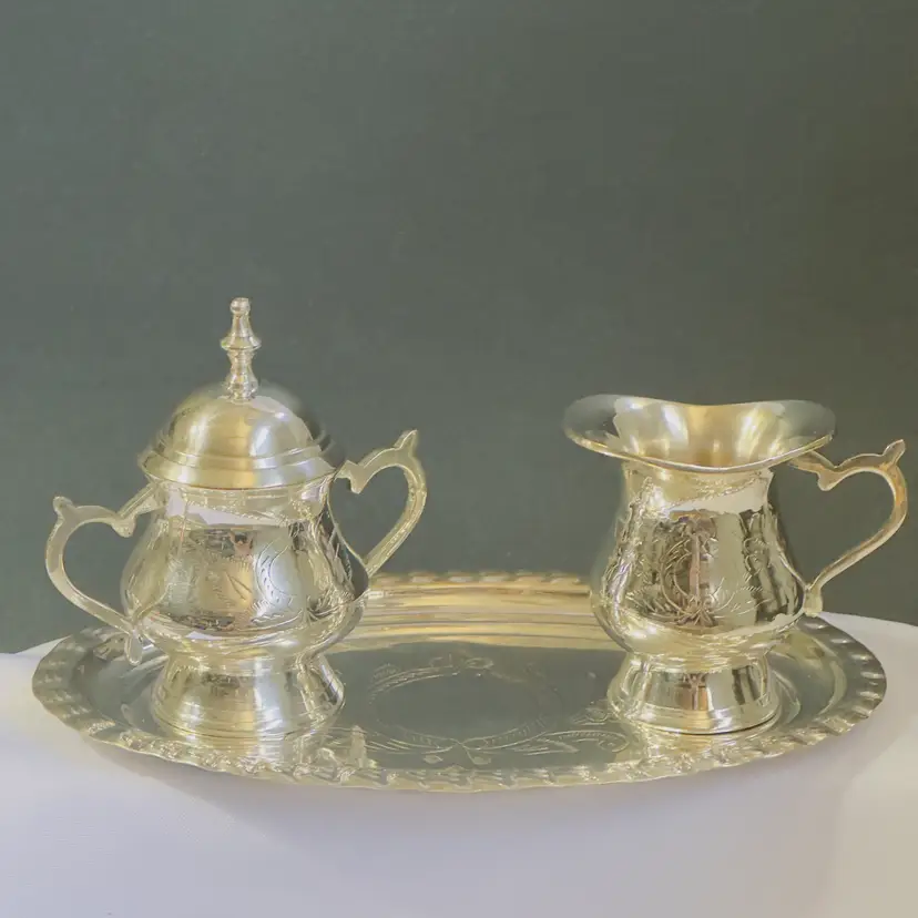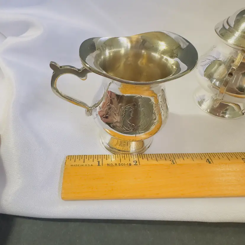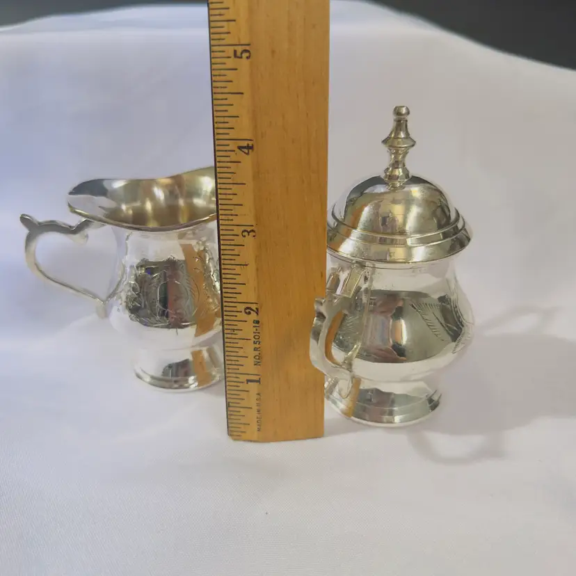 Tray 8.5x5.5, Sugar is 4x4 and Creamer 3x3, 14oz, there are some marks, scratches on the tray and jugs due to age and use