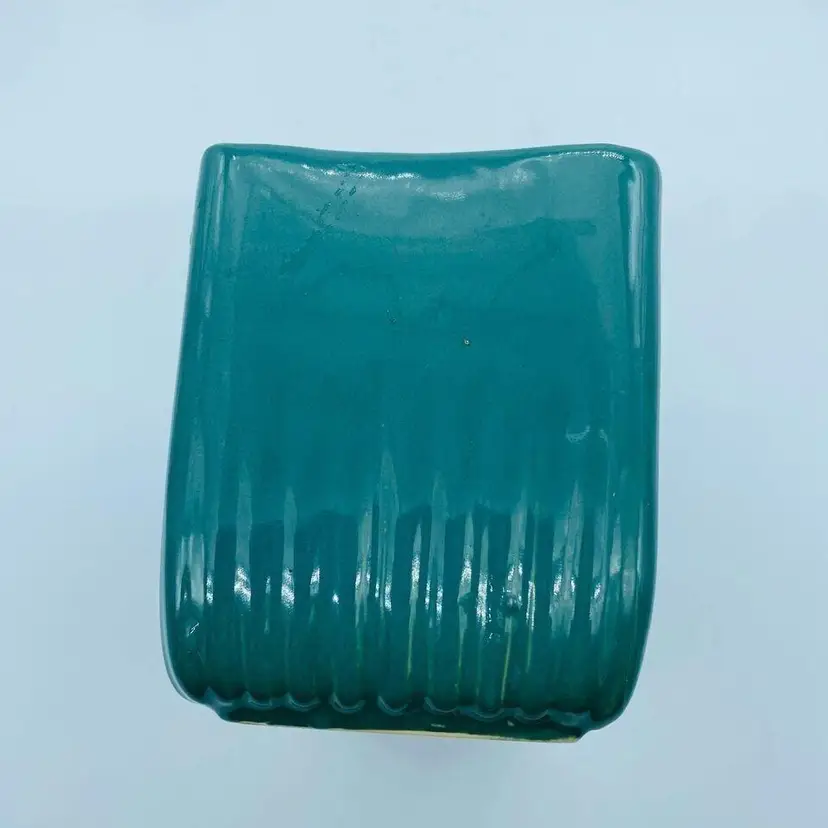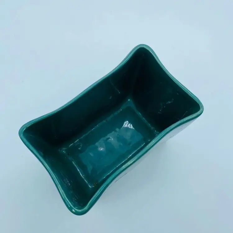 Vintage McCoy USA rectangle green planter Approx 5 x 3 inches at base. Iregular shape at top. Ribbed texture. Green Glaze. In vintage used condition. In 1933 the company was called Nelson McCoy Pottery Co. The business closed its doors in 1990. This is a nice little retro planter that still has lots of life left for home or garden decor. Nice acquisition for the McCoy collector