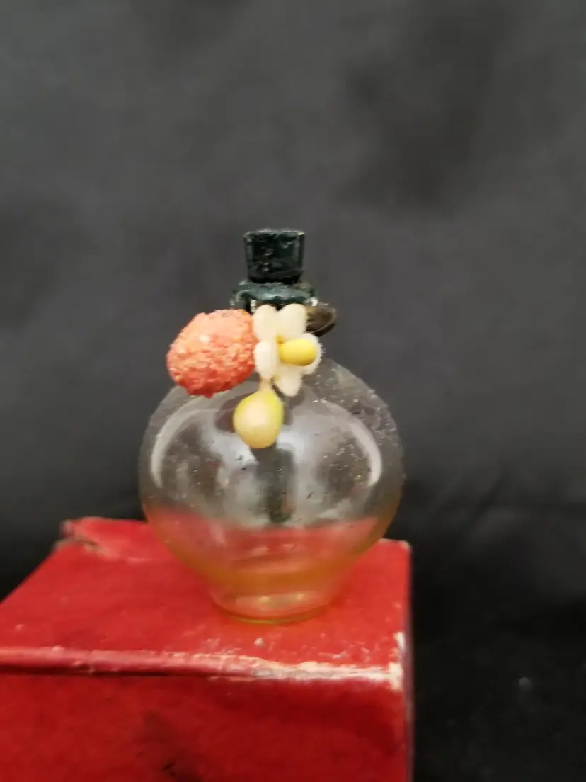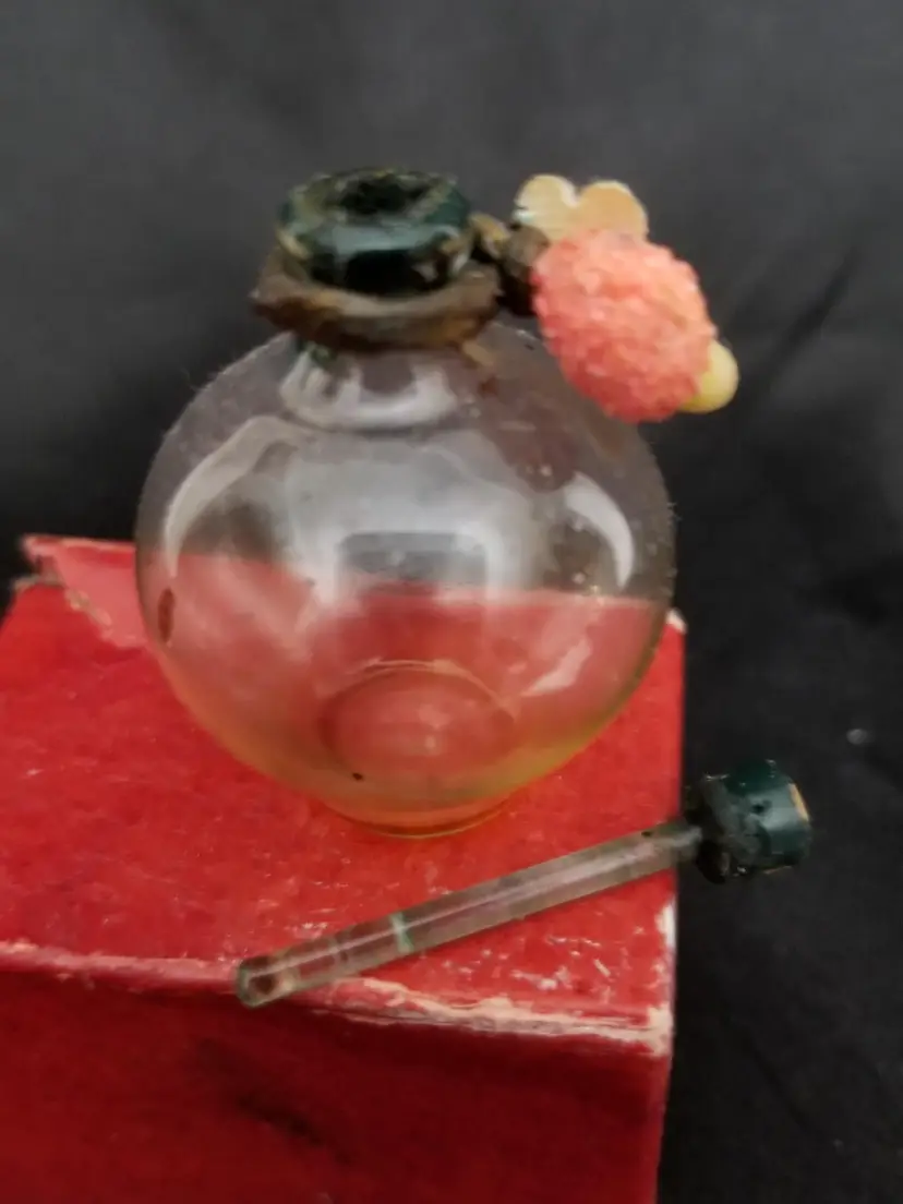Vintage Mini Blown Glass Perfume Bottle with Dauber is 1 5/8" tall. It has an interesting flower arrangement twisted around the top and the tiniest glass dauber I've ever seen.