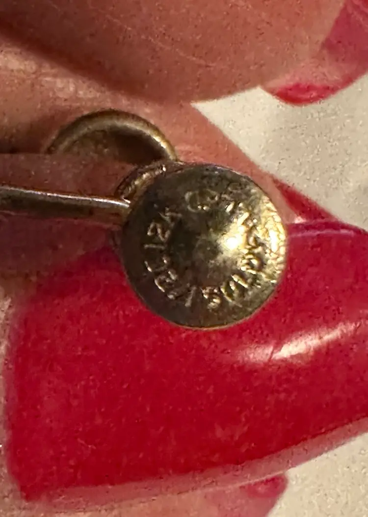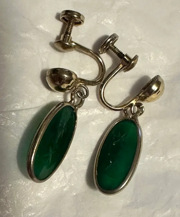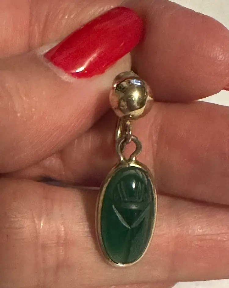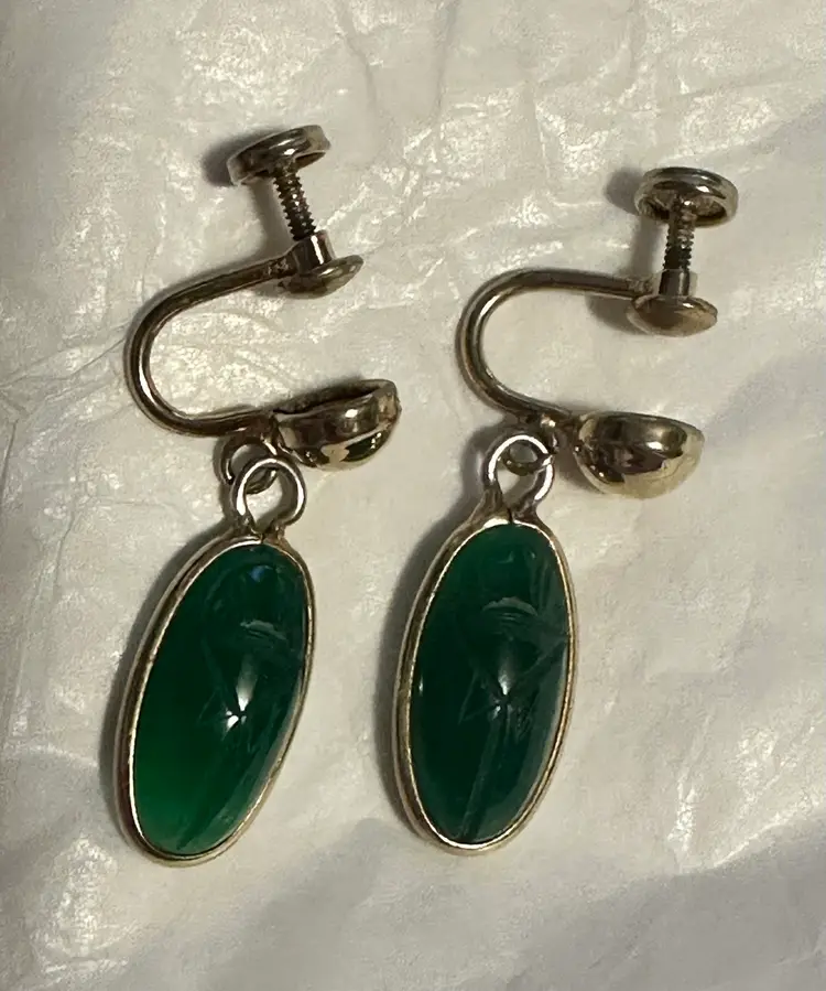 Great pair of vintage scarab earrings. They are 12k gf with carved green onyx oval scarabs. They measure 1.25”. Very good condition.