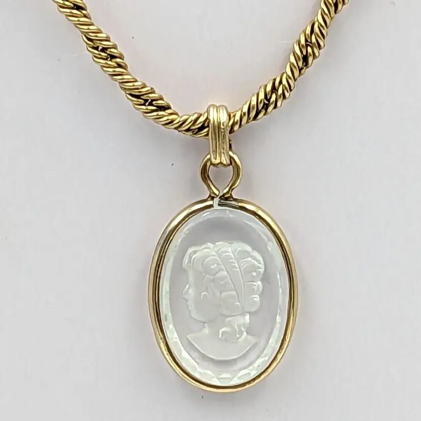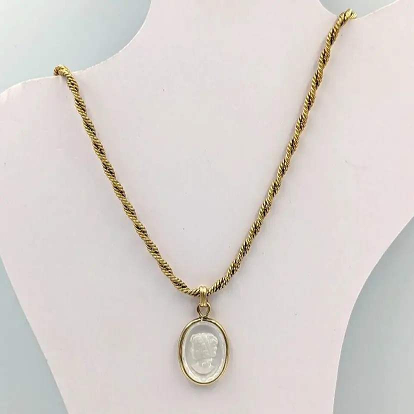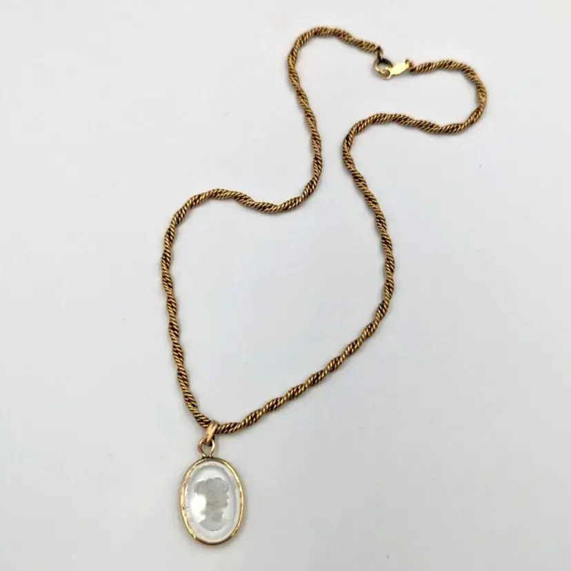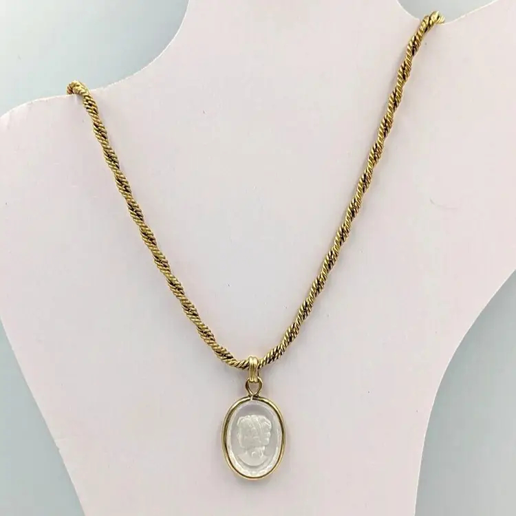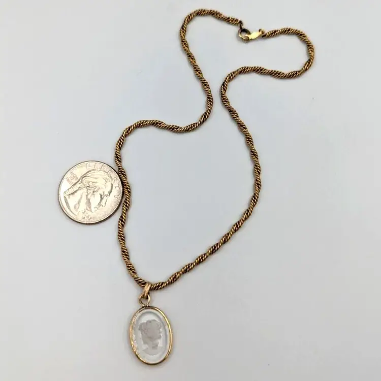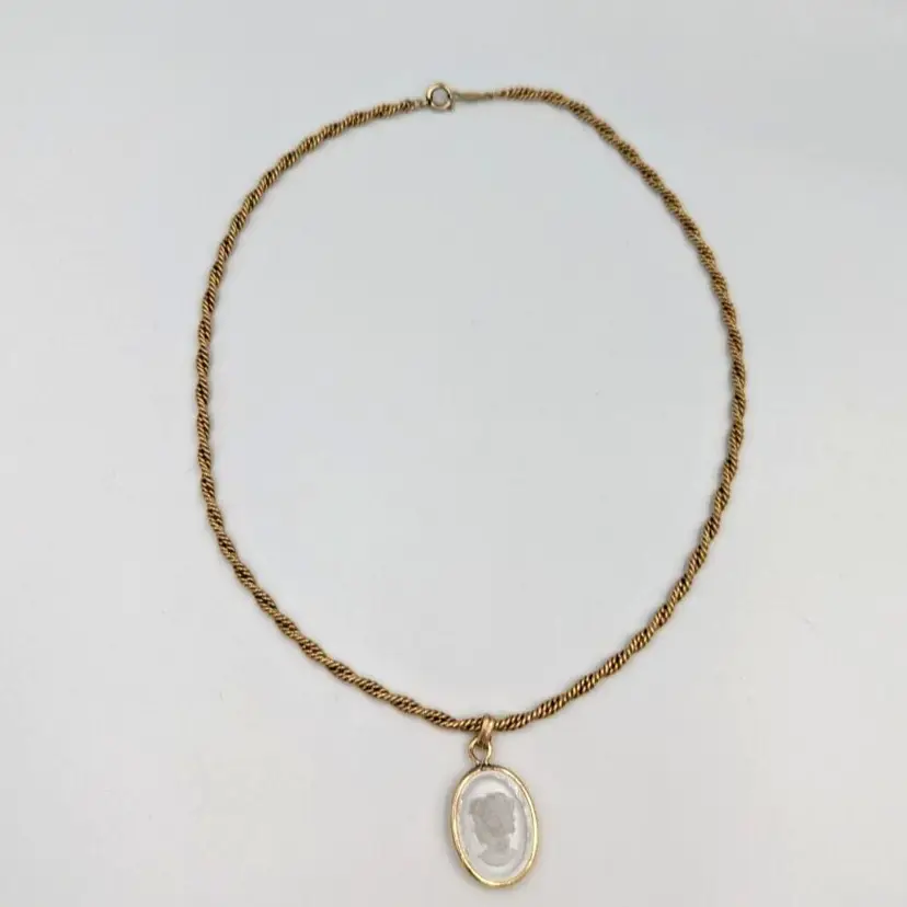 12K Gold Filled Fancy Twist Chain Clear Glass Intaglio Pendant Vintage Chain 14" long, Pendant 1" drop 9 grams total weight Marked 1/20 12K GF Good vintage condition