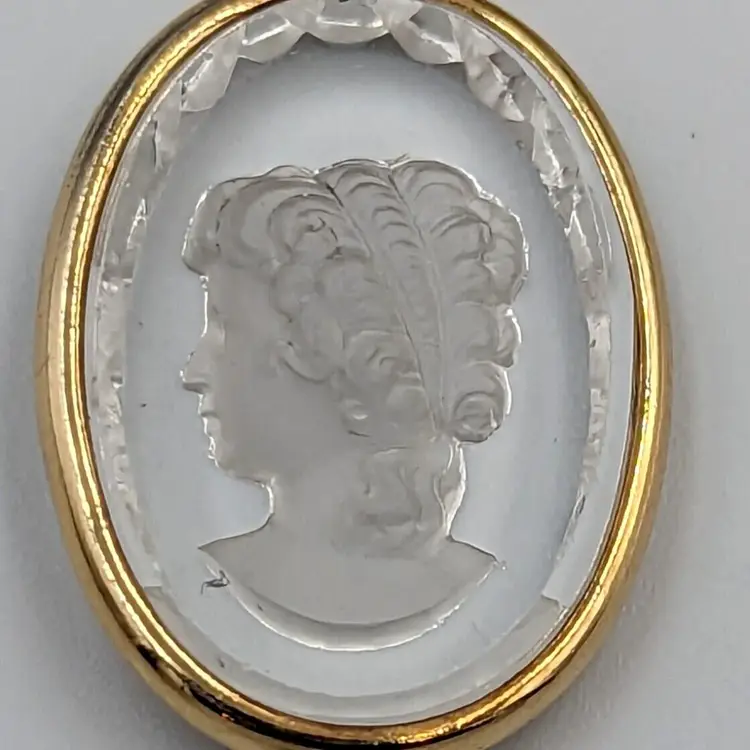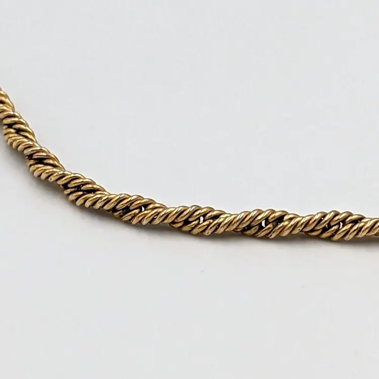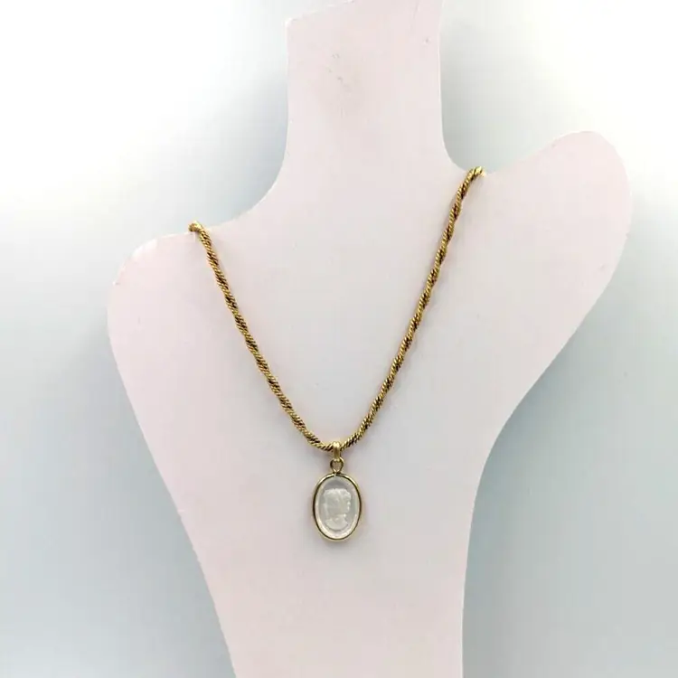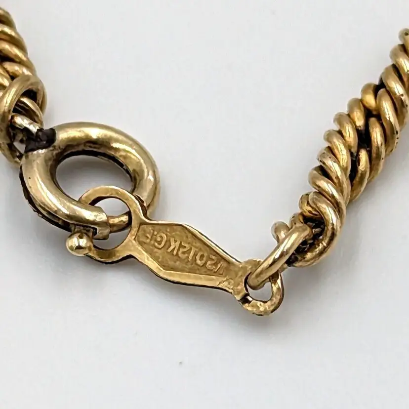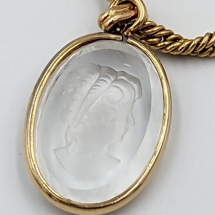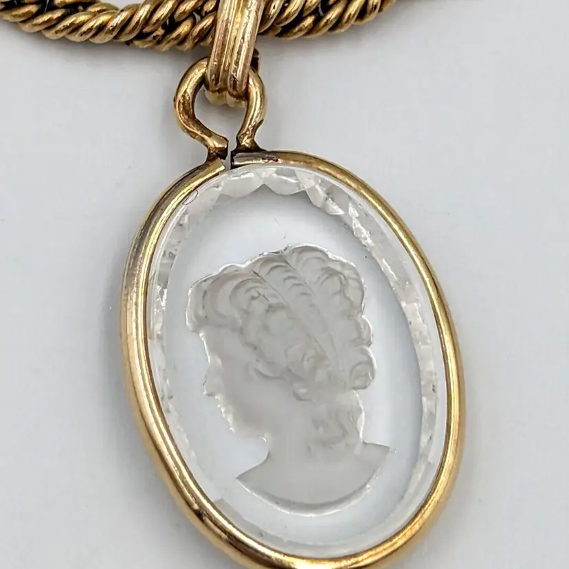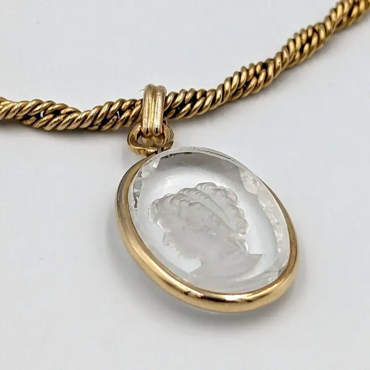 12K Gold Filled Fancy Twist Chain Clear Glass Intaglio Pendant Vintage Chain 14" long, Pendant 1" drop 9 grams total weight Marked 1/20 12K GF Good vintage condition