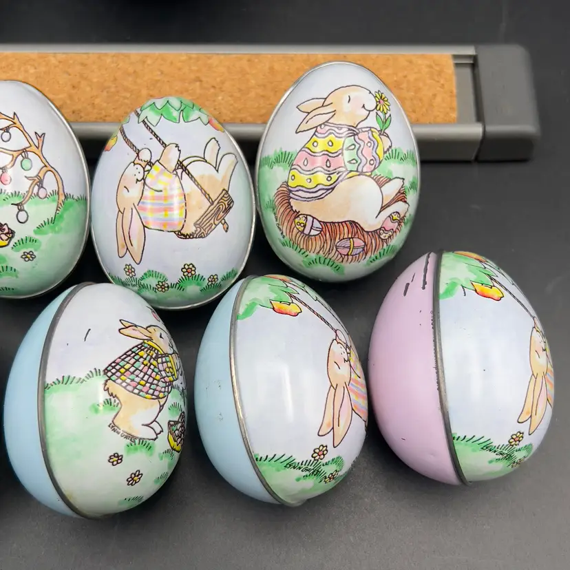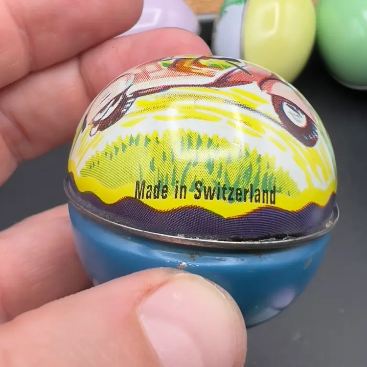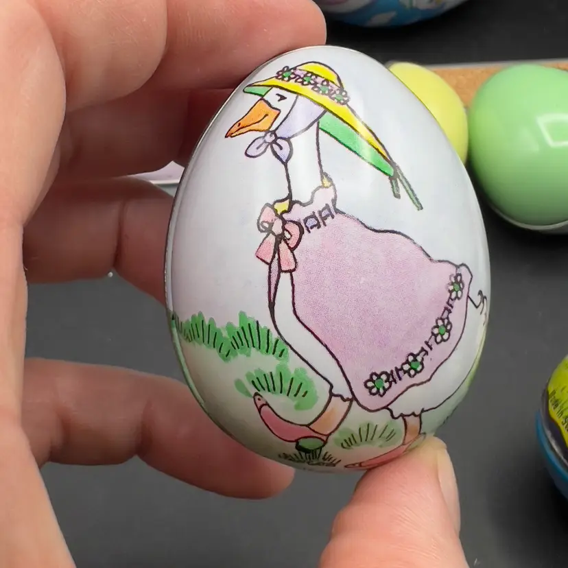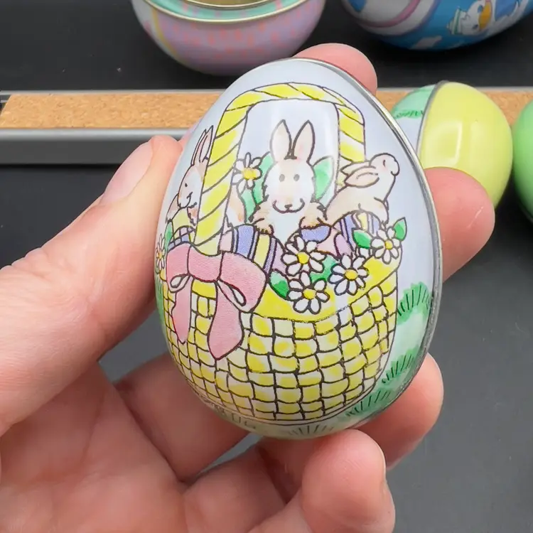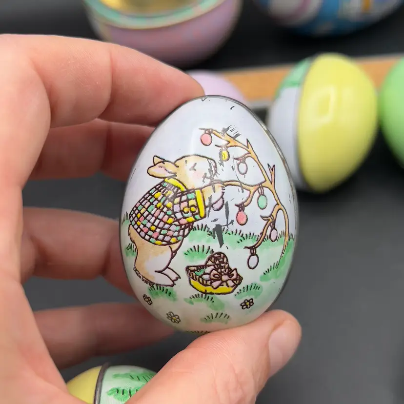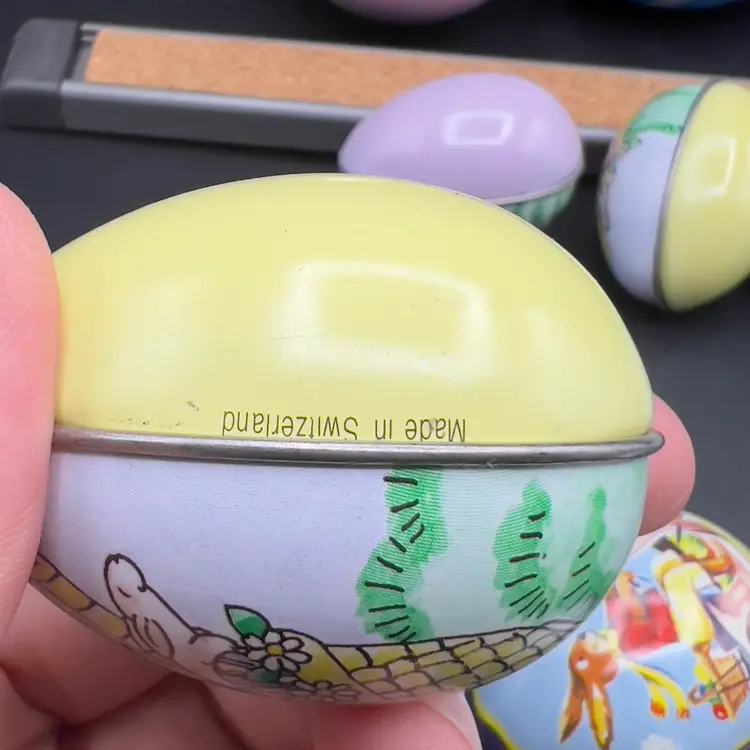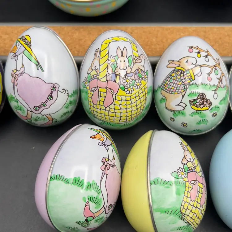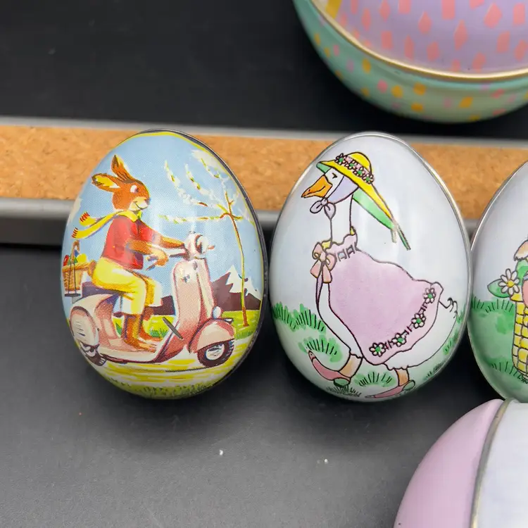 13 Decorated Metal Tin Easter Egg Candy Rabbit Goose Switzerland Lynn Gates A great assortment of vintage Easter treat eggs.