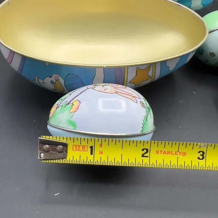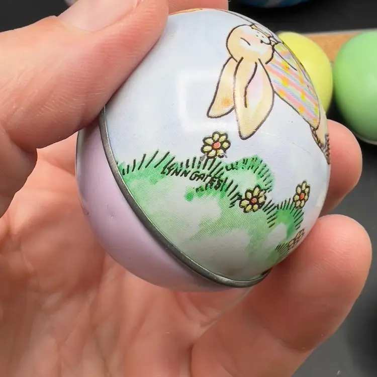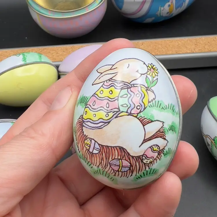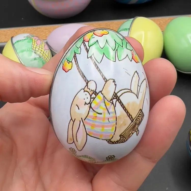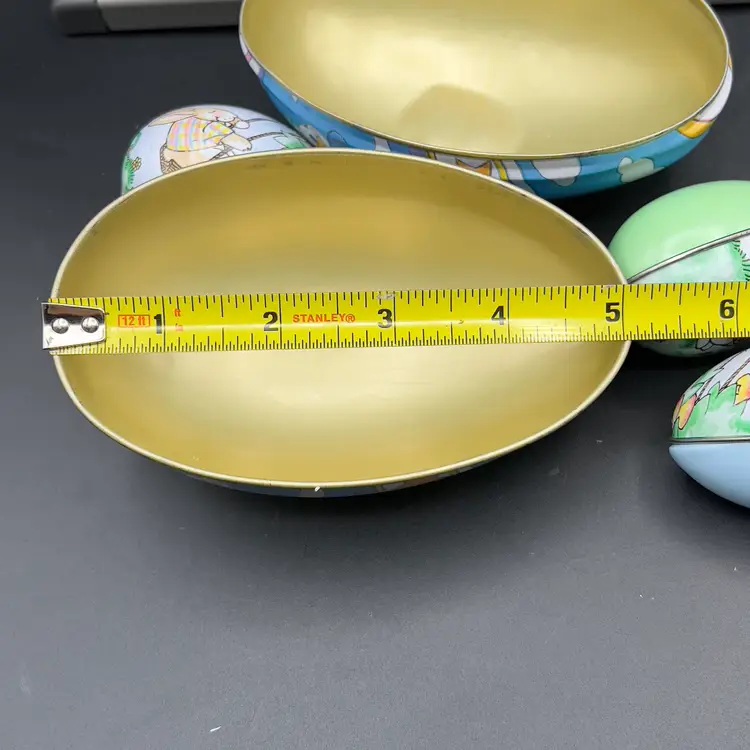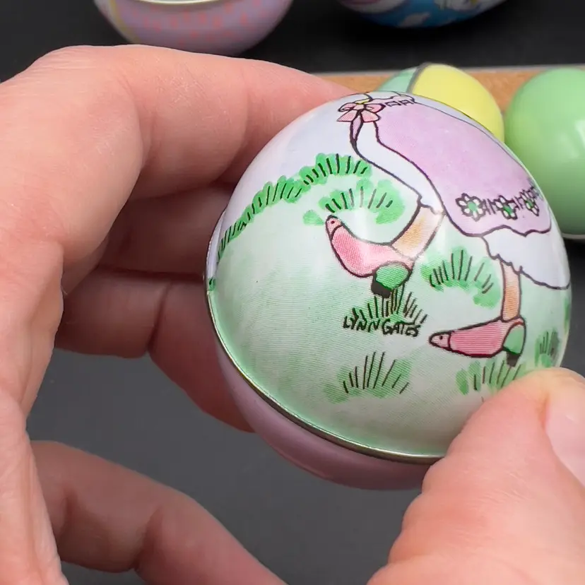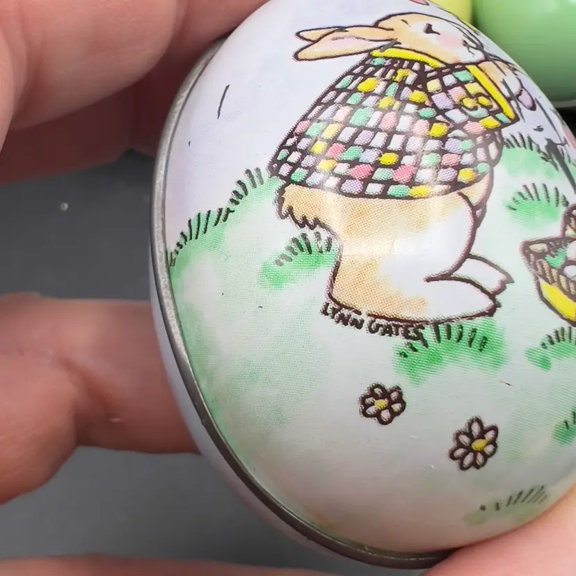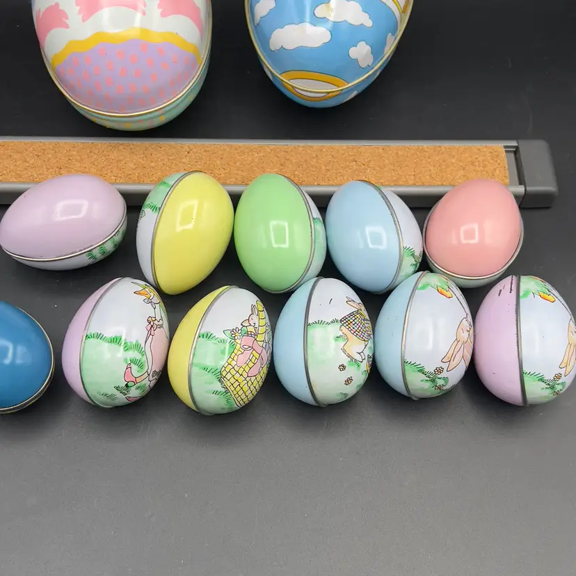 13 Decorated Metal Tin Easter Egg Candy Rabbit Goose Switzerland Lynn Gates A great assortment of vintage Easter treat eggs.