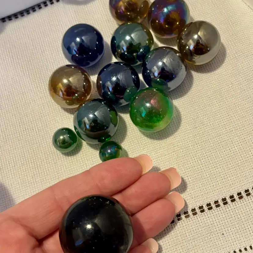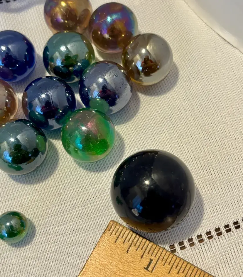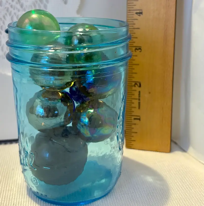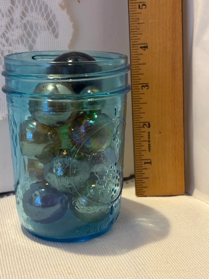 13 Iridescent glass marbles in blue jar 1- XL Shooter 10-Boulders 2-Small