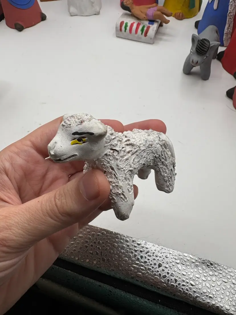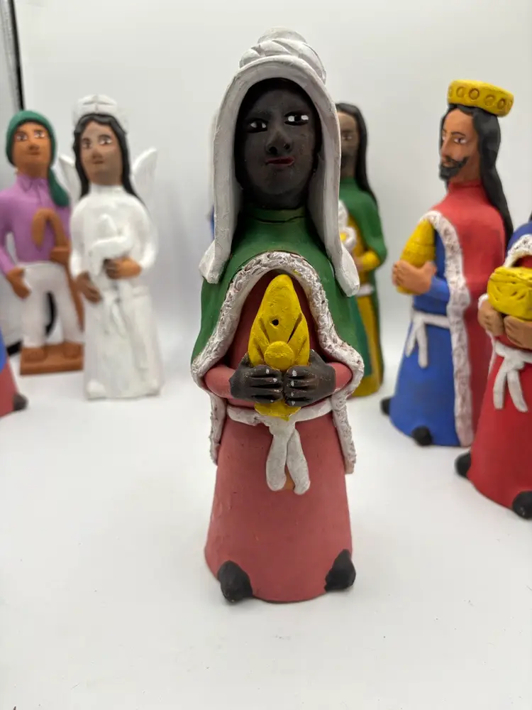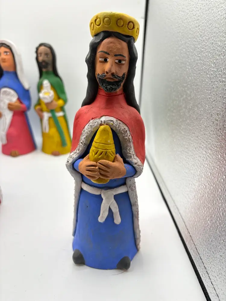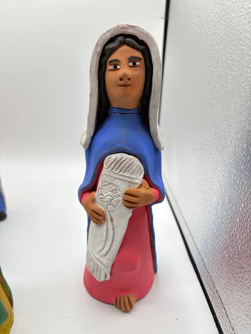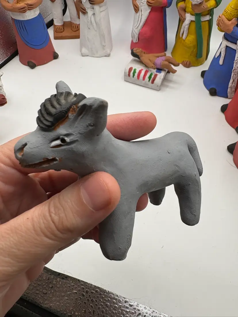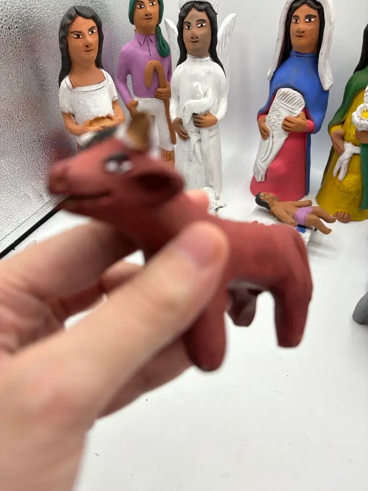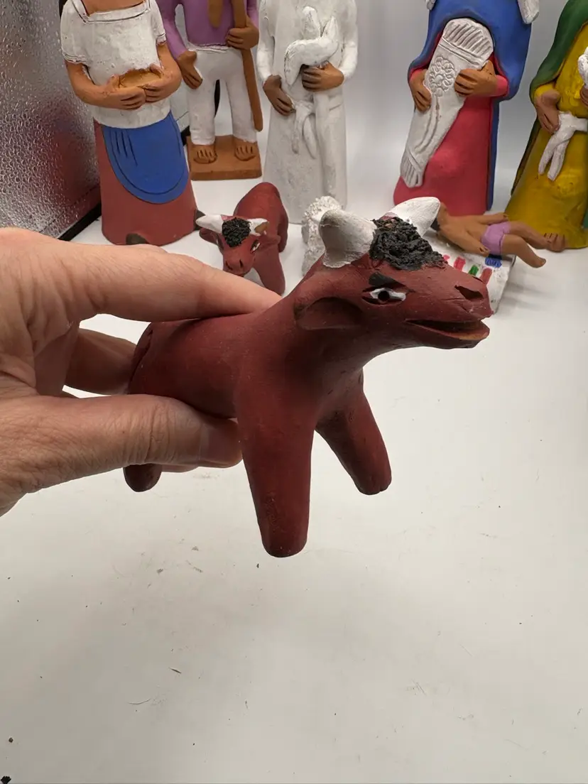 One cow has a chipped horn, one lady is missing what she was holding, baby Jesus needs to be reglued to manger