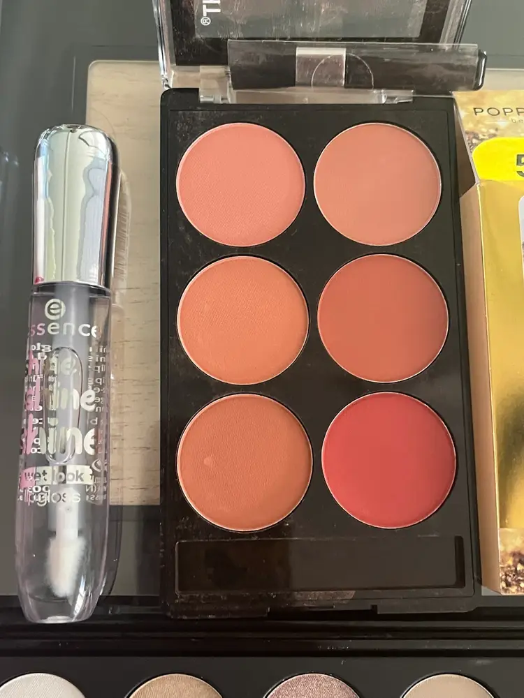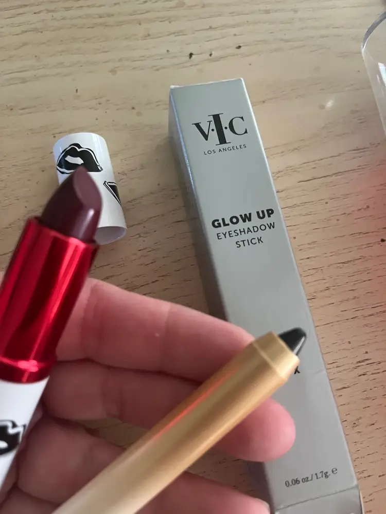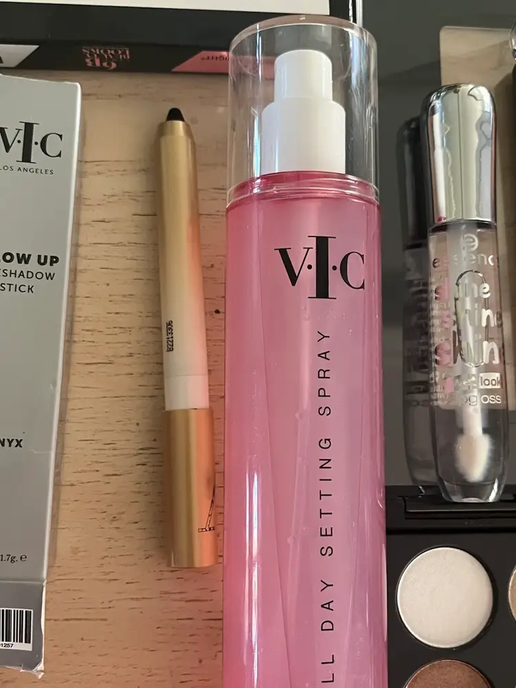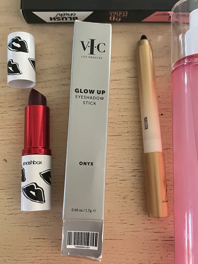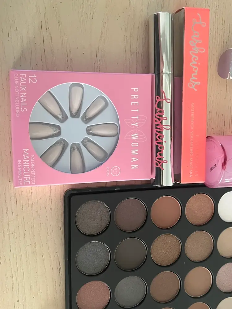 Smashbox full size lip stick VIC Beauty full size eyeshadow palette shimmer and matte 35 shadesVIC Beauty full size all day setting sprayVIC Beauty Full size black eye crayon/shadow6B blush palette 6 shades, with brushPretty Woman 12 faux press on nails Poppy & Ivy 5D 3 pair lashesWet n Wild beauty blenderFull size essence clear lip glossKara Beauty full size black mascara waterproof volumizingOne pair gold tone heart earrings pierced 2 designer sample perfumes